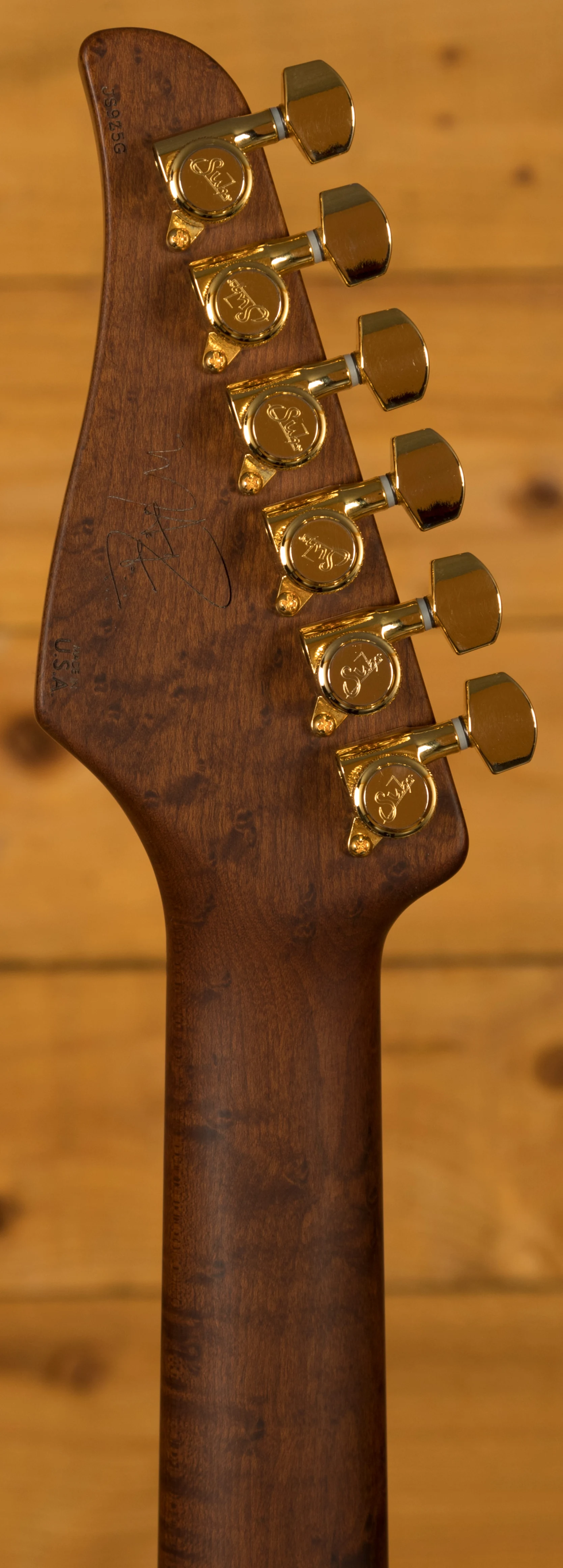 The 3A roasted Birdseye Maple neck and fingerboard features a slick satin finish for a smooth, slick feel. With an even C shape profile, rolled Stainless Steel frets and a 9"-12'' radius, this a substantial but real comfortable guitar.