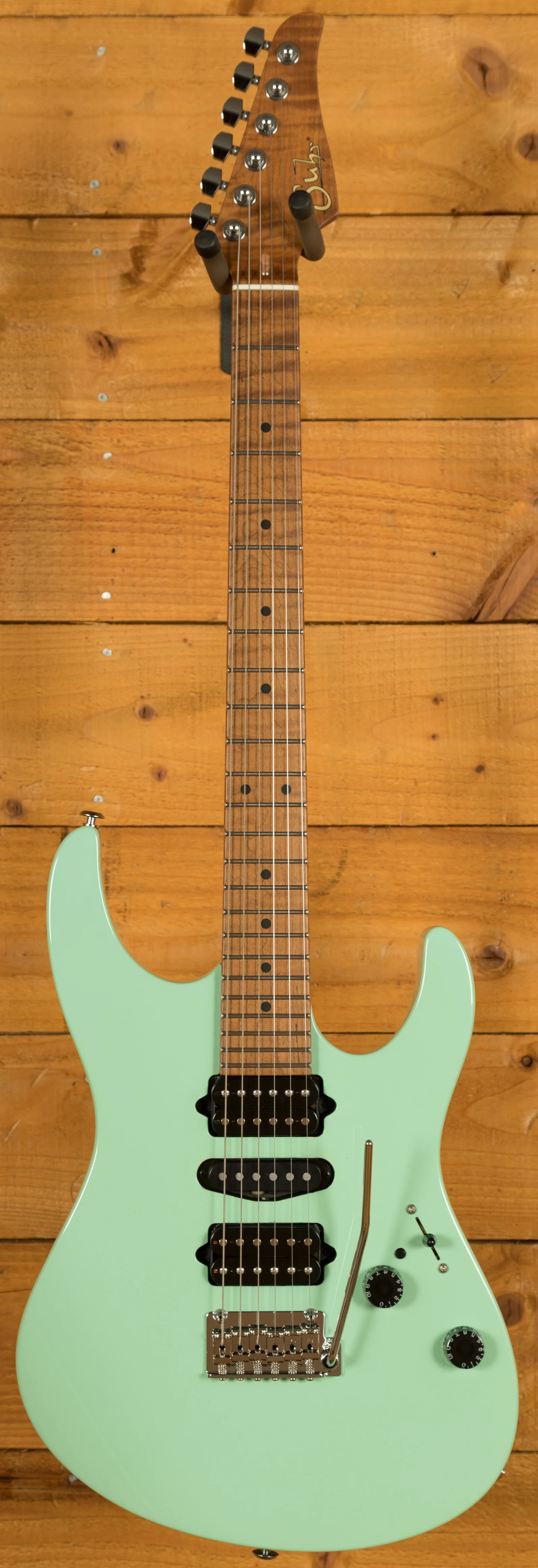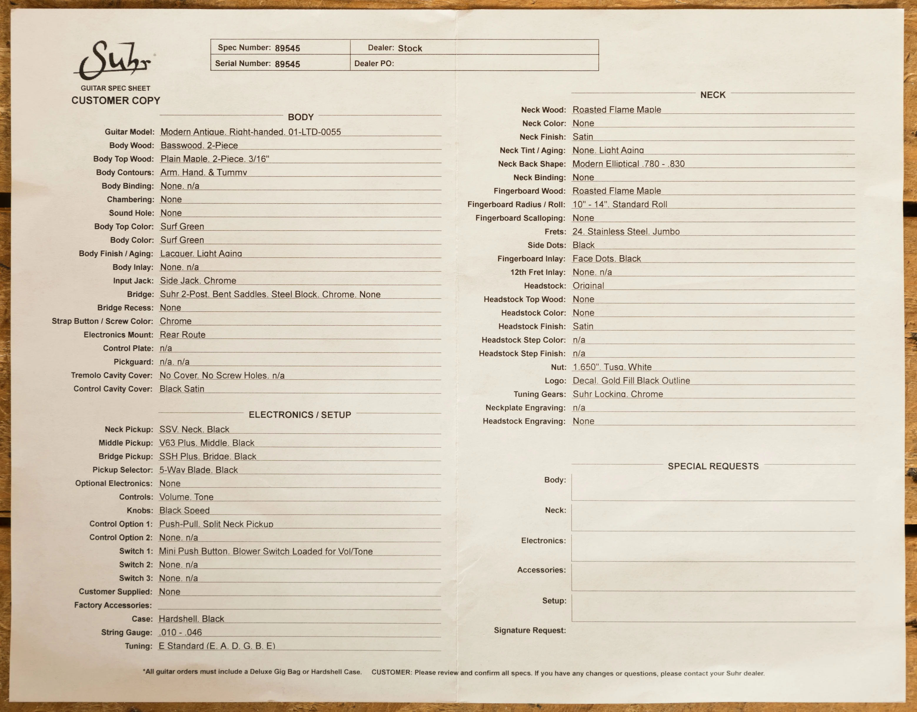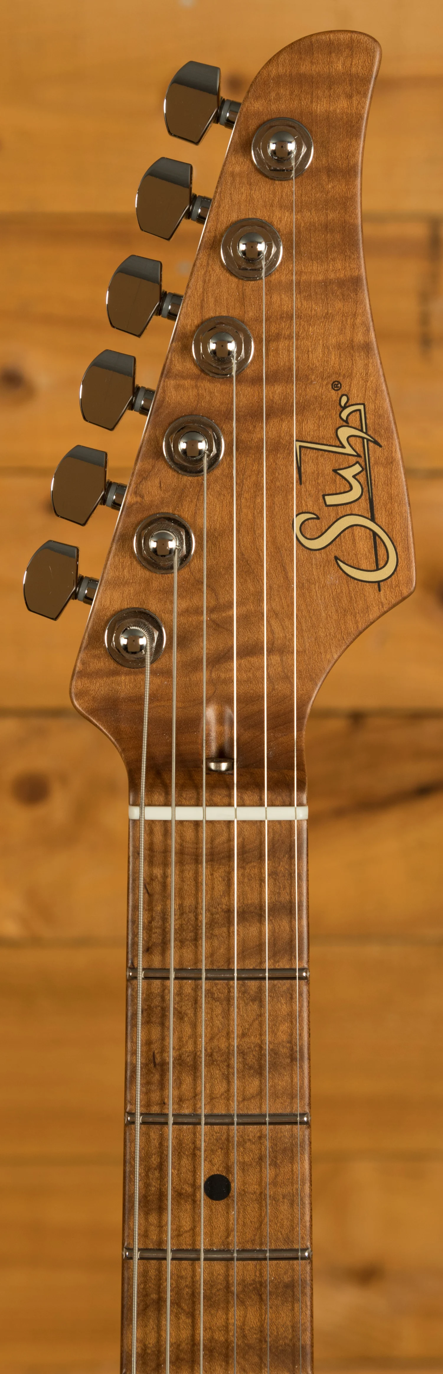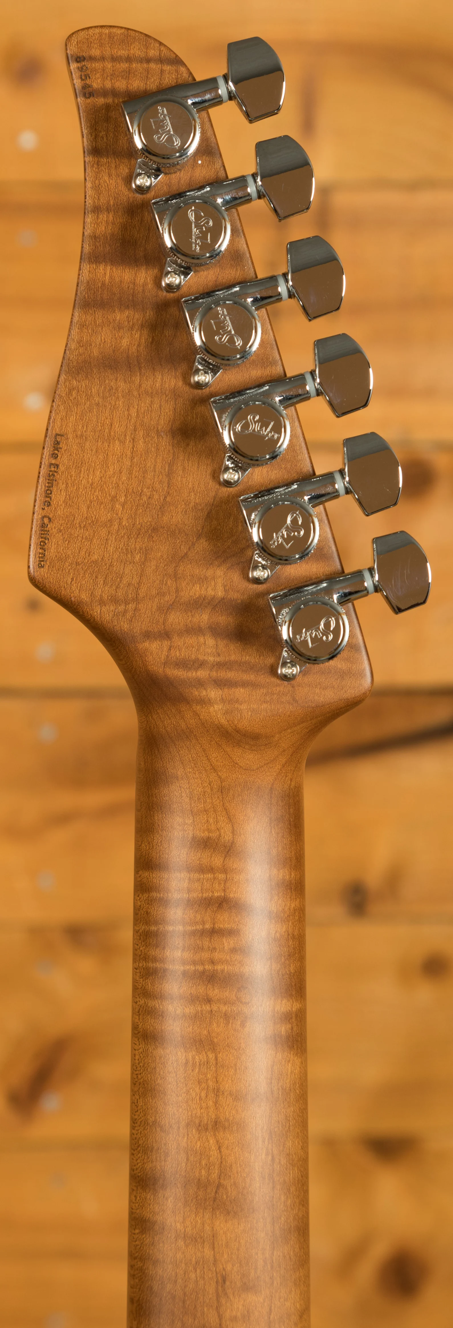 The Suhr Modern Antique Limited Edition is a high-performance guitar that combines premium materials, expert craftsmanship, and versatile features. Built with a basswood body and plain maple top, it offers a balanced tonal foundation with warmth and clarity. The roasted flame maple neck and fingerboard add stability and durability, while also providing a refined look. Its Modern Elliptical neck profile (.780"–.830") and compound 10"-14" radius are designed for comfortable playability, making it suitable for both fast lead work and precise chord playing. With 24 jumbo stainless steel frets and a 1.650" Tusq nut, players benefit from long-lasting fret life, smooth bends, and accurate intonation.