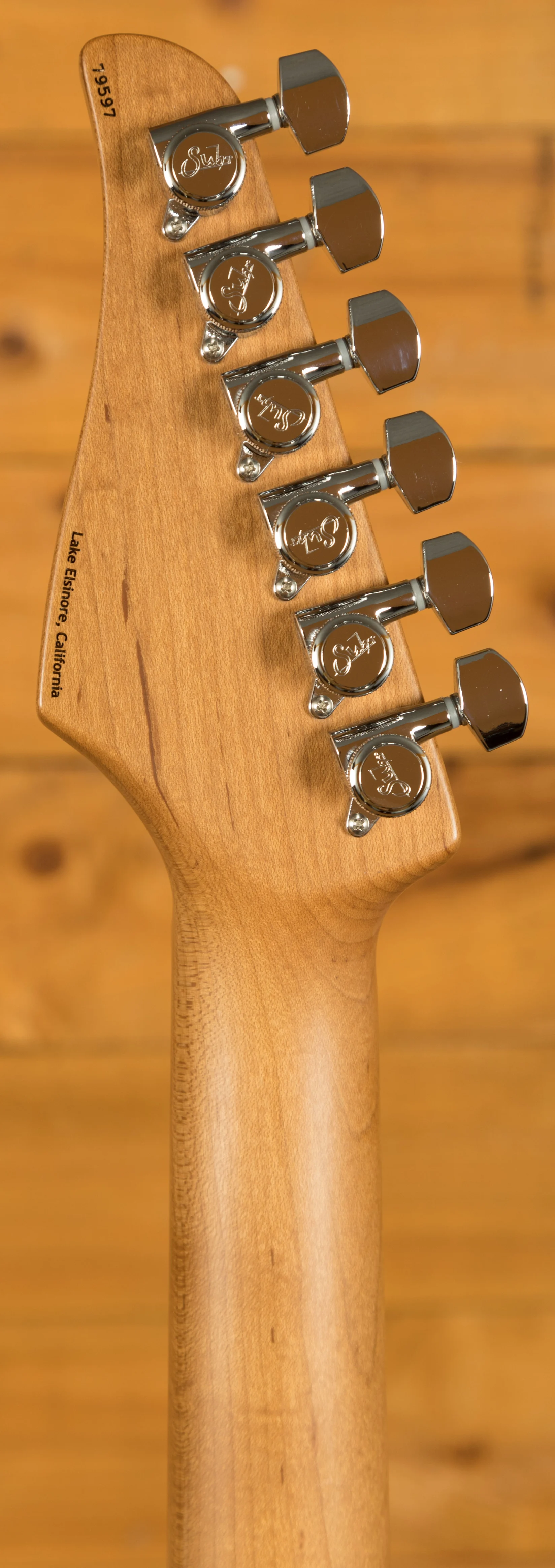 The Modern Plus is equipped with Suhr's Modern Elliptical neck profile with rolled edges, Maple fingerboard and a 10"- 14" radius it offers an extremely comfortable shape. The Roasted Maple neck is finished in satin, which provides the smooth feel of natural wood as well as protection from moisture. The 24 Jumbo stainless steel frets offer great string bending potential and long lasting playability while the sculpted heel allows for great access right up the neck.