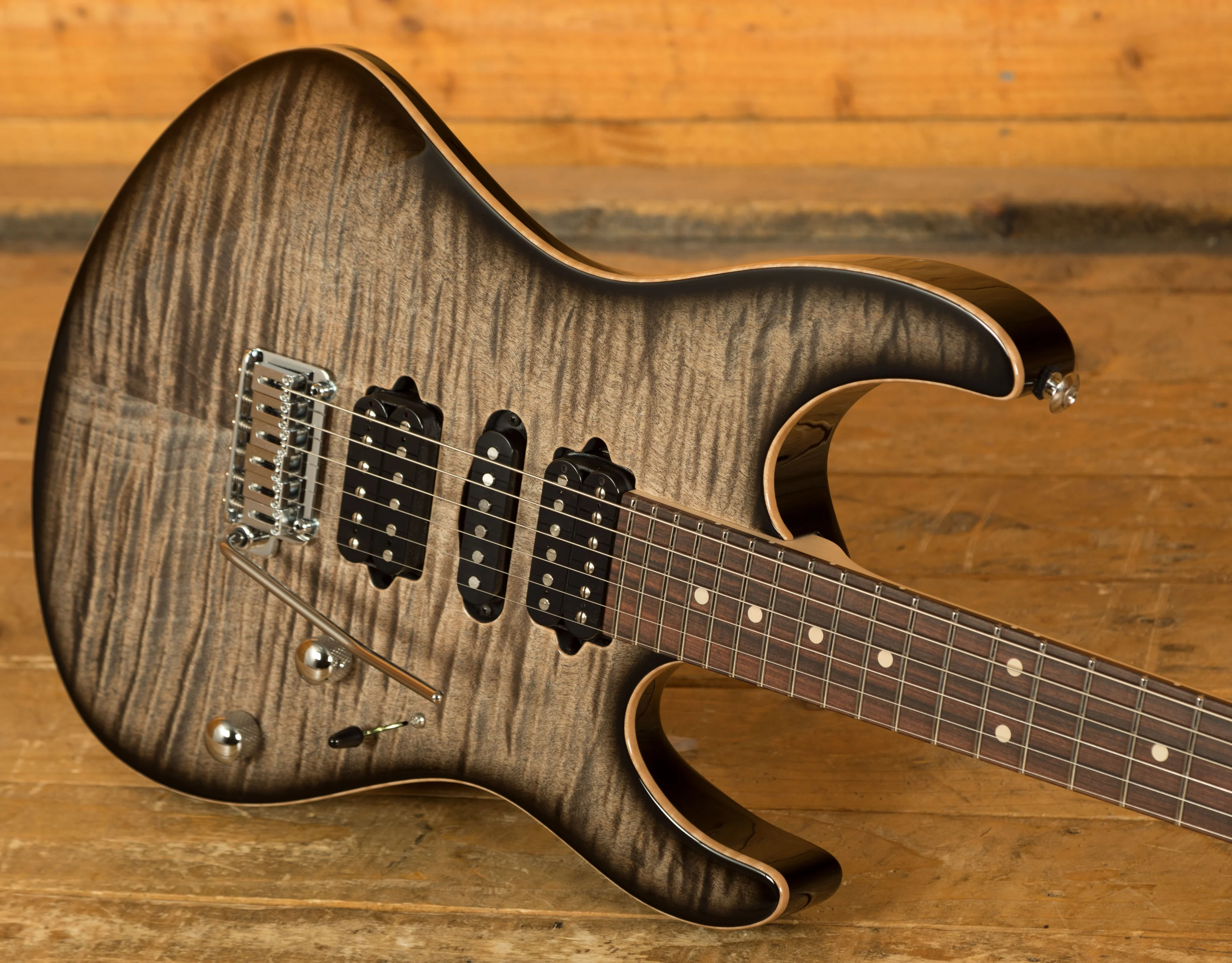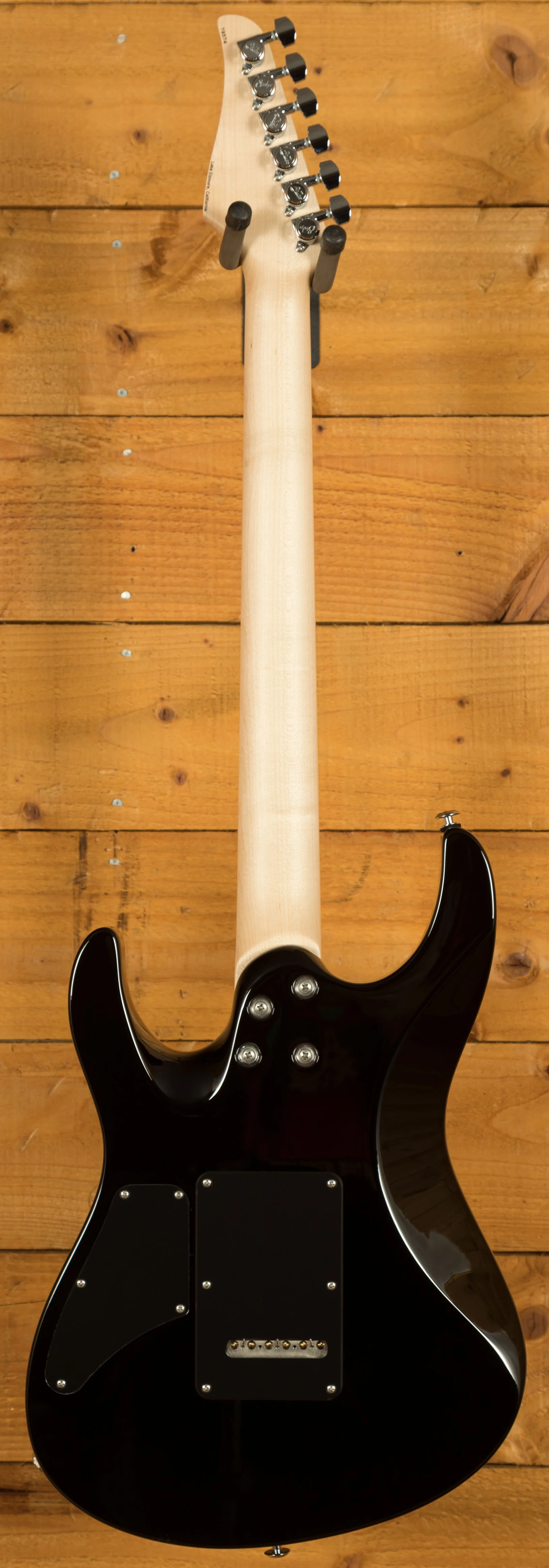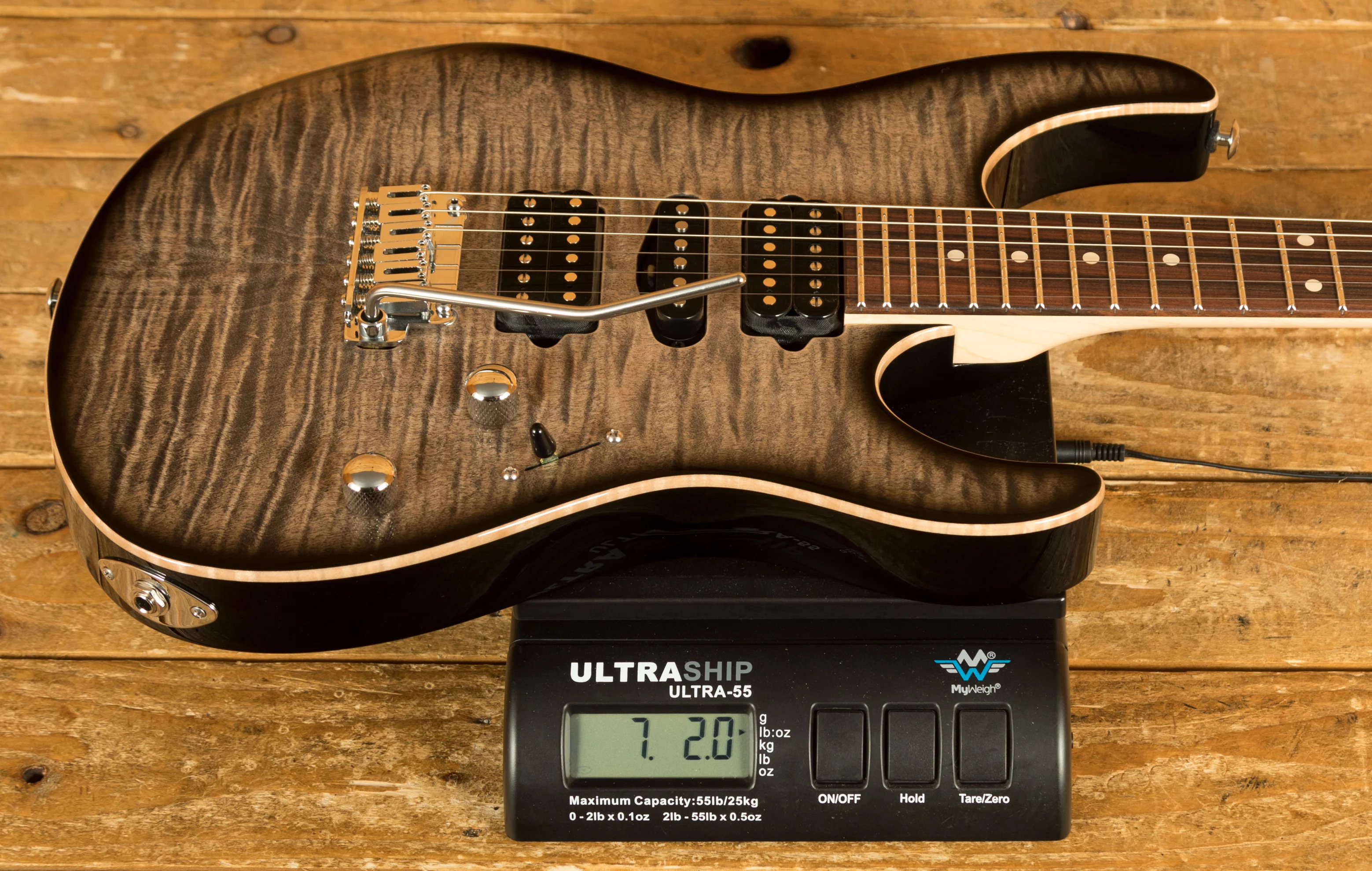 The Modern body shape, with its asymmetrical design, perfectly balances the extended 24-fret neck. Crafted from Basswood and adorned with a Flame Maple top, this guitar delivers a fat, well-balanced tone without harsh edges. The meticulous finishing process, with the thinnest layers of finish applied, allows the wood to resonate freely while offering unmatched protection. The scraped binding highlights the natural maple edge, adding elegance to the overall design.