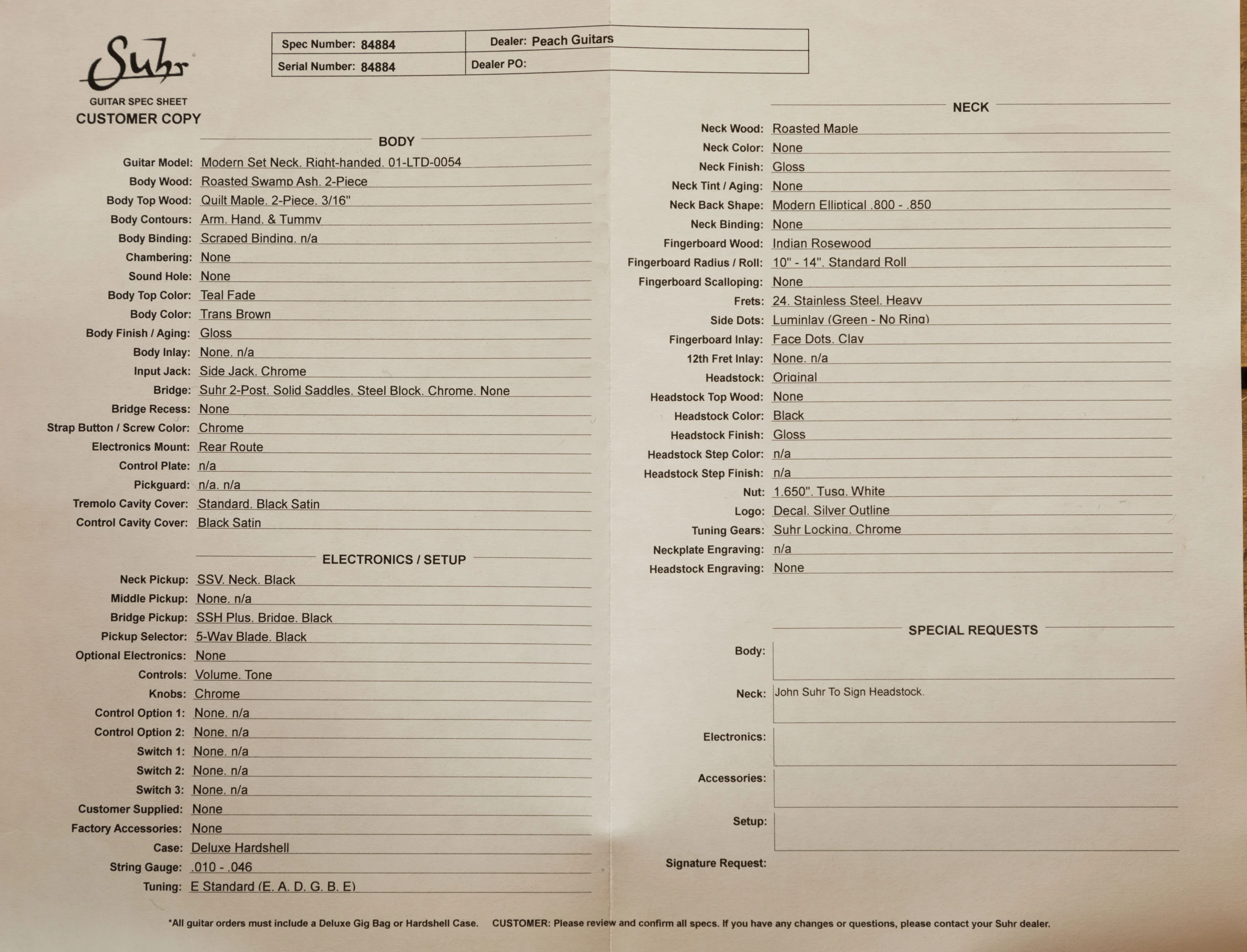 The neck is constructed from Roasted Maple, ensuring superior stability and resistance to environmental changes. It features Suhr's Modern Elliptical profile for a comfortable and fast playing experience. The Rosewood fingerboard adds warmth to the guitar's tone, while the 10"-14" compound radius allows for smooth chording near the nut and effortless bends higher up the neck. The heavy stainless-steel frets ensure long-lasting durability and precision, while the 1.650" Tusq nut provides consistent tuning stability.