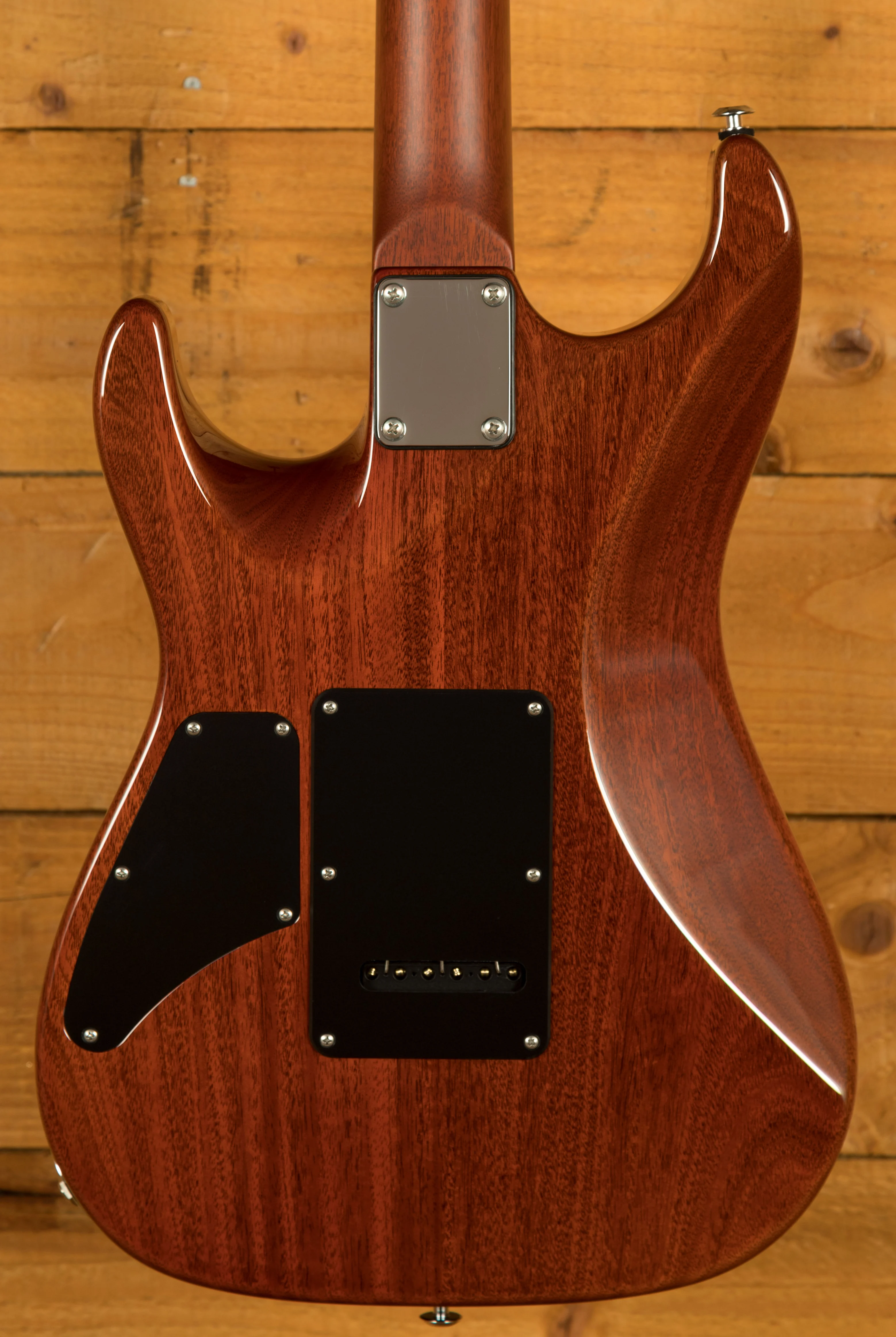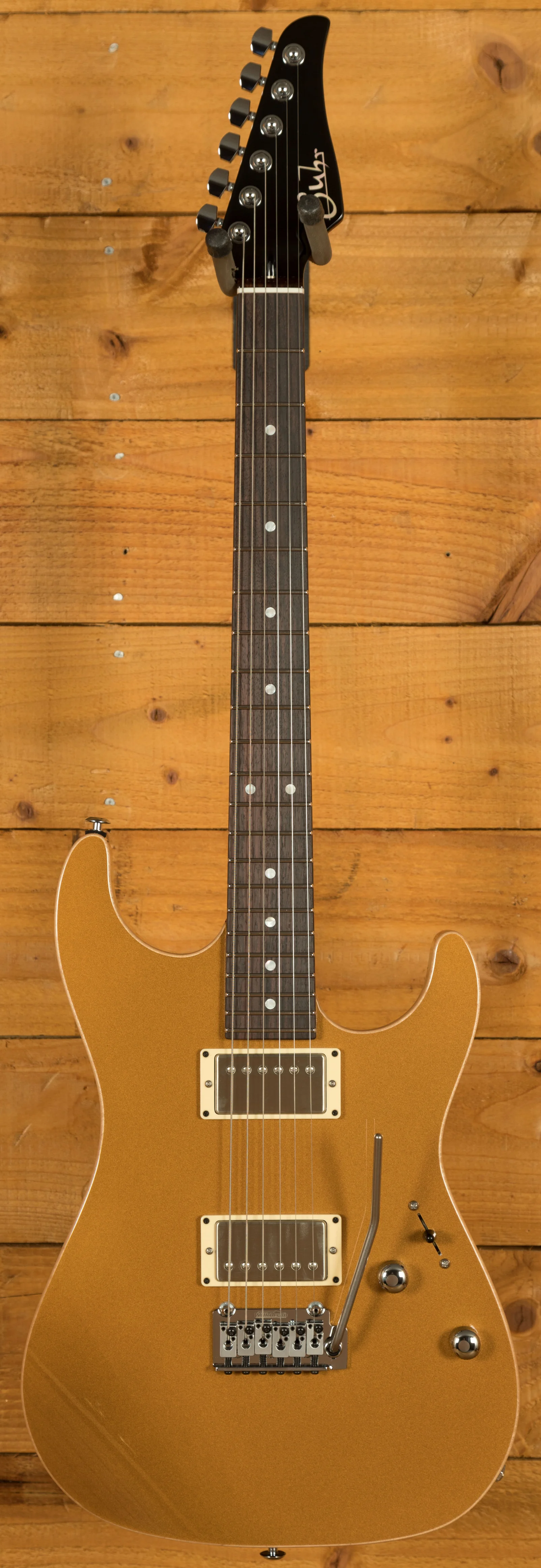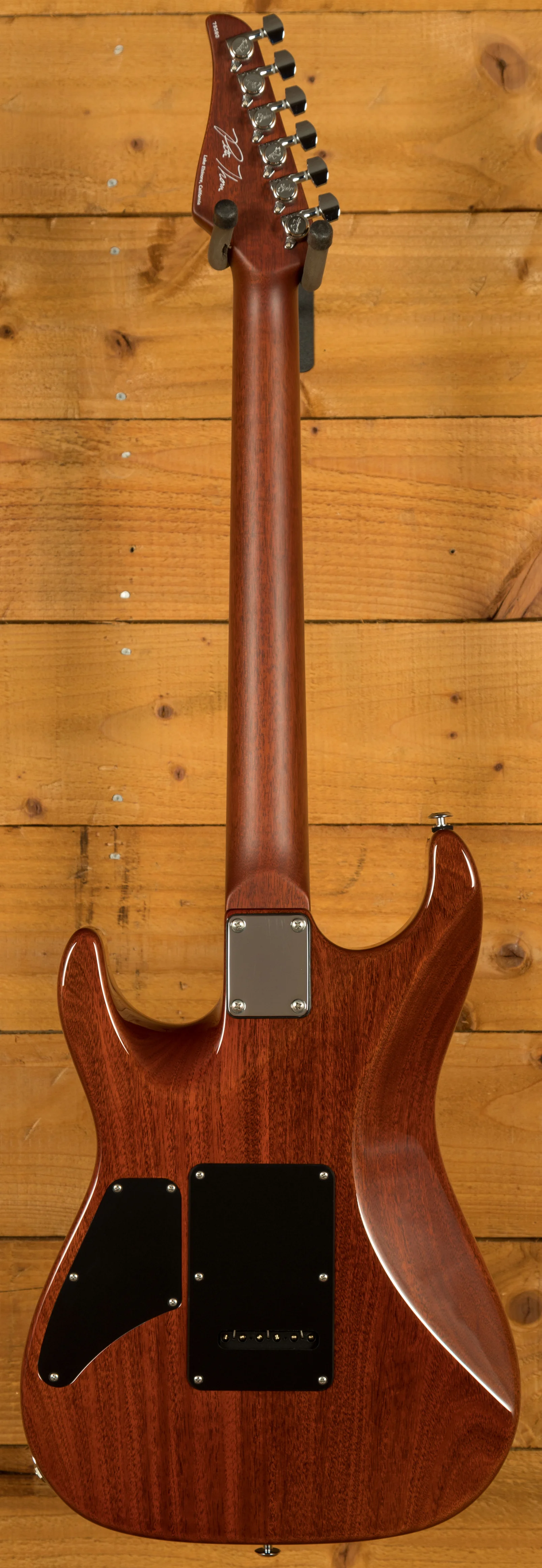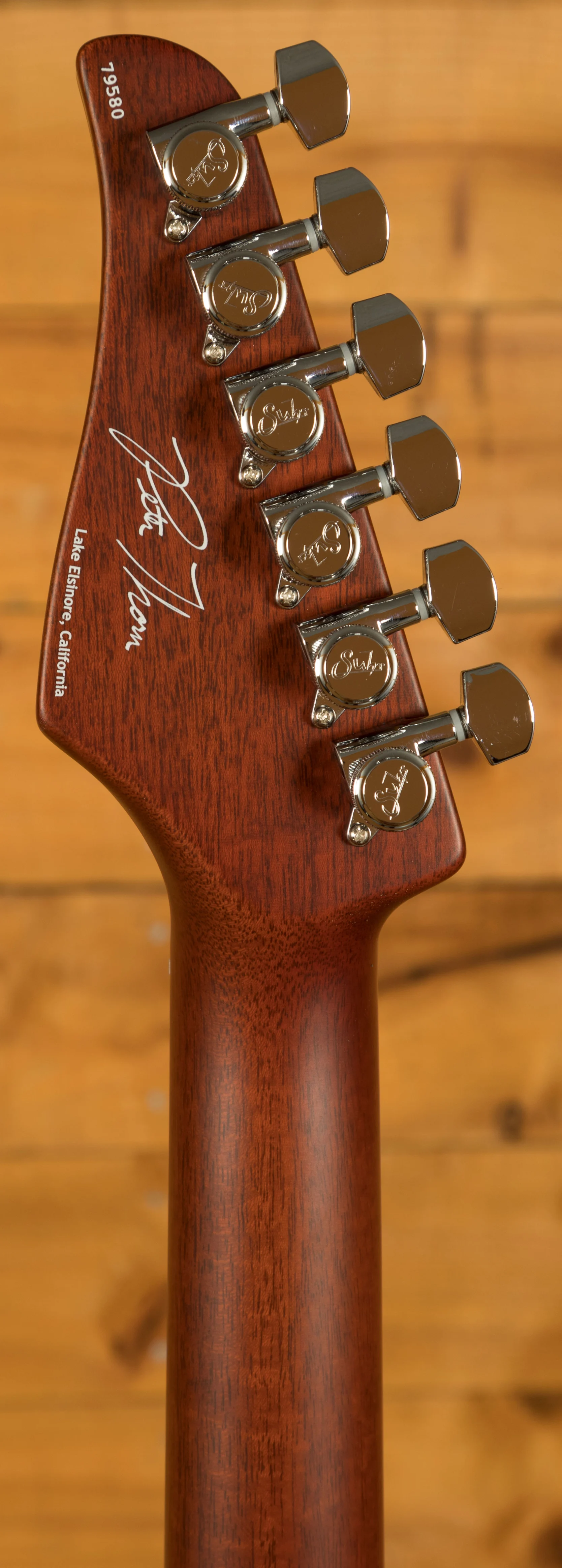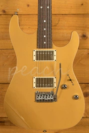 With a Mahogany body finished in a lush Gold, this guitar feels robust but perfectly balanced, the Maple top completing this tone wood dream team. The Mahogany neck has a satin finish and with its Indian Rosewood fretboard and 10"-14" radius, it's real comfortable and smooth underhand. The even C profile allows for a perfect feel right up the neck and the laser engraved Pete Thorn signature inlay is a nice touch. Incredible tuning stability comes courtesy of a Wilkinson WVS 130 tremolo bridge and Suhr locking tuners, precise and responsive, they are a great feature.
