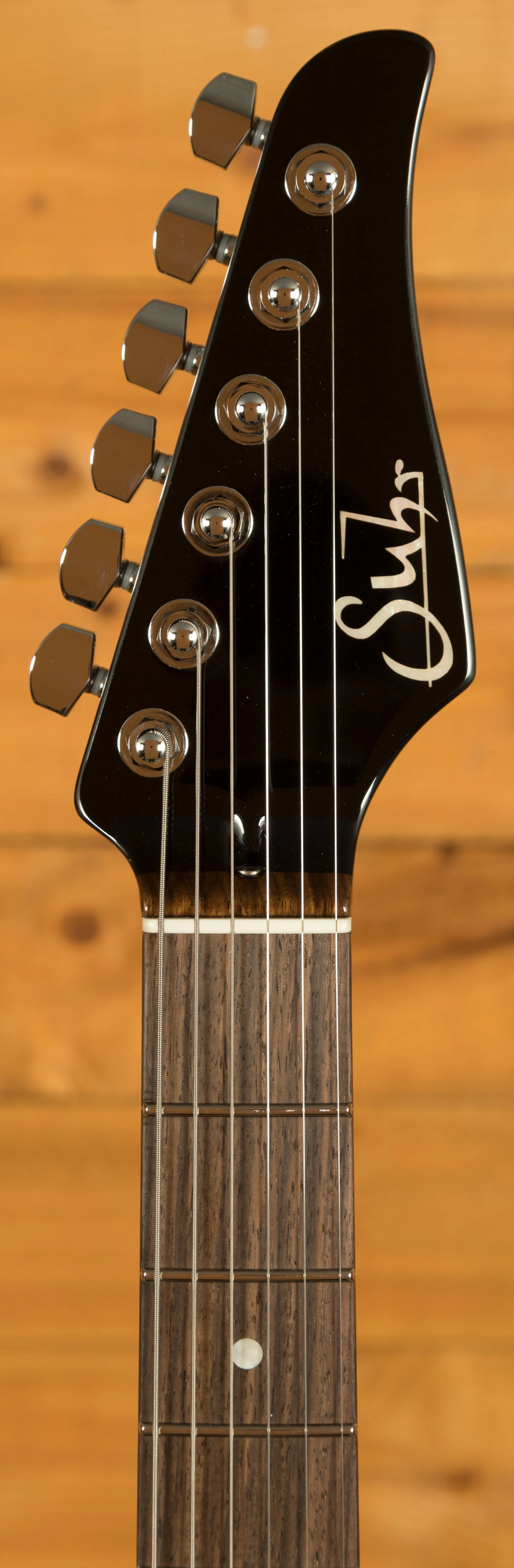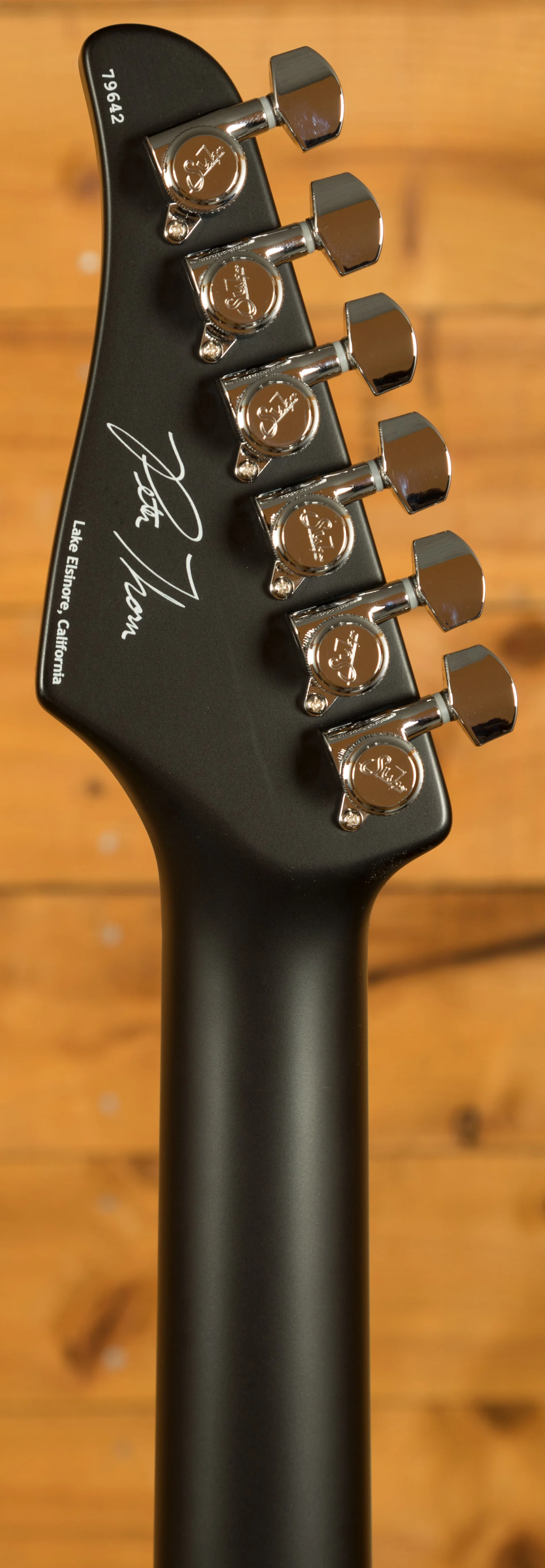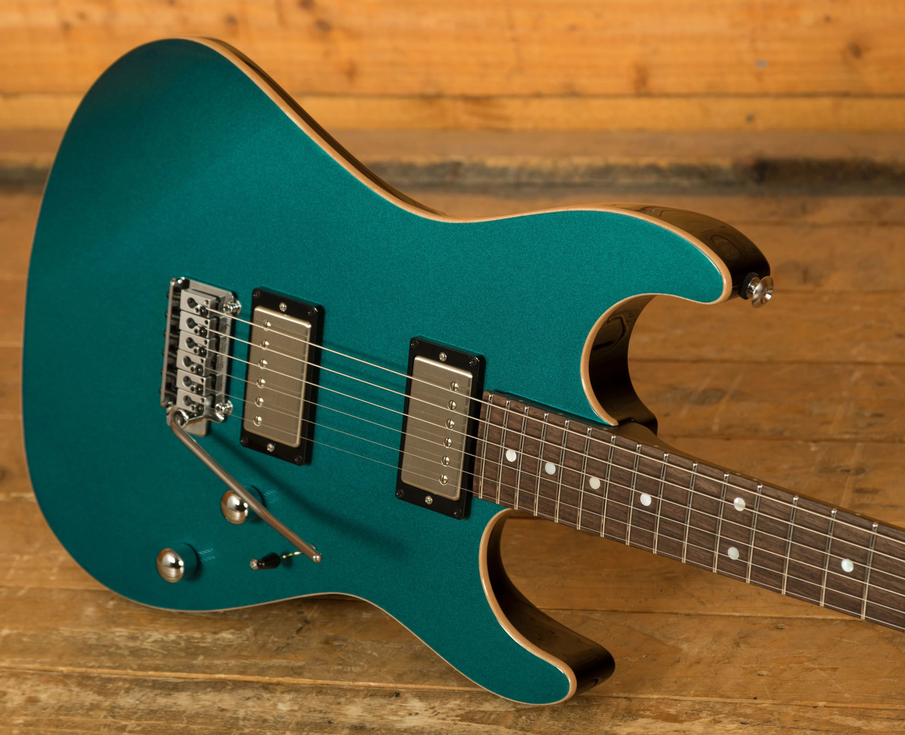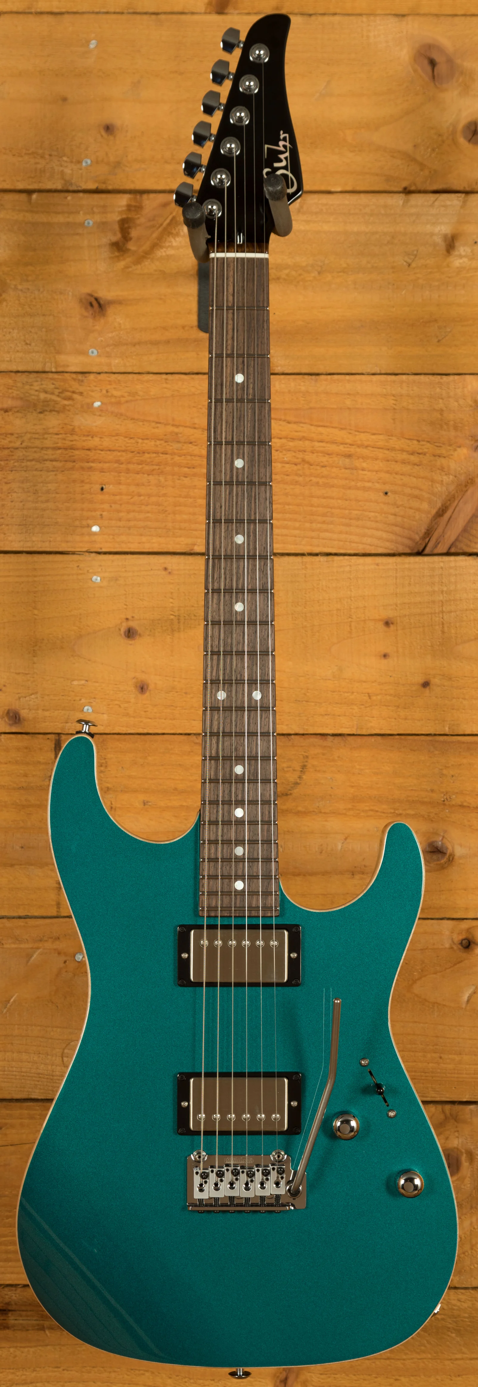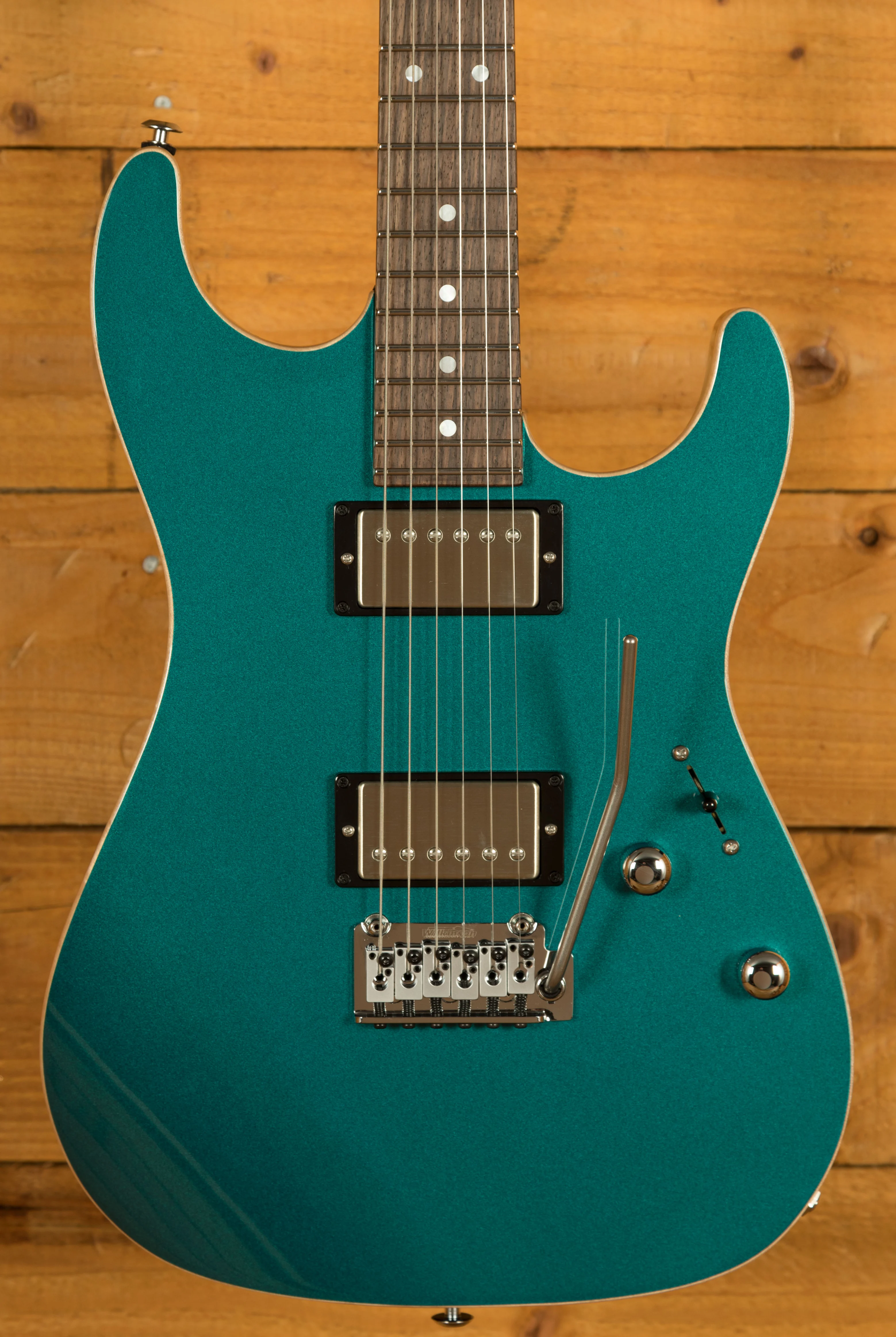 With a Mahogany body finished in a lush Ocean Turquoise Metallic, this guitar feels robust but perfectly balanced, the Maple top completing this tone wood dream team. The Mahogany neck has a satin finish and with its Indian Rosewood fretboard and 10"-14" radius, it's real comfortable and smooth underhand. The even C profile allows for a perfect feel right up the neck and the laser engraved Pete Thorn signature inlay is a nice touch. Incredible tuning stability comes courtesy of a Wilkinson WVS 130 tremolo bridge and Suhr locking tuners, precise and responsive, they are a great feature.