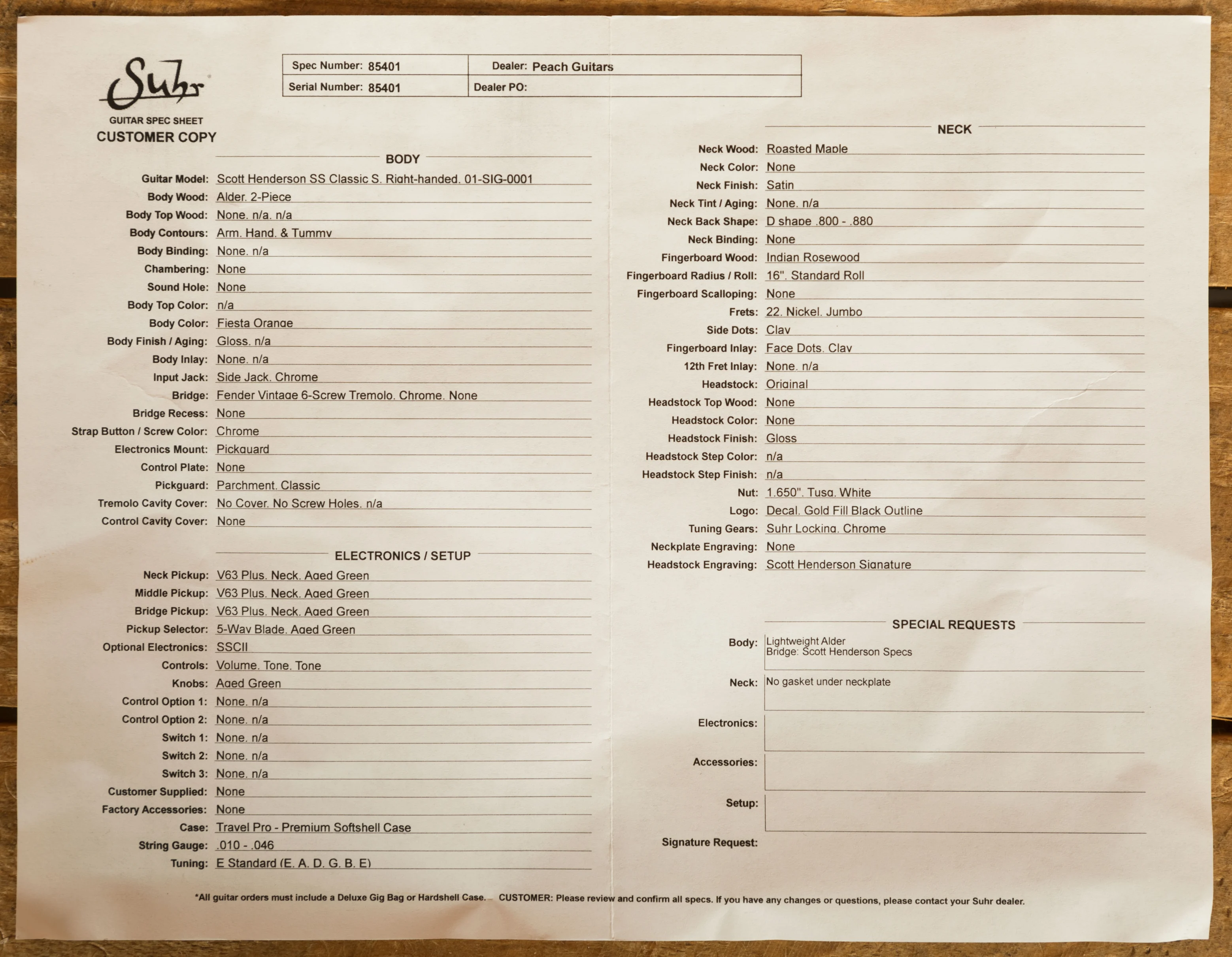 With Suhr locking tuners, a 1.650" Tusq nut, and a modified Fender Six Screw bridge with custom made steel block and shortened steel trem arm, this really is one of the finest strat-style guitars around.