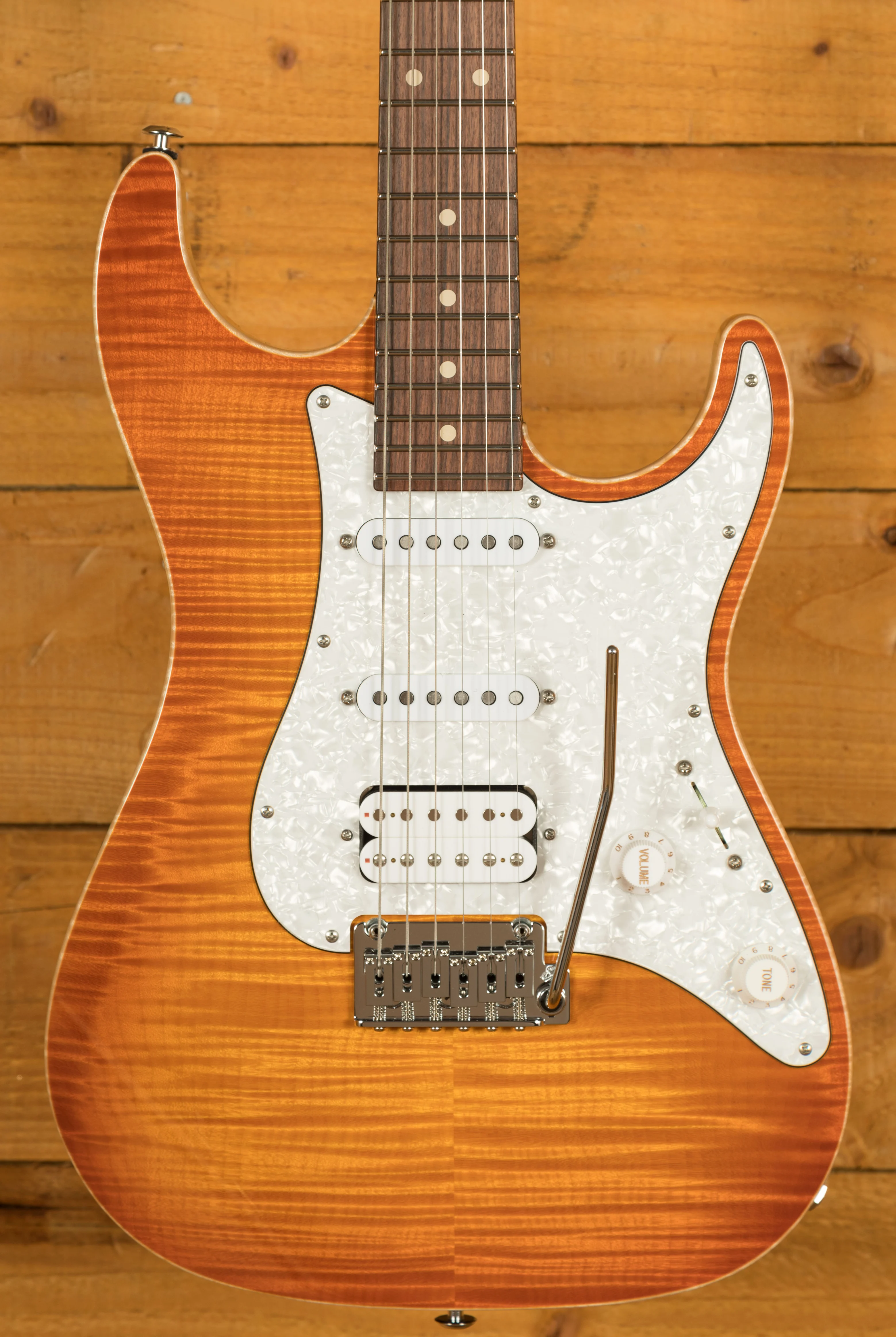 With a Basswood body and a lush Flame Maple top, its tonally superior, light weight and beautifully poised for action. With arm, hand and tummy contours this guitar is supremely comfortable, it offers great access right up the neck and handles just about any playing style without breaking a sweat.