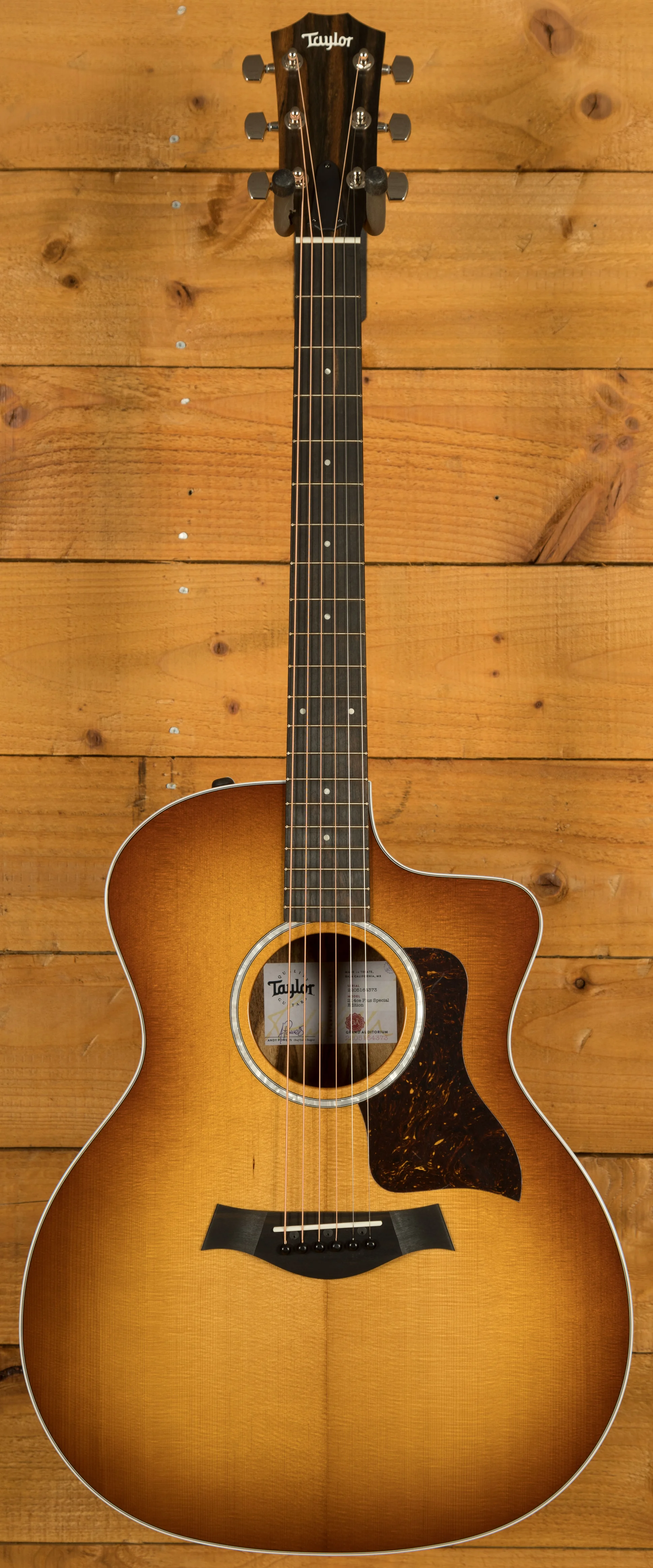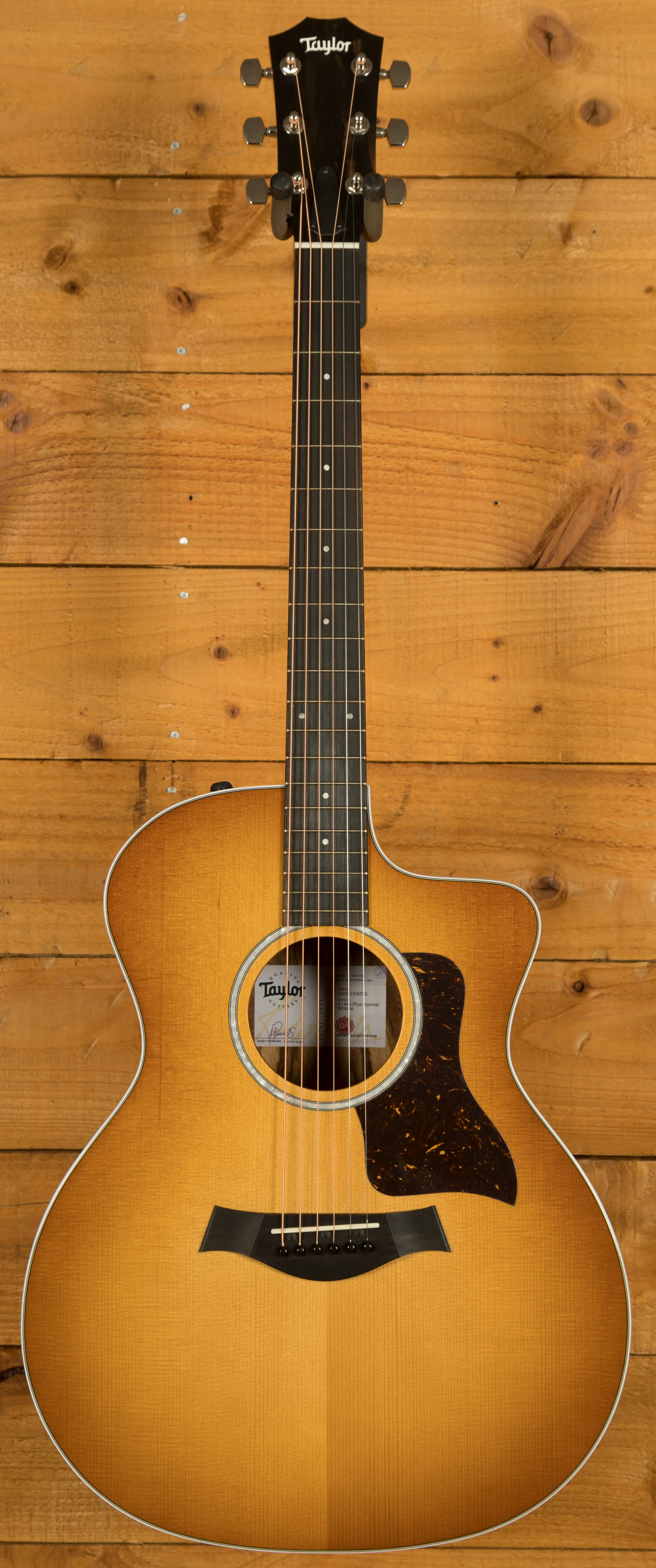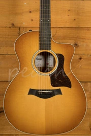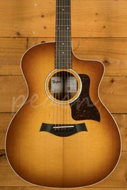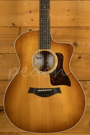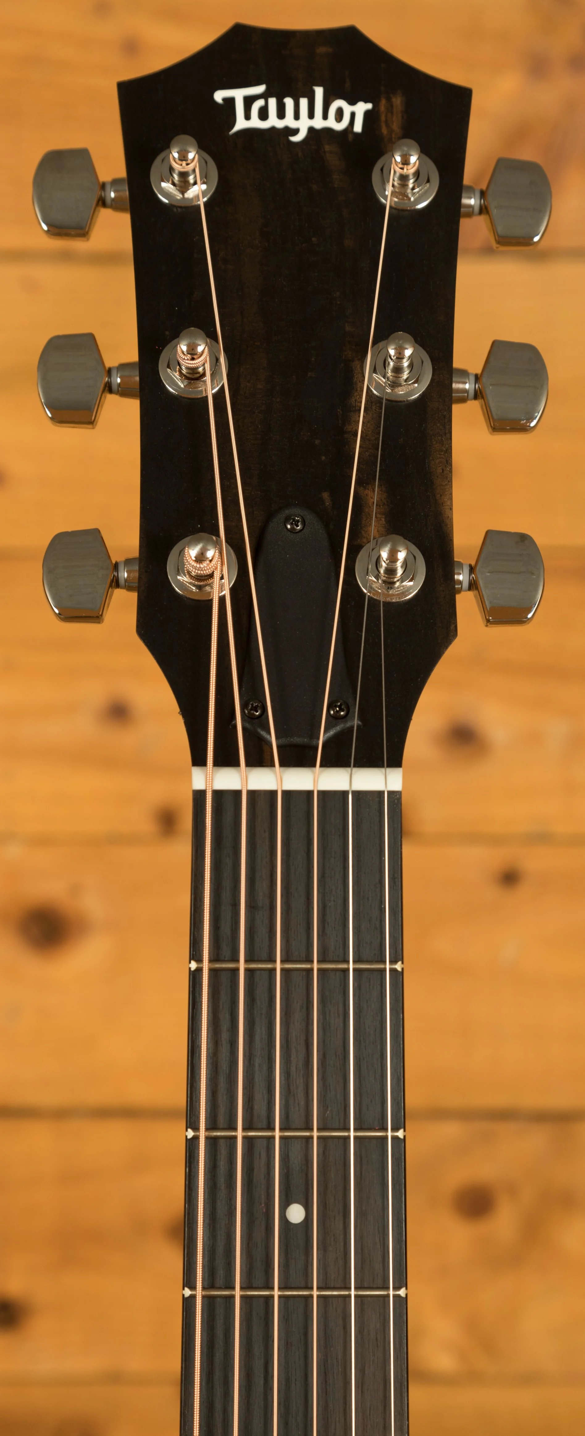Sporting a beautiful set of layered African ziricote back and sides, this special-edition Grand Auditorium acoustic-electric serves up a clear, balanced voice to match its striking visual character. A top of solid torrefied Sitka spruce yields rich projection with a touch of aged-in warmth and depth thanks to Taylor's special roasting process, while our tone-enhancing interior bracing delivers greater volume, longer sustain and a boost in the low-end frequencies. It adds up to a highly versatile sound complemented by a slim neck profile with a slightly narrower-than-standard 1-11/16-inch nut width and body contours that ensure a comfortable feel for every type of player. Other visual details include white binding, a single-ring faux-pearl rosette, 4mm dot fretboard inlays, a faux-tortoiseshell pickguard, and a shaded edgeburst treatment with a full-body gloss finish. It ships with onboard ES2 electronics for clean plugged-in tone and a hardshell case for safe storage and transportation.
