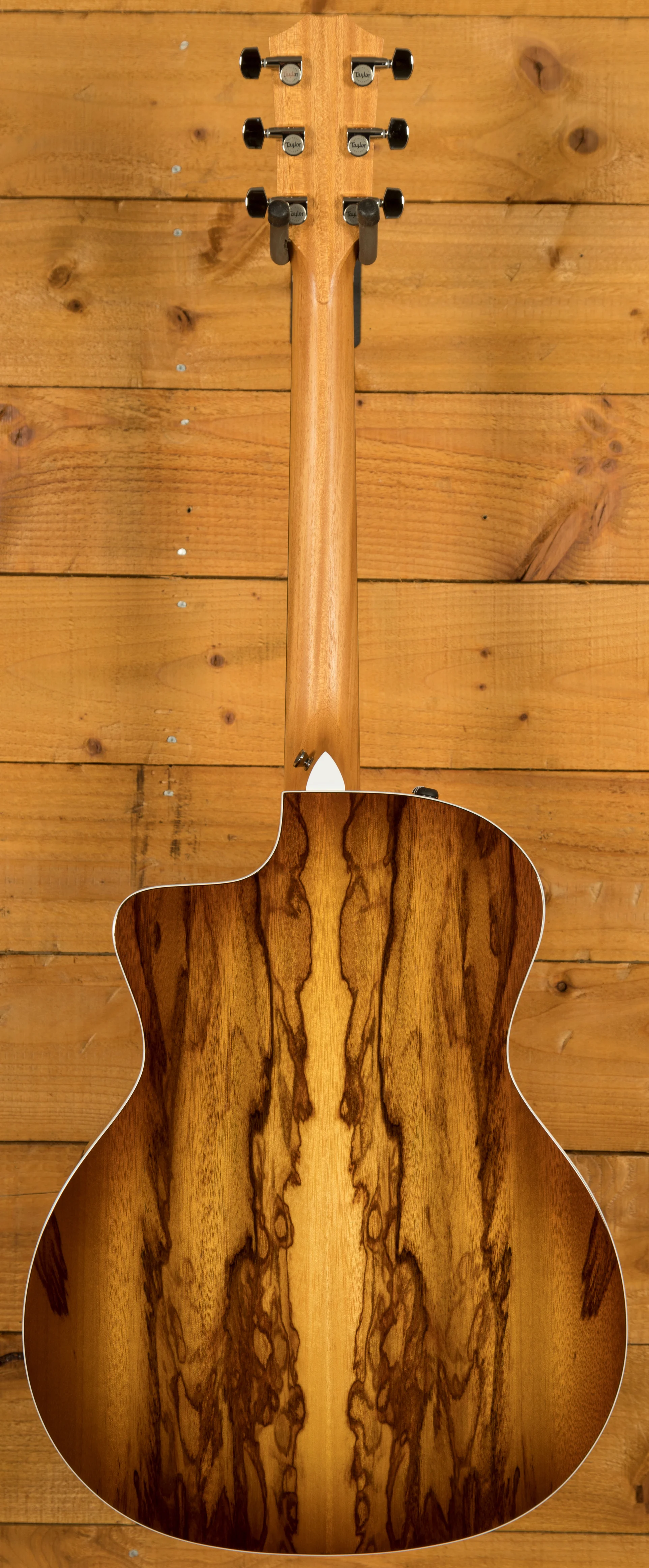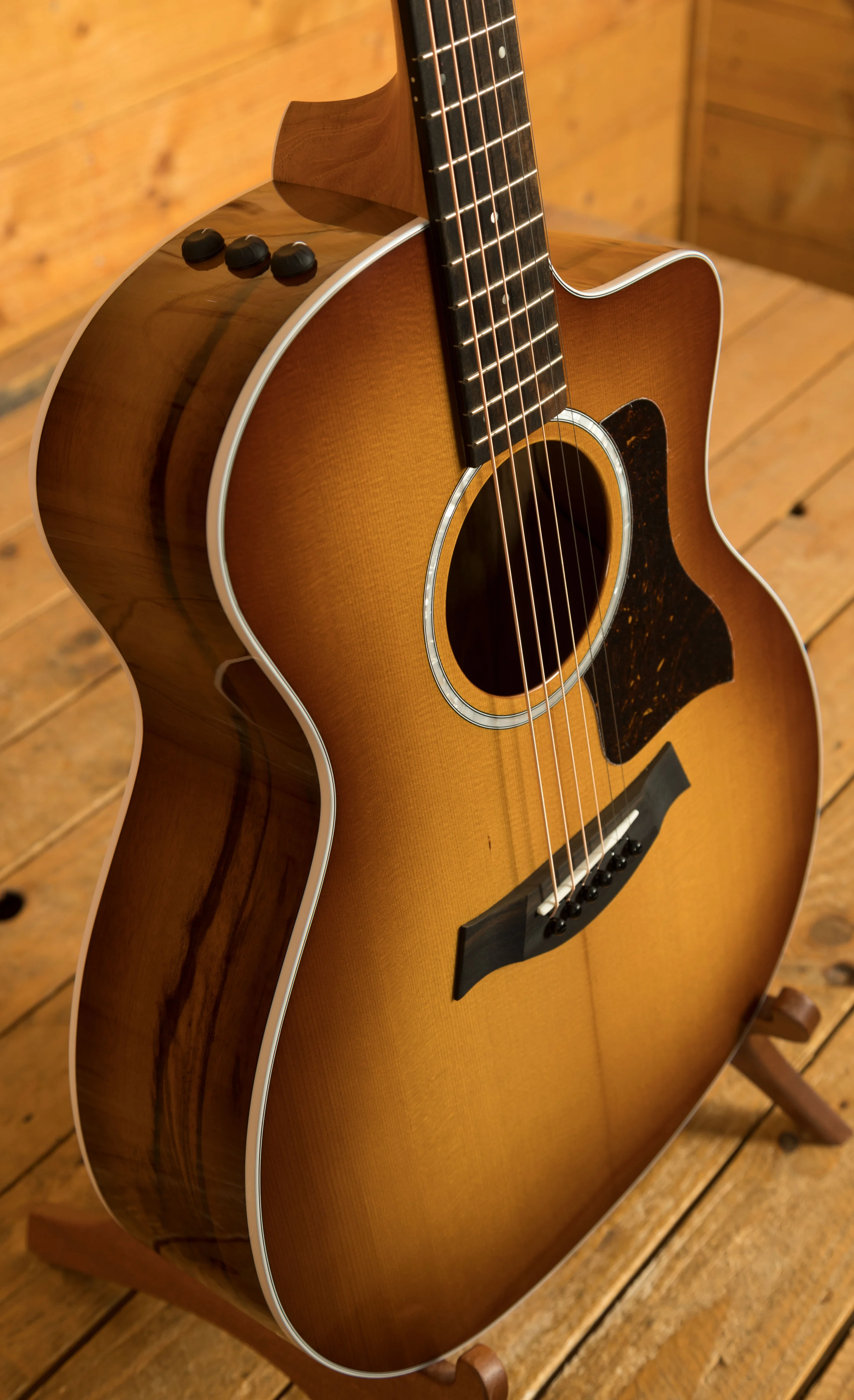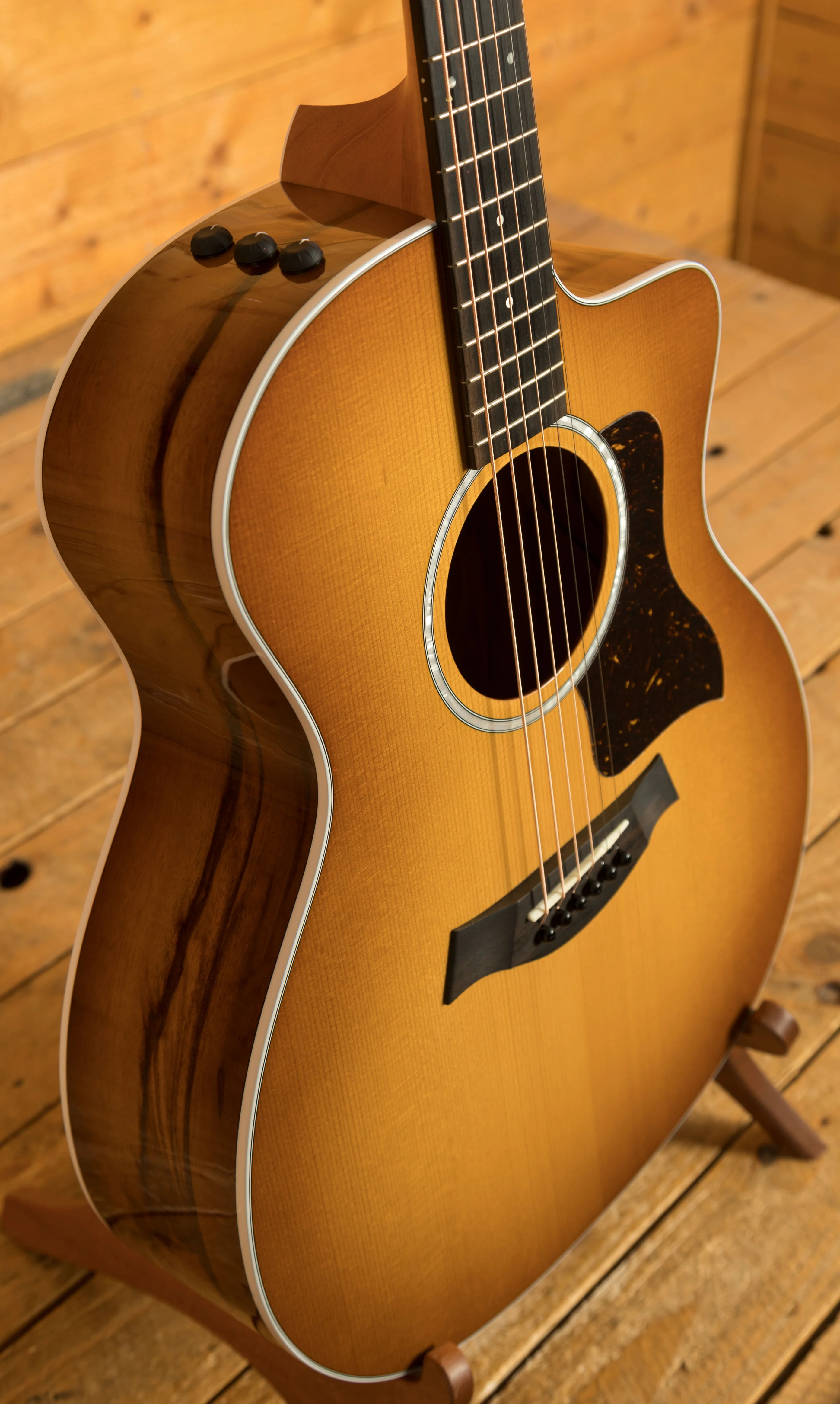 Sporting a beautiful set of layered African ziricote back and sides, this special-edition Grand Auditorium acoustic-electric serves up a clear, balanced voice to match its striking visual character. A top of solid torrefied Sitka spruce yields rich projection with a touch of aged-in warmth and depth thanks to Taylor's special roasting process, while our tone-enhancing interior bracing delivers greater volume, longer sustain and a boost in the low-end frequencies. It adds up to a highly versatile sound complemented by a slim neck profile with a slightly narrower-than-standard 1-11/16-inch nut width and body contours that ensure a comfortable feel for every type of player. Other visual details include white binding, a single-ring faux-pearl rosette, 4mm dot fretboard inlays, a faux-tortoiseshell pickguard, and a shaded edgeburst treatment with a full-body gloss finish. It ships with onboard ES2 electronics for clean plugged-in tone and a hardshell case for safe storage and transportation.