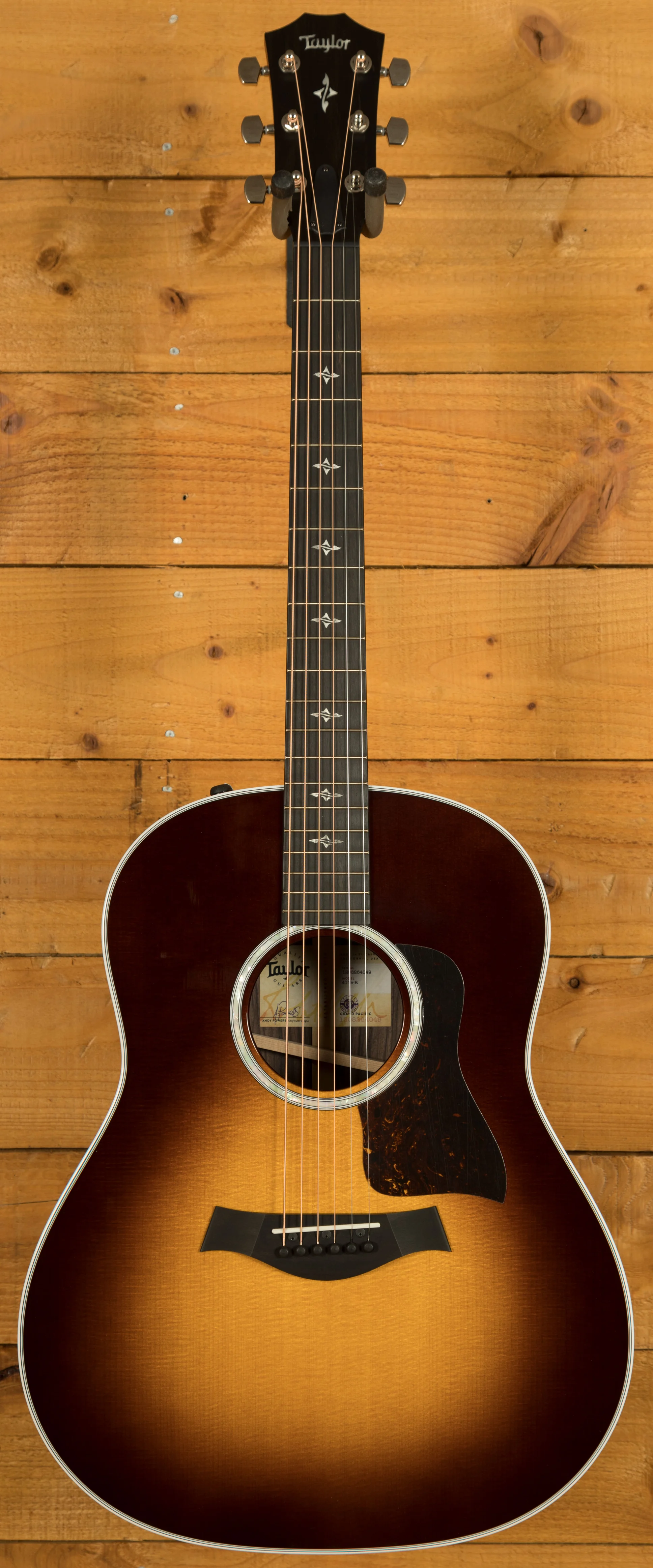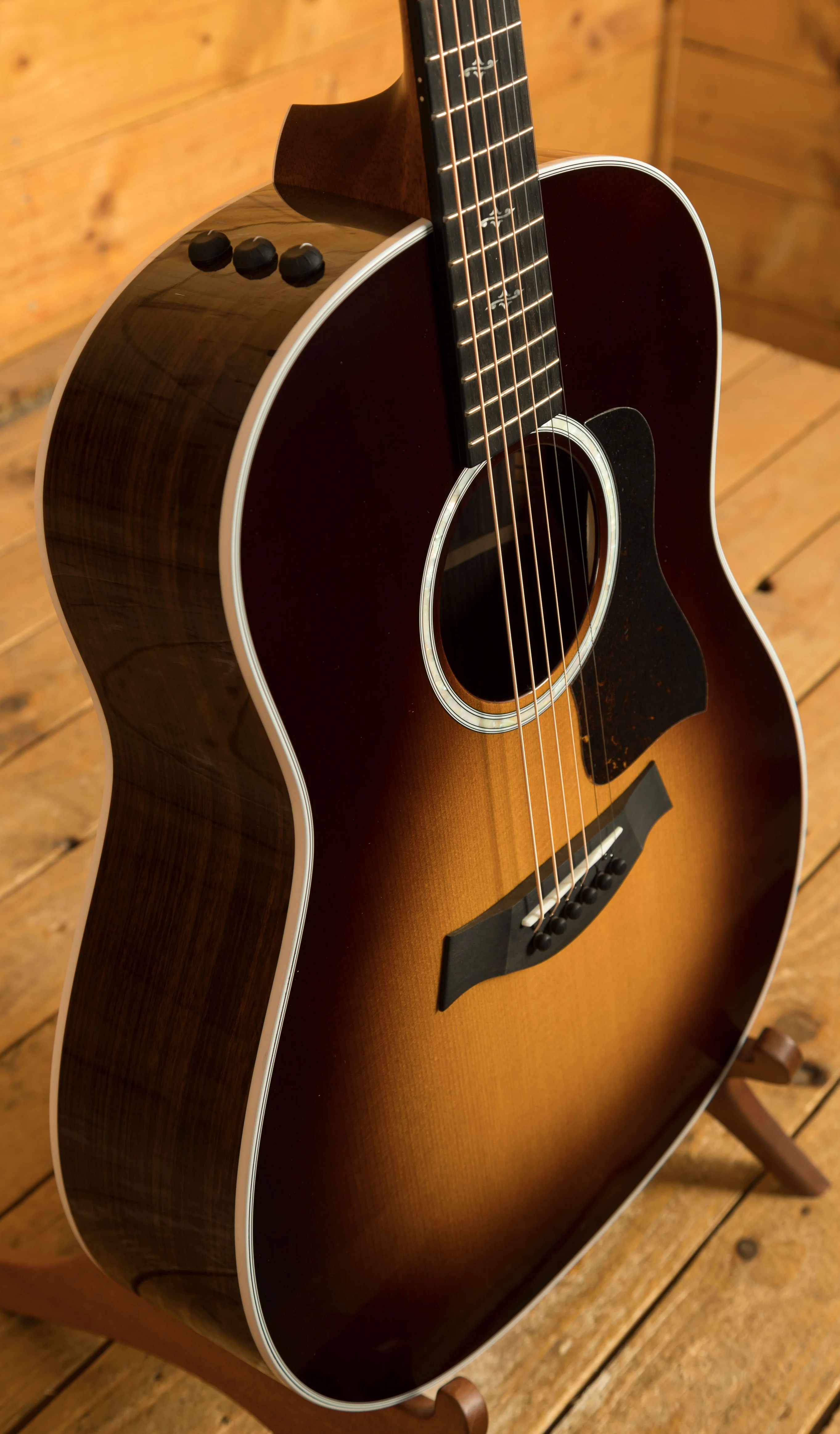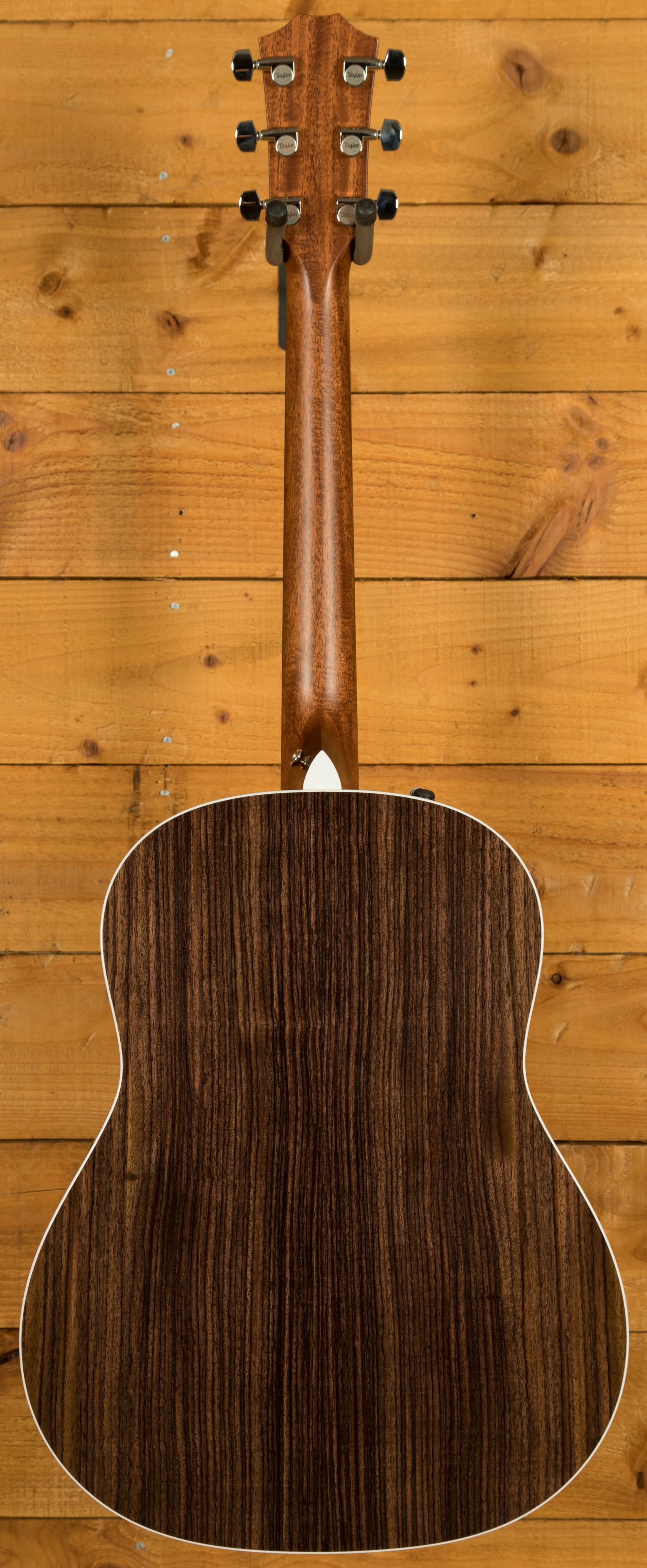 With its warm sonic character and lush, blooming overtones, the rosewood/spruce tonewood combination is the perfect match for the Grand Pacific dreadnought body shape. In the 417e, that pairing serves up a seasoned, blended response with clear low-end power, pristine trebles and a slightly scooped midrange - perfect for everything from songwriting to ensemble play to recording. Taylor's V-Class bracing design adds more volume and longer sustain, and the built-in ES2 electronics ensure clear, authentic tone whenever you need to plug in. Aesthetic details include a sunburst top finish and new Finial inlays. The 417e ships in a deluxe hardshell case.