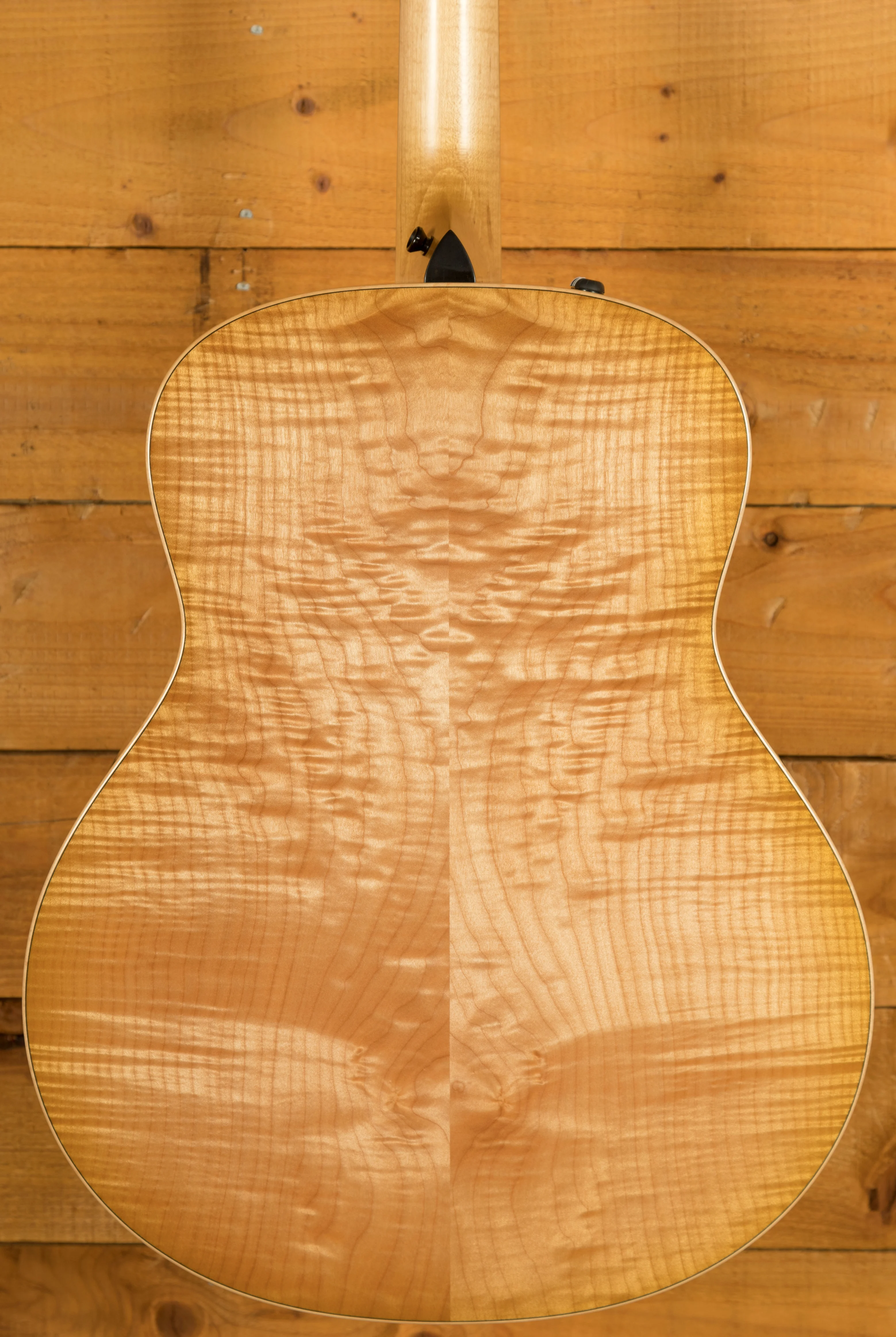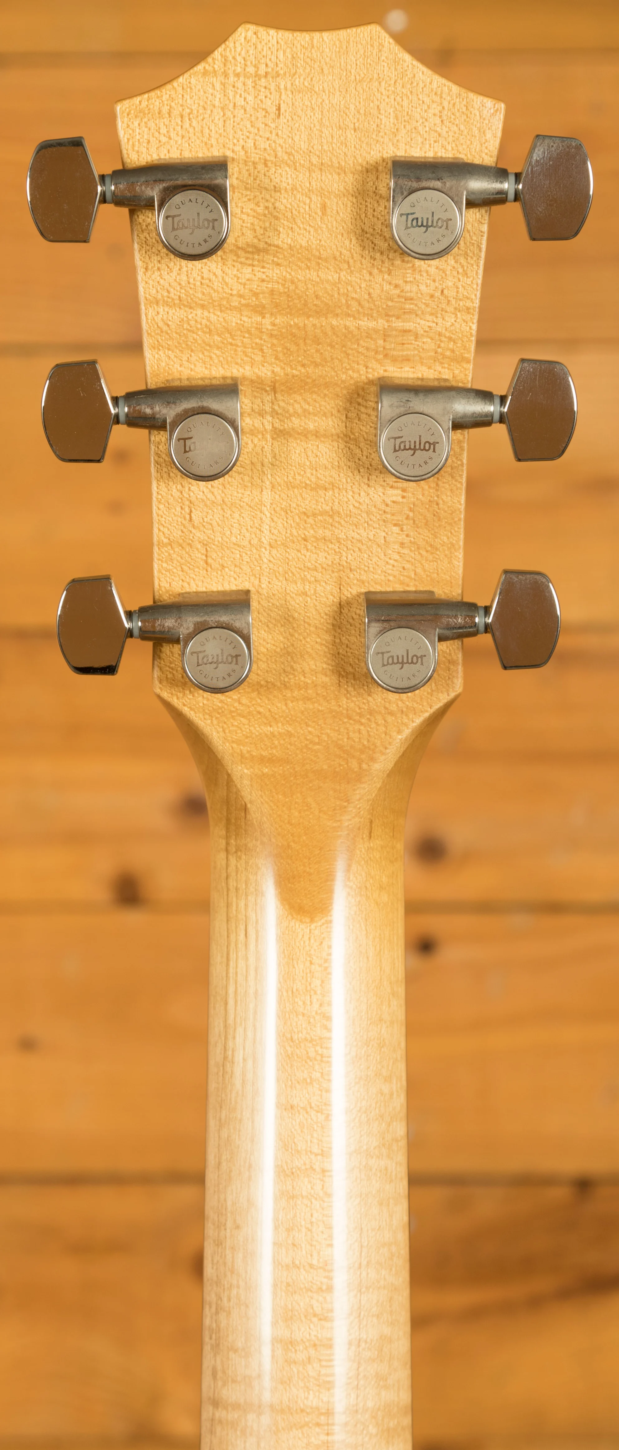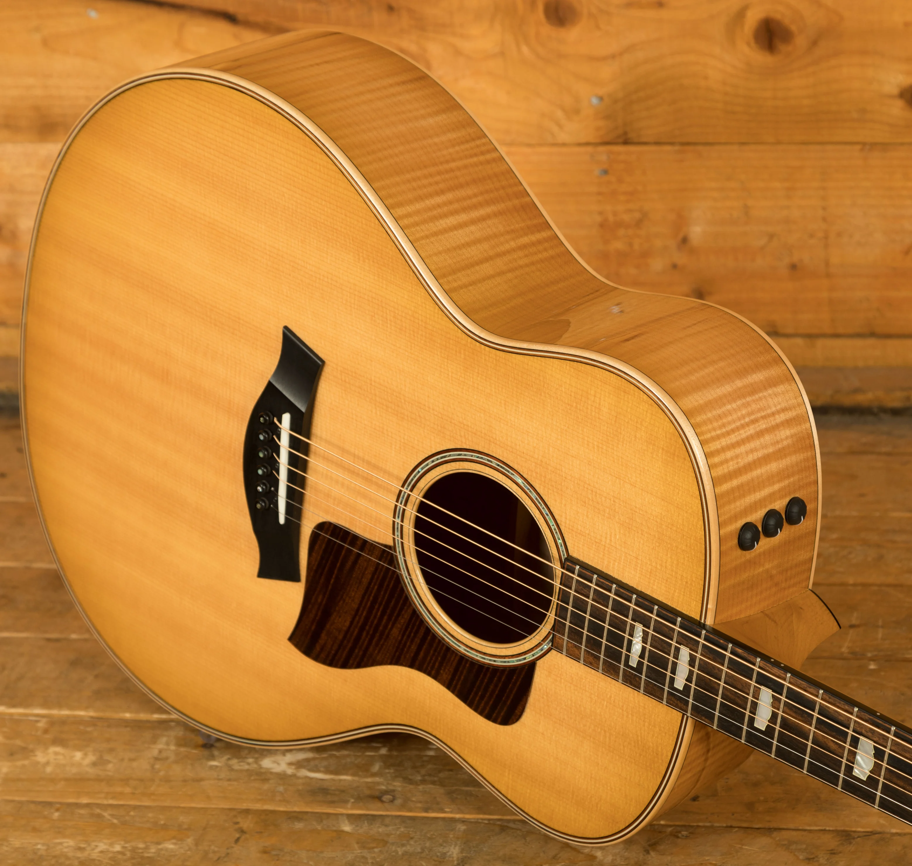 The 618e's large Grand Orchestra body shape is known for its robust low-end and impressive volume, making it an ideal choice for strummers and flatpickers. It features a Sitka spruce top, providing exceptional clarity and dynamic range, paired with figured Big Leaf maple back and sides. Maple is renowned for its bright, articulate tone, and Taylor's master luthiers skillfully bring out its warmth and complexity in the 600 series. The guitar is finished in a gloss application, highlighting the stunning figuring of the maple. The tropical American mahogany neck is topped with an ebony fingerboard featuring distinctive "Twisted Ovals" inlays. The scale length is 25.5" (648mm), and the nut width is 1.75" (44.5mm). For amplified performance, it's equipped with Taylor Expression System 2 (ES2) electronics, providing a natural and dynamic tone for stage or studio use. Chrome Gotoh 510 tuners ensure precise and stable tuning. An original hard case is included, and this instrument represents a fantastic opportunity for a significant saving over buying new, offering all the sonic brilliance and playability expected from a high-end Taylor.