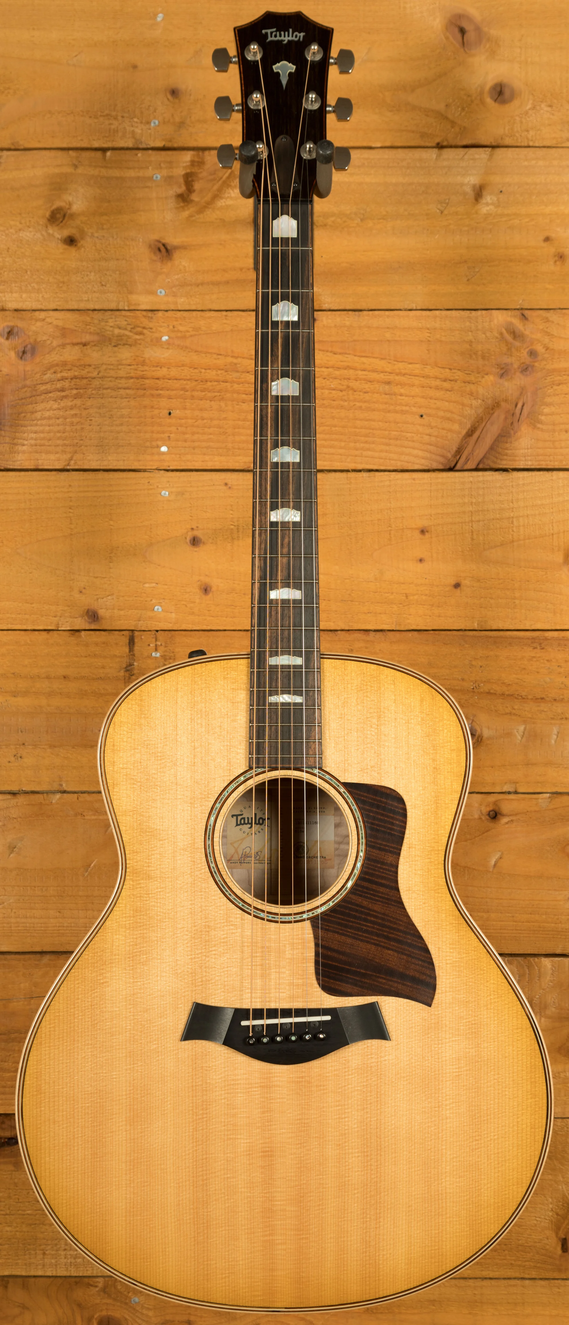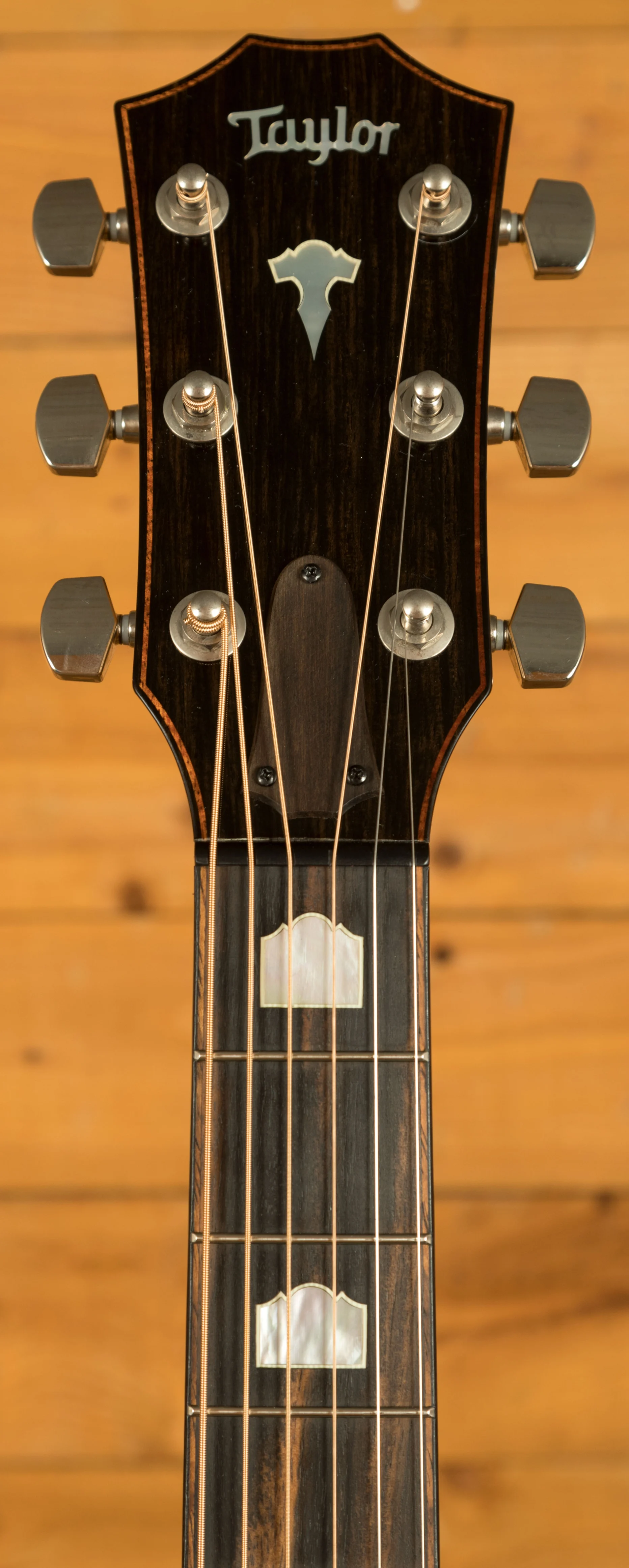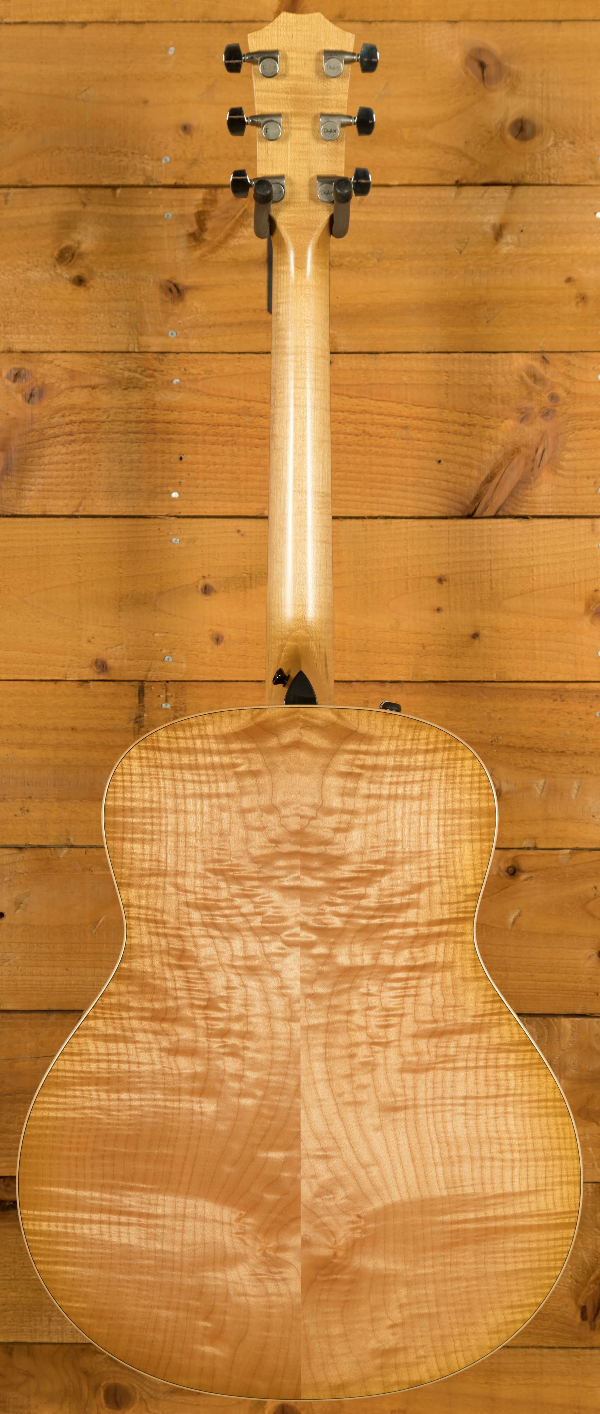 The 618e's large Grand Orchestra body shape is known for its robust low-end and impressive volume, making it an ideal choice for strummers and flatpickers. It features a Sitka spruce top, providing exceptional clarity and dynamic range, paired with figured Big Leaf maple back and sides. Maple is renowned for its bright, articulate tone, and Taylor's master luthiers skillfully bring out its warmth and complexity in the 600 series. The guitar is finished in a gloss application, highlighting the stunning figuring of the maple. The tropical American mahogany neck is topped with an ebony fingerboard featuring distinctive "Twisted Ovals" inlays. The scale length is 25.5" (648mm), and the nut width is 1.75" (44.5mm). For amplified performance, it's equipped with Taylor Expression System 2 (ES2) electronics, providing a natural and dynamic tone for stage or studio use. Chrome Gotoh 510 tuners ensure precise and stable tuning. An original hard case is included, and this instrument represents a fantastic opportunity for a significant saving over buying new, offering all the sonic brilliance and playability expected from a high-end Taylor.