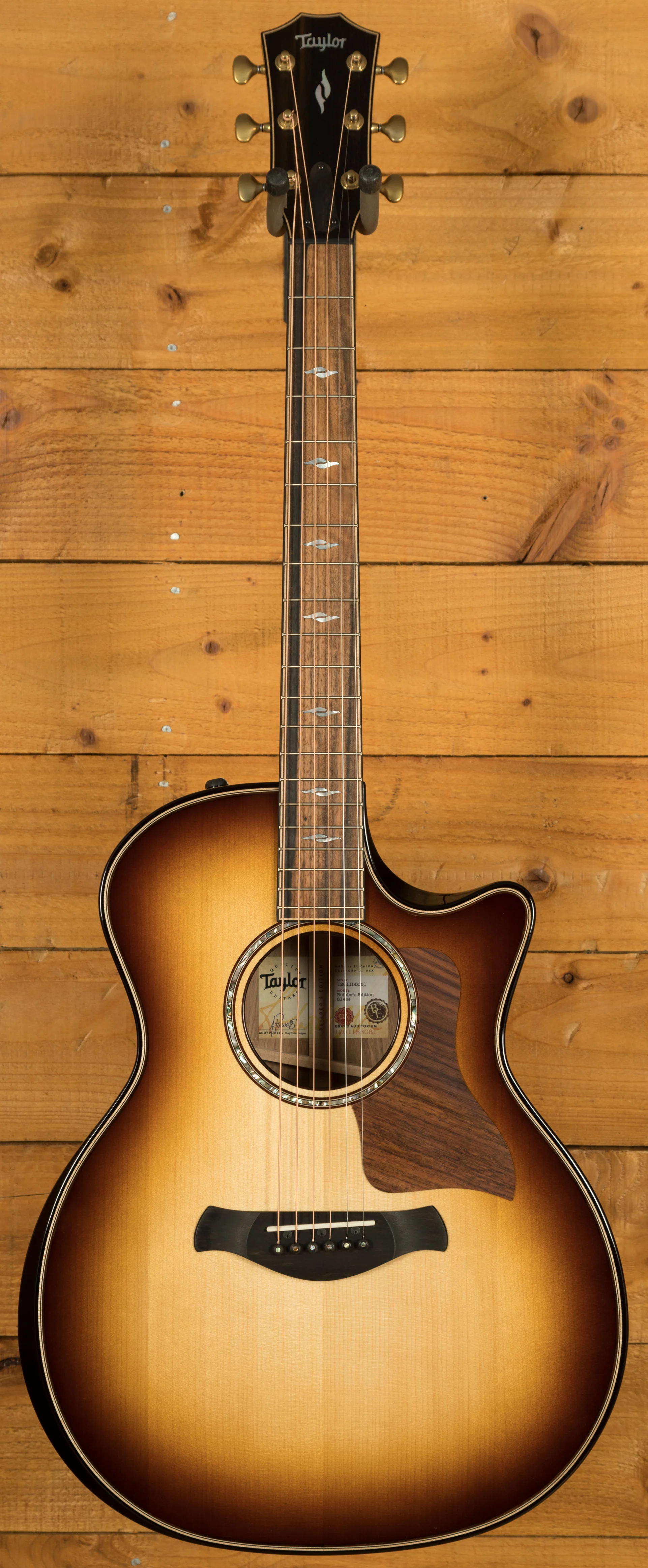The Builder's Edition 814ce boasts premium appointments, including Element fretboard inlays in shell and mother of pearl, a rosewood pickguard, Gotoh 510 antique gold tuning machines, and a full-body gloss finish with a Kona Edgeburst for the back and sides and a complementary Shaded Edge Burst treatment for the top. A Taylor Deluxe Hardshell Brown case is included for protection and storage.