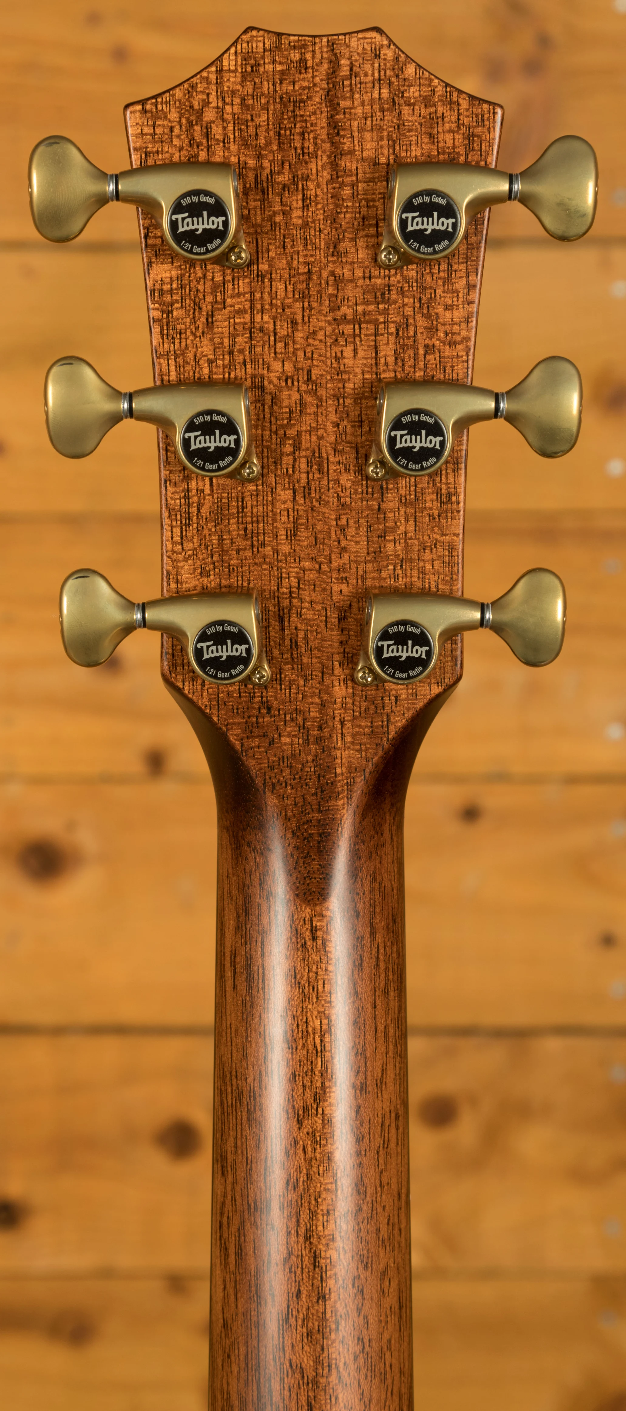 The Grand Auditorium body shape, a Taylor design introduced in 1994, is a versatile mid-size shape that falls between a Dreadnought and Grand Concert. It offers a balance of full low-end, present midrange, and sparkling trebles, making it suitable for various playing styles. The guitar features V-Class bracing, a Taylor innovation that enhances volume, sustain, and intonation. This bracing pattern stiffens the top in the direction of the strings for sustain while allowing flexibility for volume, resulting in notes that are louder, longer-lasting, and more in tune.