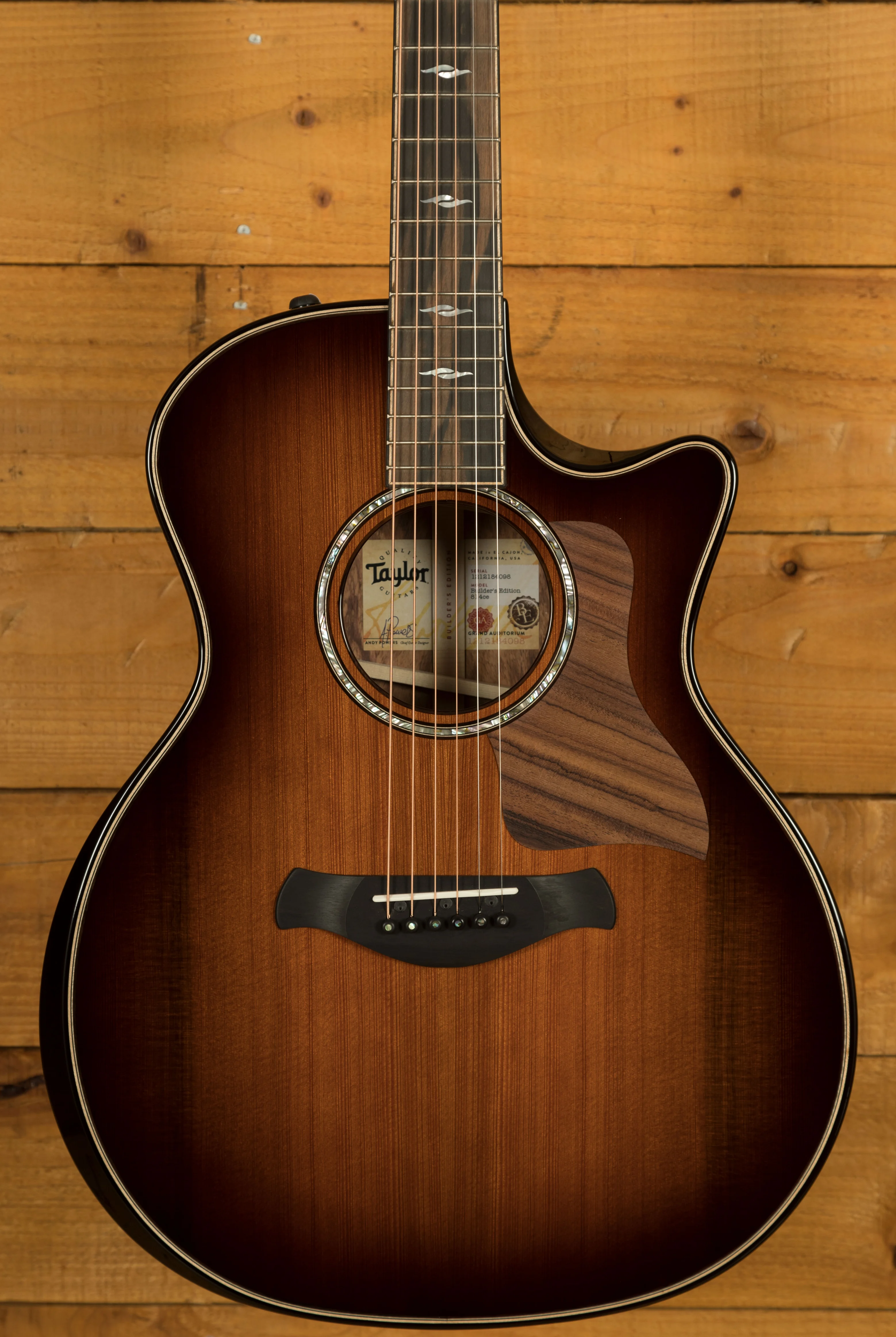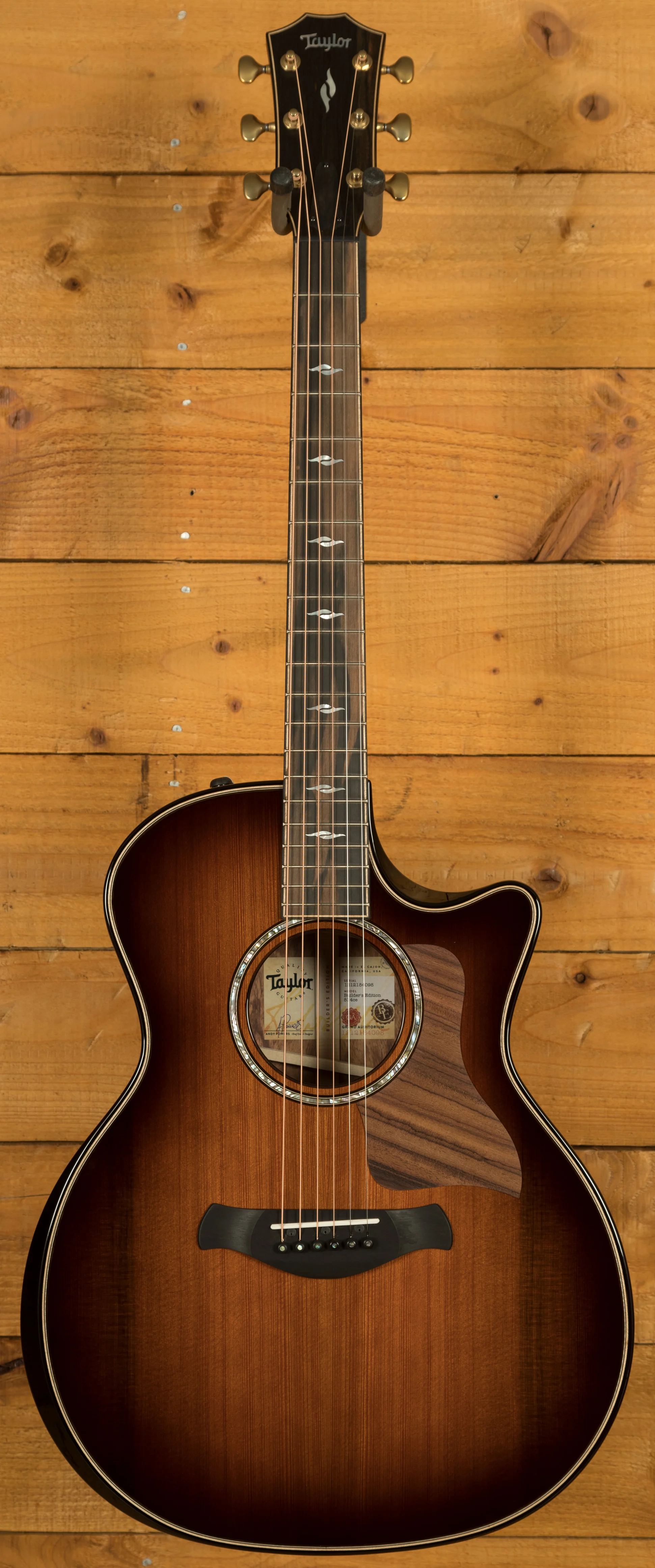 The Builder's Edition 814ce prioritises player comfort with features like a bevelled mahogany armrest, a bevelled cutaway for easy access to the upper frets, and chamfered body edges. The neo-tropical mahogany neck and West African Crelicam ebony fretboard provide a comfortable playing experience. Other premium appointments include Gotoh 510 tuning machines with an 18:1 ratio for precise tuning, Element fretboard inlays, and a gloss finish with a shaded edgeburst treatment. The guitar comes with a Taylor deluxe hardshell brown case for protection.