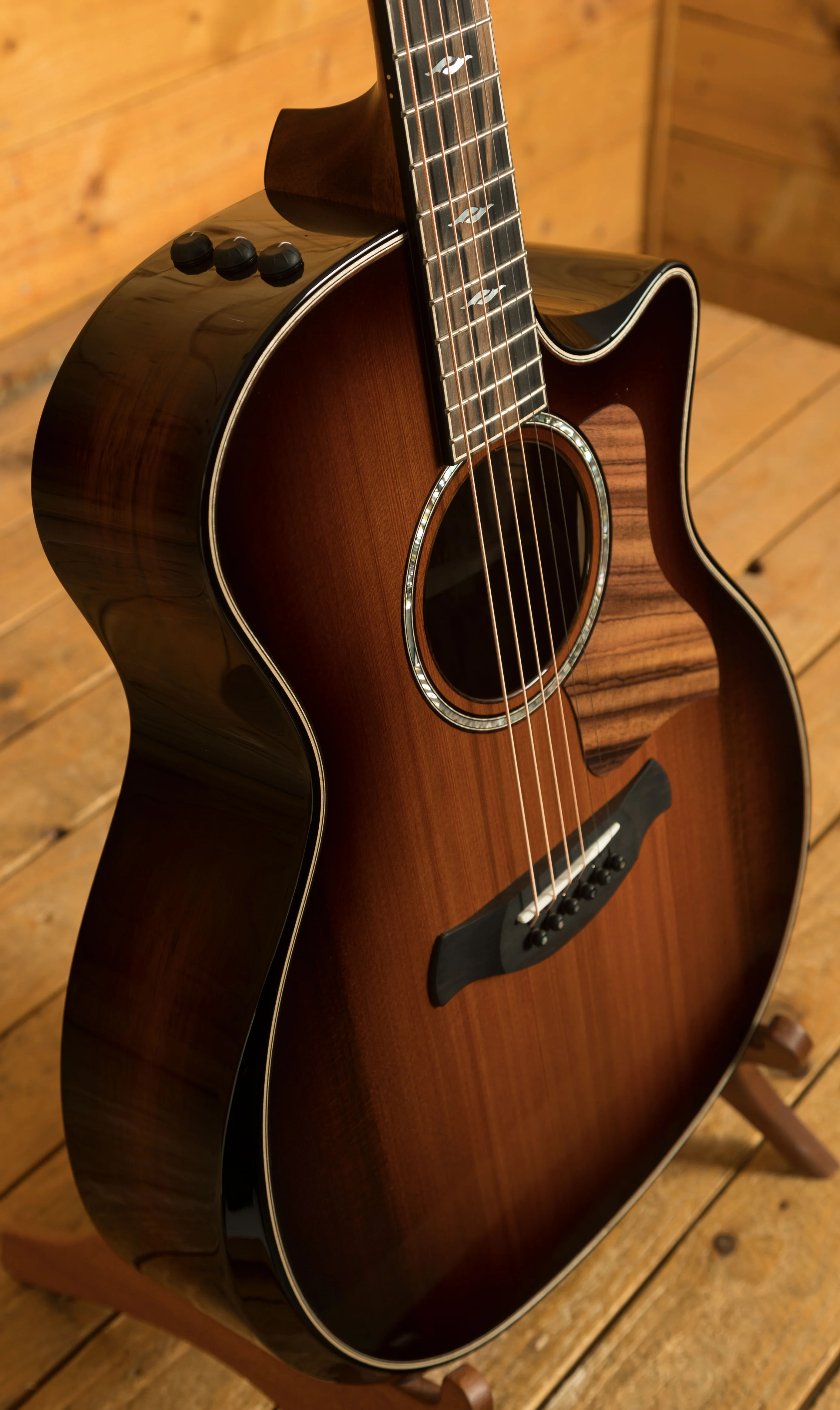 Taylor's V-Class bracing system enhances the guitar's sonic performance by increasing volume, sustain, and improving intonation. This innovative bracing pattern allows the top to be both stiff and flexible, resulting in a more powerful and harmonically rich sound. The guitar also features the Expression System 2 (ES2) electronics, a behind-the-saddle pickup design that captures a wider range of the guitar's dynamic properties for exceptional amplified tone.