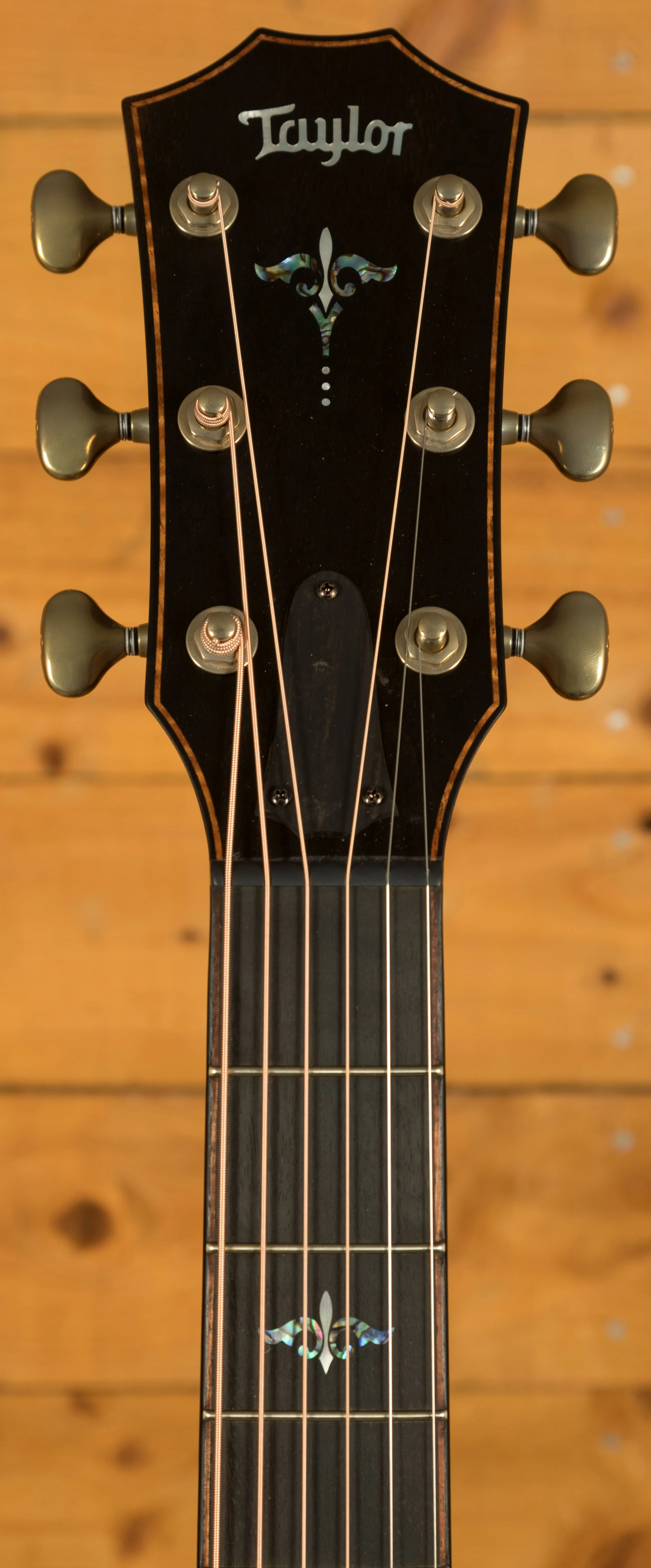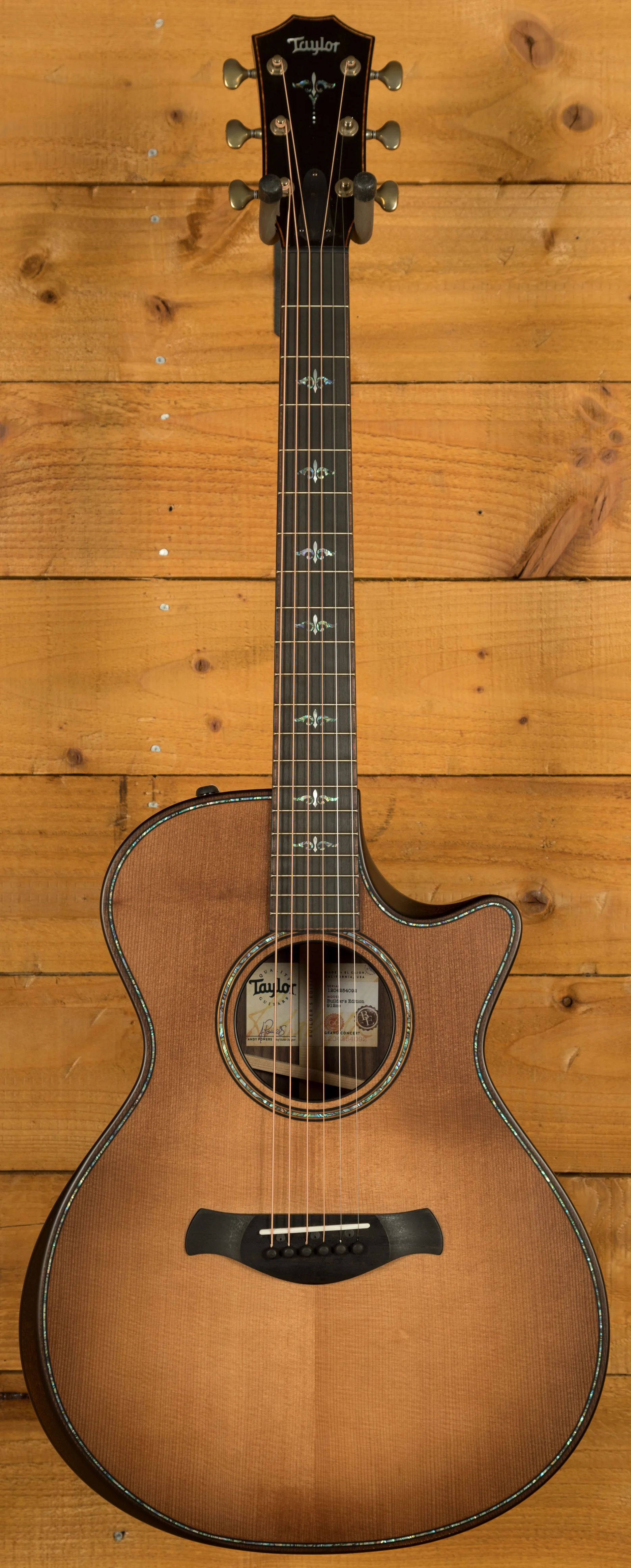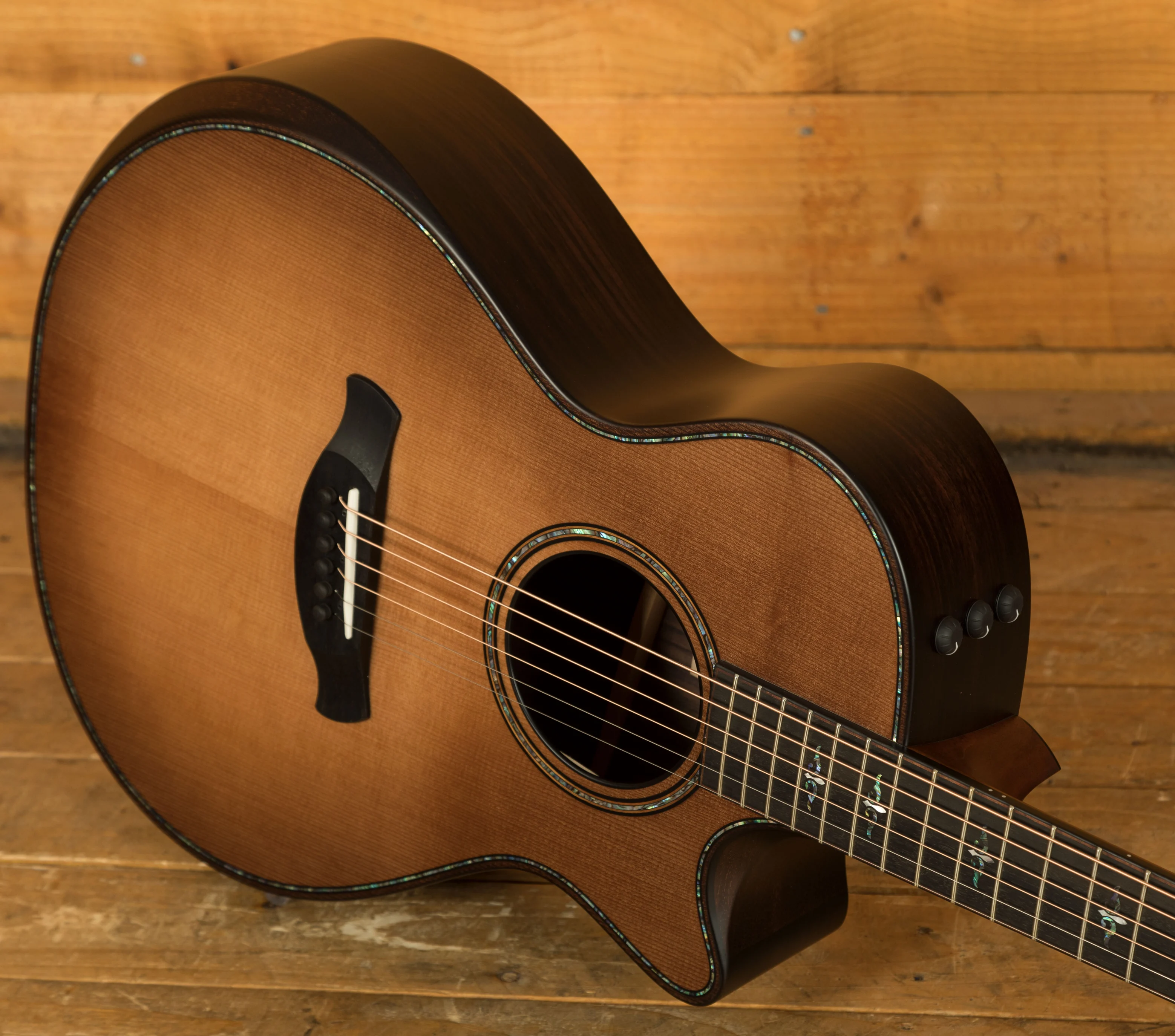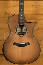 The Taylor Builder's Edition 912ce WHB is a premium Grand Concert electro-acoustic guitar meticulously crafted to meet the highest standards of playability and tonal excellence. This guitar features a tonewood pairing of Indian rosewood back and sides with a Lutz spruce top, a combination renowned for its balanced and articulate sound. The Indian rosewood contributes a rich, resonant low end and sparkling trebles, while the Lutz spruce adds clarity, projection, and a powerful tonal response. The slightly scooped mids create space for other instruments in a mix.