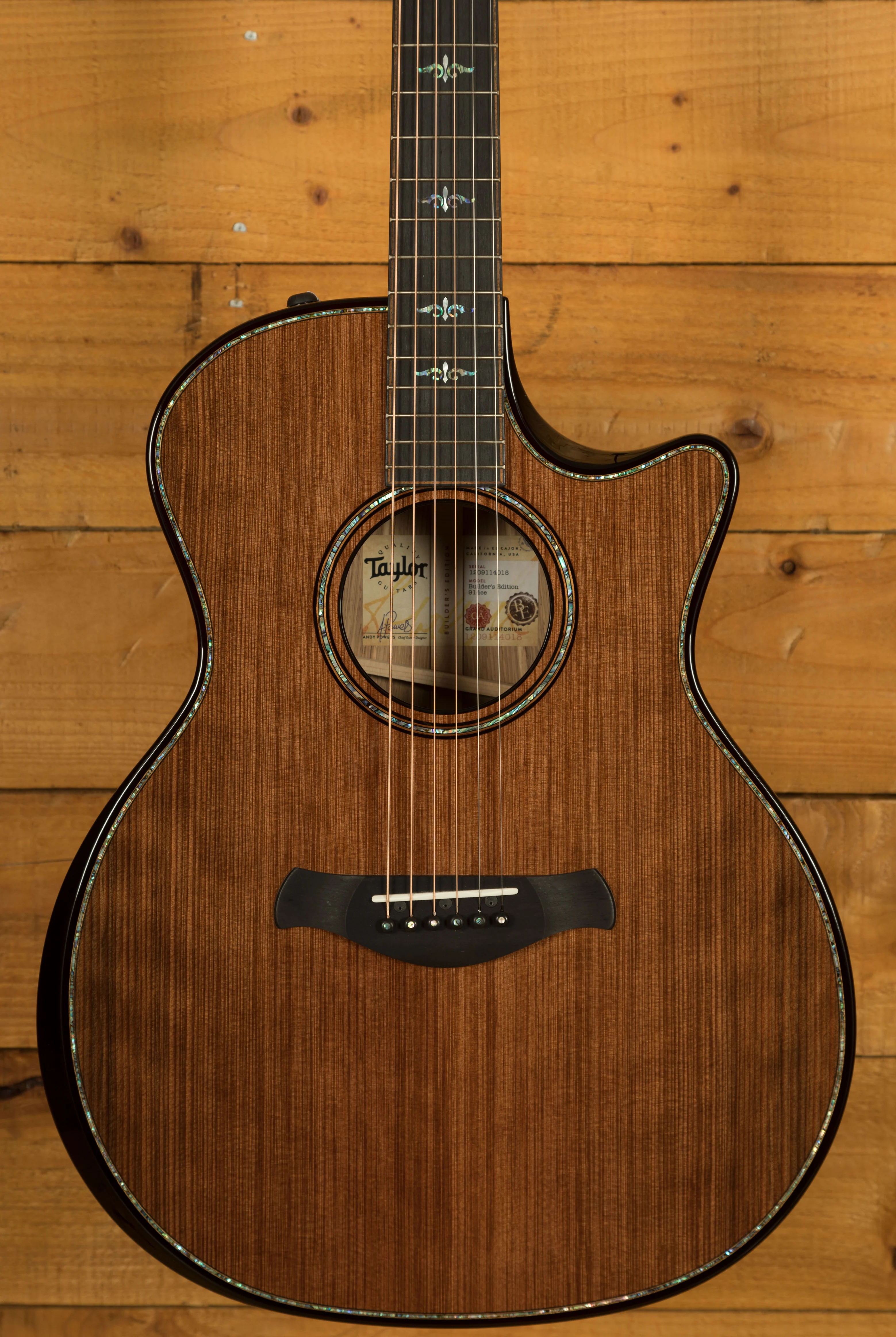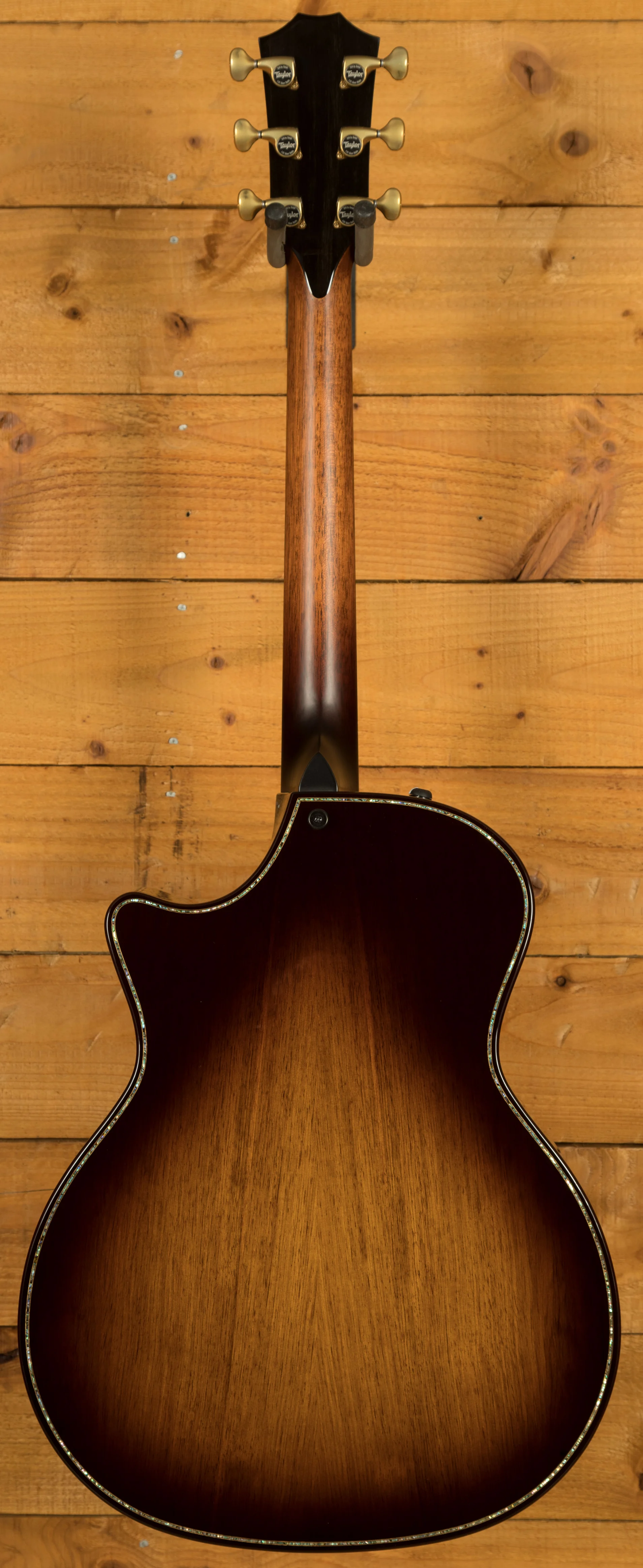 Aesthetically, the 912ce showcases elegant details, including Hawaiian koa purfling, paua edge trim, an ebony backstrap, and Gotoh 510 tuners in antique gold. The Belle Fleur inlays in paua and mother-of-pearl add a touch of sophistication, while the Kona edgeburst finish on the back and sides complements the overall design. The guitar comes with a Taylor deluxe hardshell case for protection.