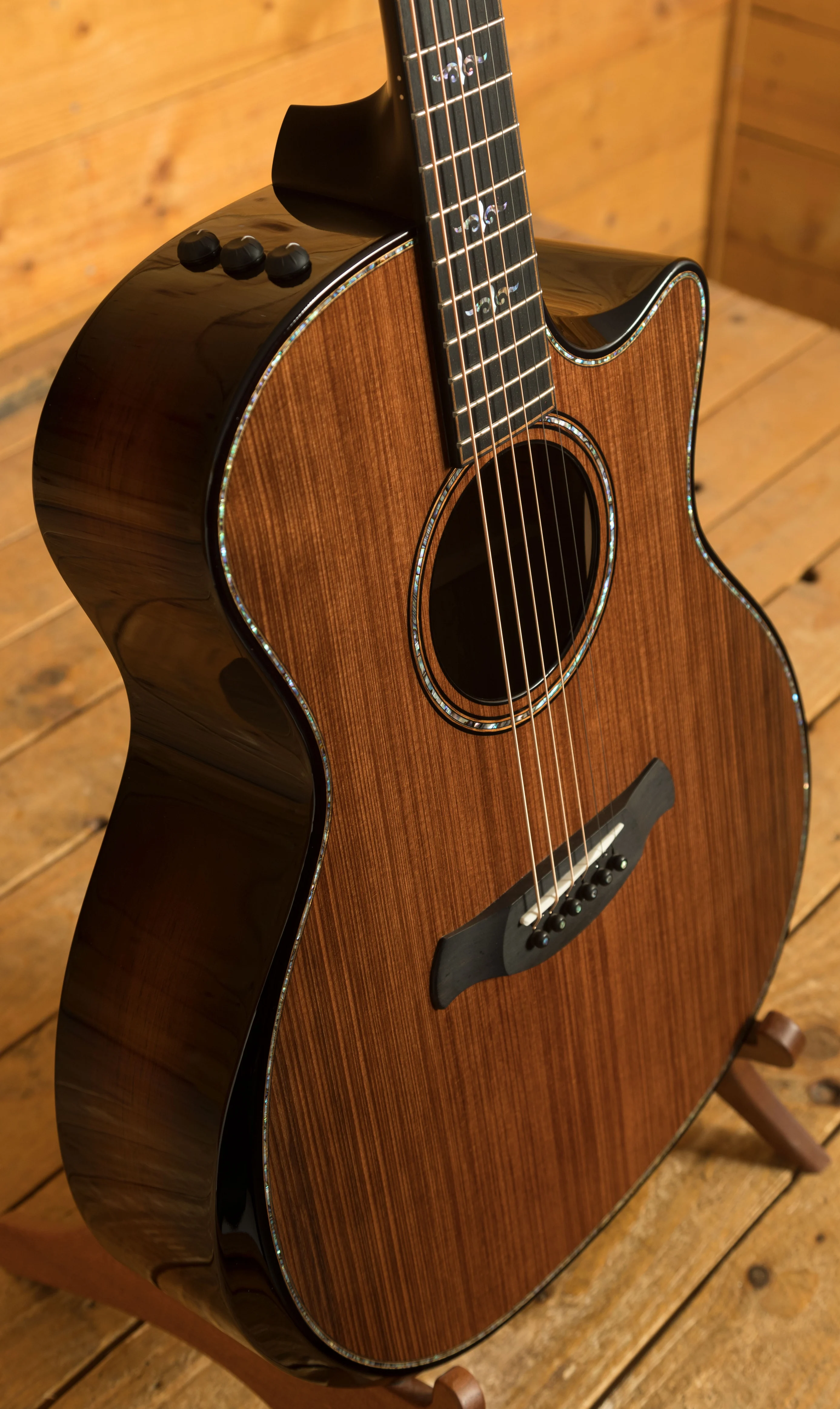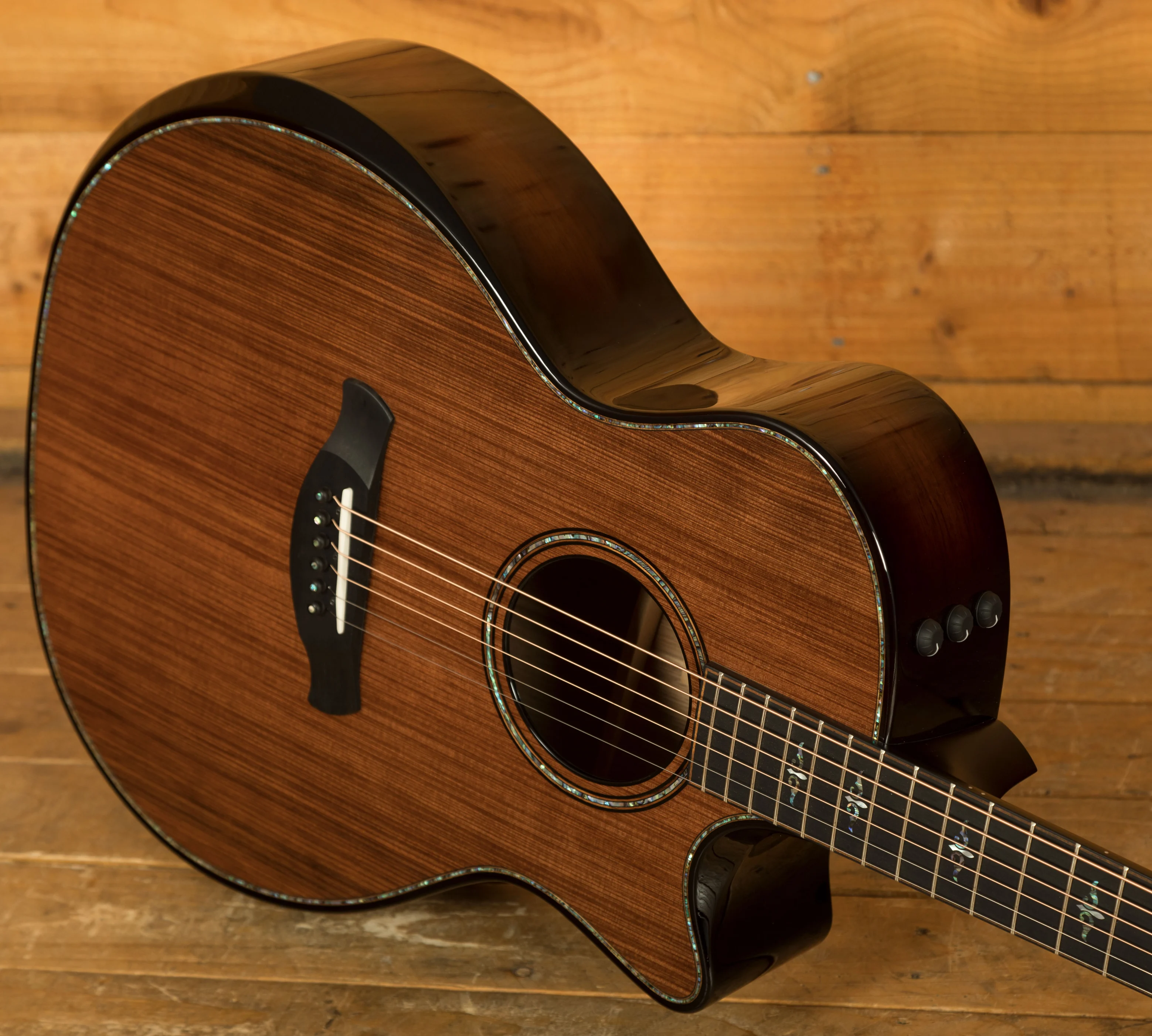 The guitar is equipped with Taylor's Expression System 2 (ES2) electronics, a behind-the-saddle pickup system that captures the nuances of the guitar's acoustic sound. The ES2 features three individually calibrated sensors that respond to the guitar's energy, delivering a natural and dynamic amplified tone.