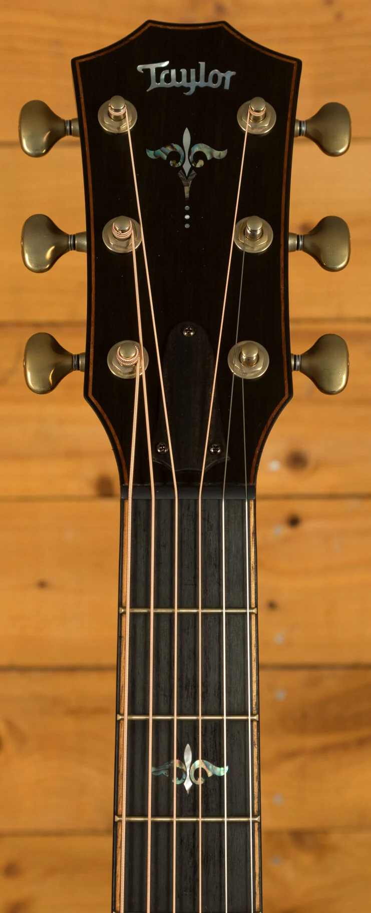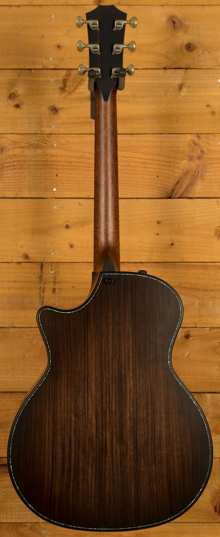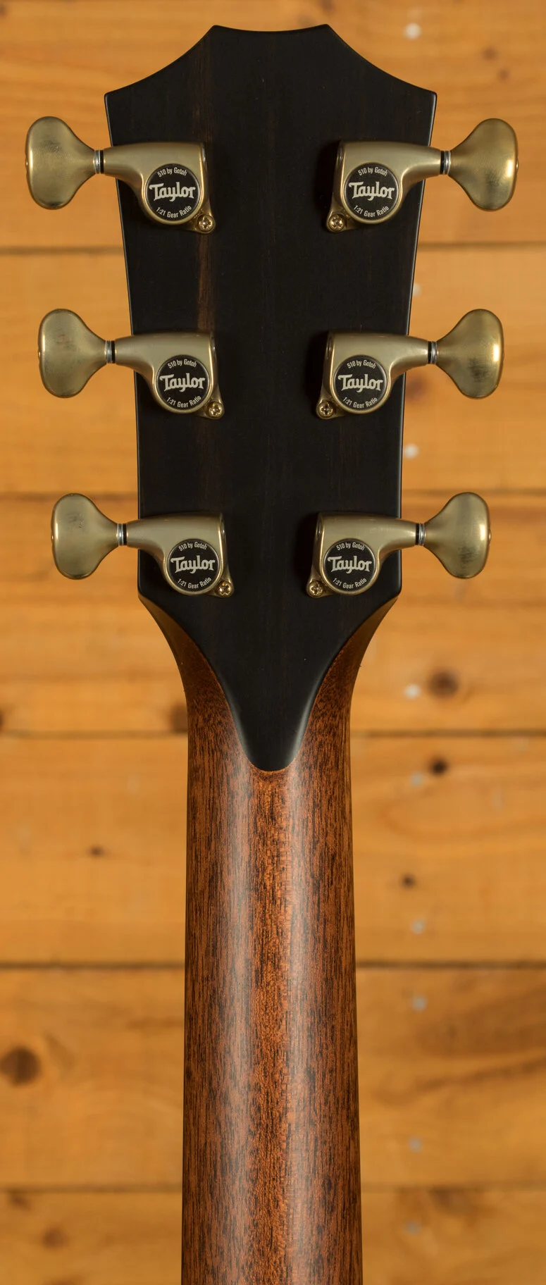 The guitar's body is shaped in Taylor's popular Grand Auditorium design. This versatile shape sits comfortably between a Dreadnought and Grand Concert, making it suitable for both strumming and fingerstyle playing. The Grand Auditorium offers a full lower register, present midrange, and sparkling treble, making it a popular choice for singer-songwriters and players seeking a single guitar for various styles.