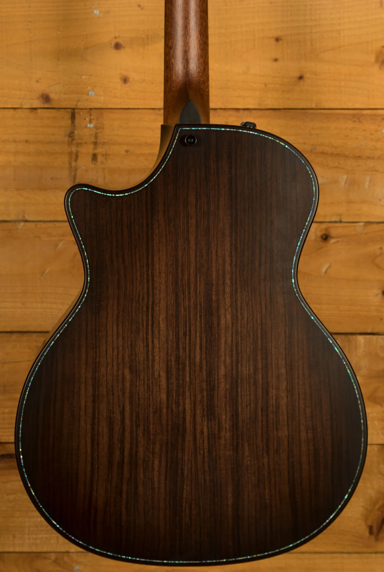 The 914ce WHB features a Lutz spruce top, a naturally occurring hybrid of Sitka and White spruce. This wood is known for its powerful sonic characteristics, blending the best qualities of its parent species and often exhibiting properties similar to Adirondack spruce. This results in strong volume, projection, and tonal richness. The back and sides are crafted from solid Indian rosewood, a highly regarded tonewood known for its wide frequency range, producing deep lows and bright, sparkling trebles. The combination of Lutz spruce and Indian rosewood provides a balanced tone with both clarity and power.