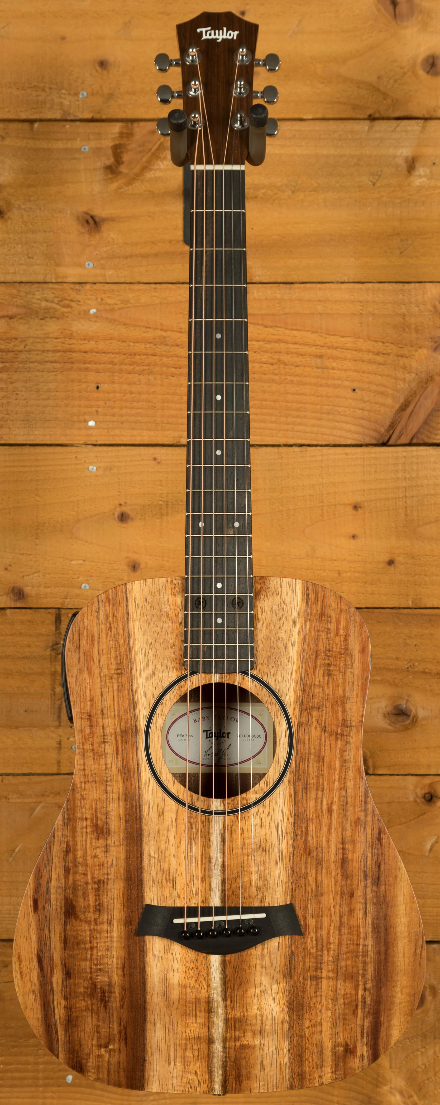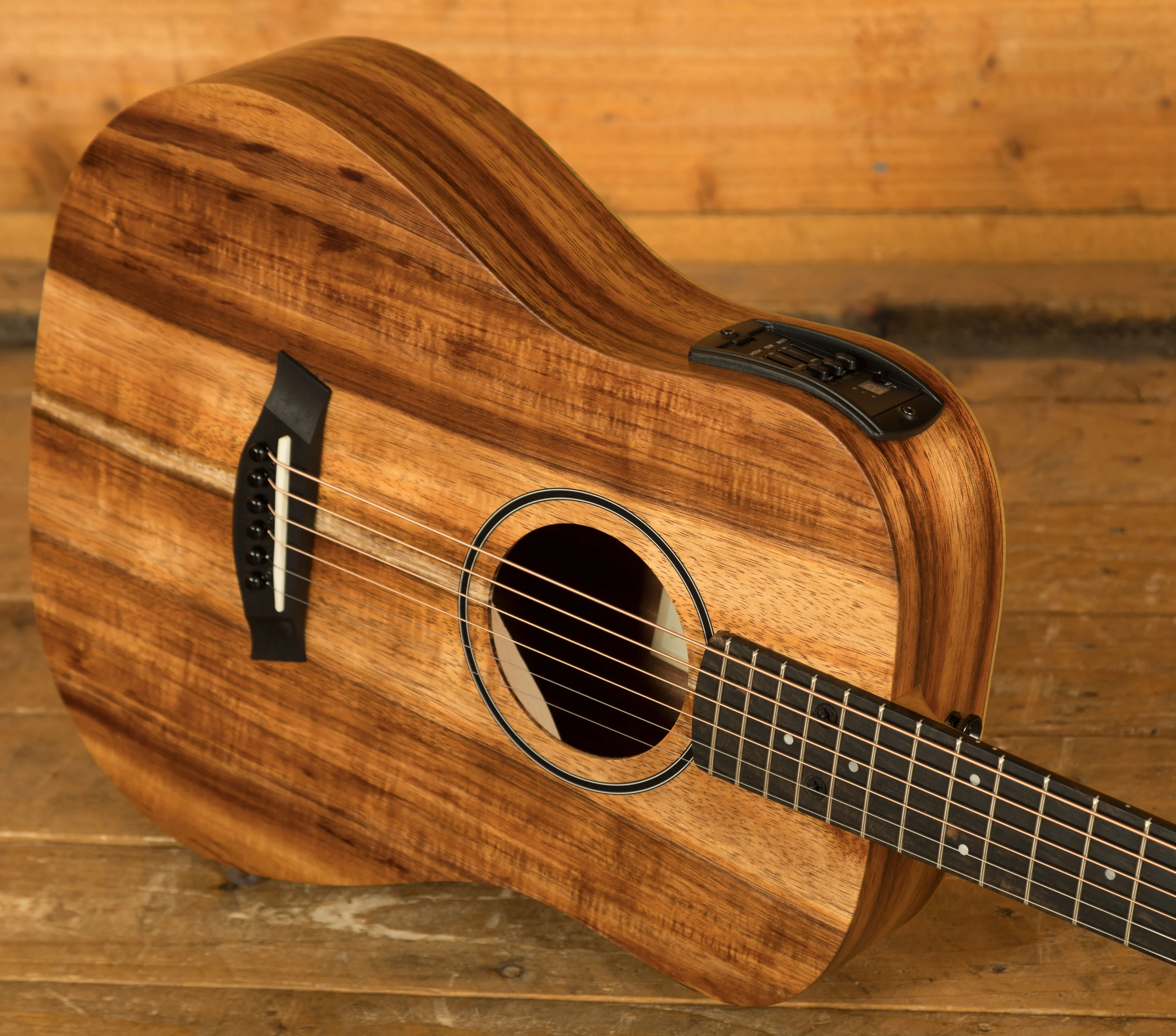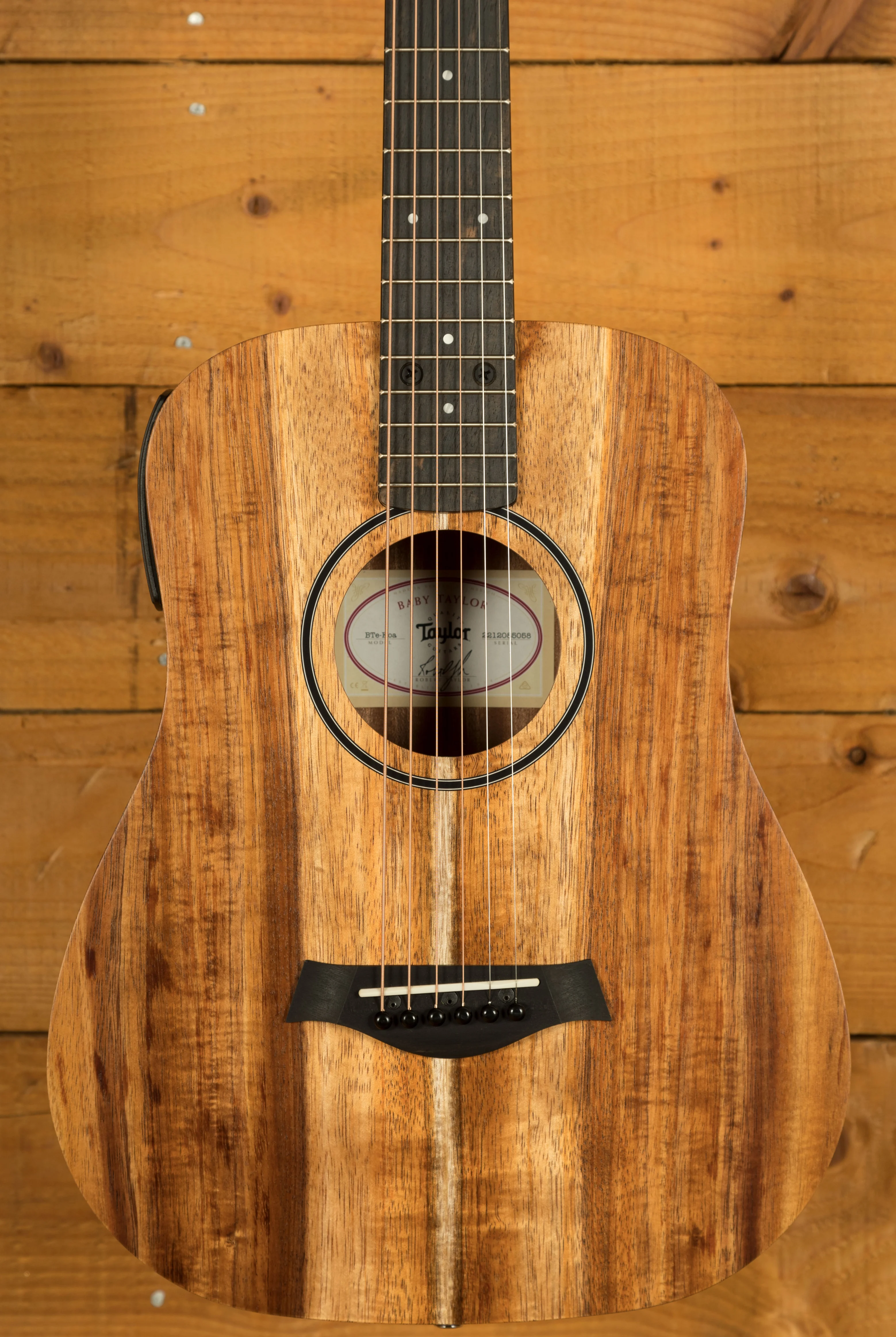 The Baby Taylor has always inspired new and experienced players alike with its compact size and tuneful sound, and this model (BTe-Koa) takes the design to the next level with all-Hawaiian-koa construction. The solid top serves up clear, vibrant acoustic tone with koa's distinctive sparkle, while the layered back and sides add a rich visual dimension thanks to koa's beautiful grain. This three-quarter-size acoustic guitar includes ES-B electronics with a handy digital tuner, and includes a lightweight gig bag, making it a perfect option for playing on the couch, jamming around the campfire or practising on the road.