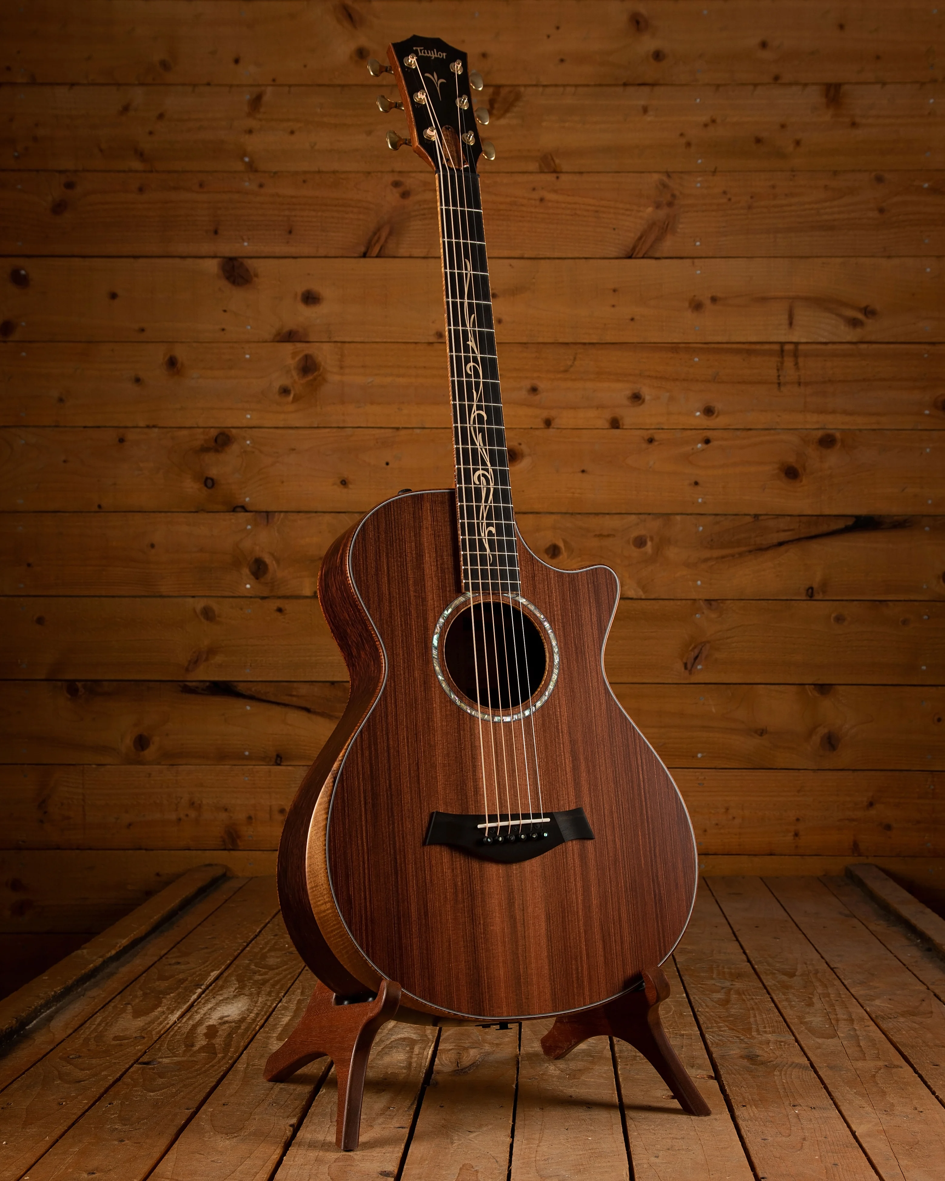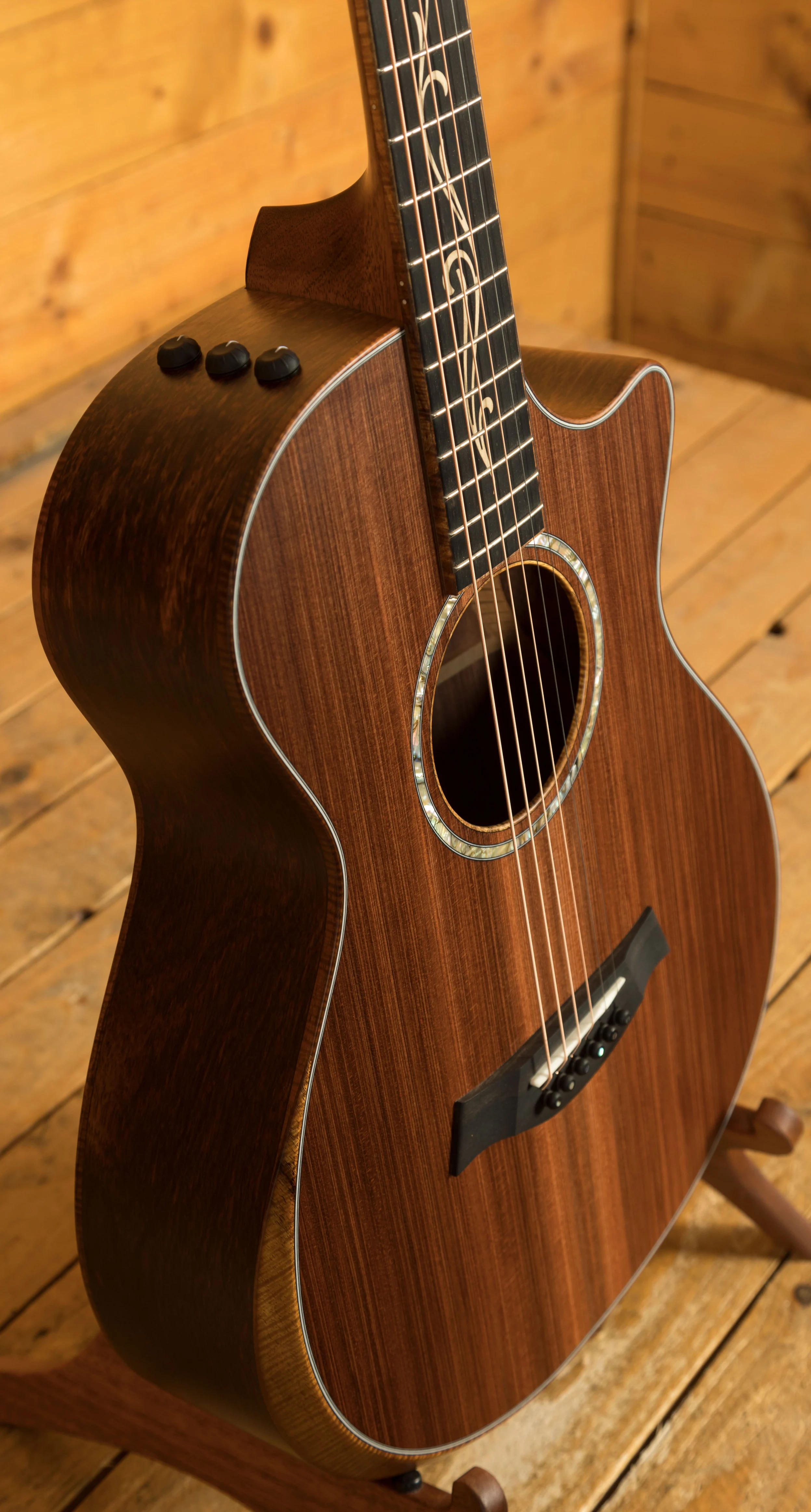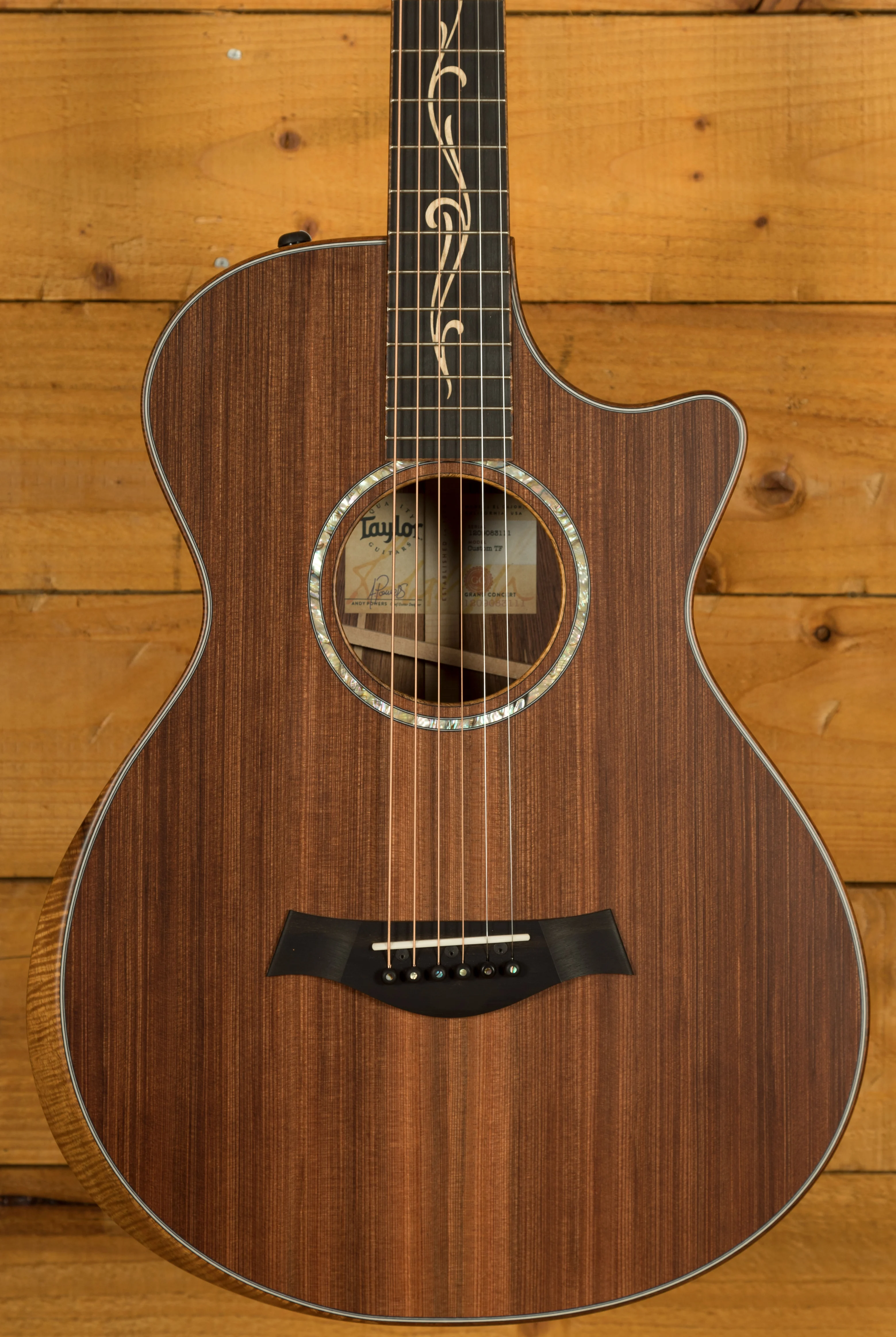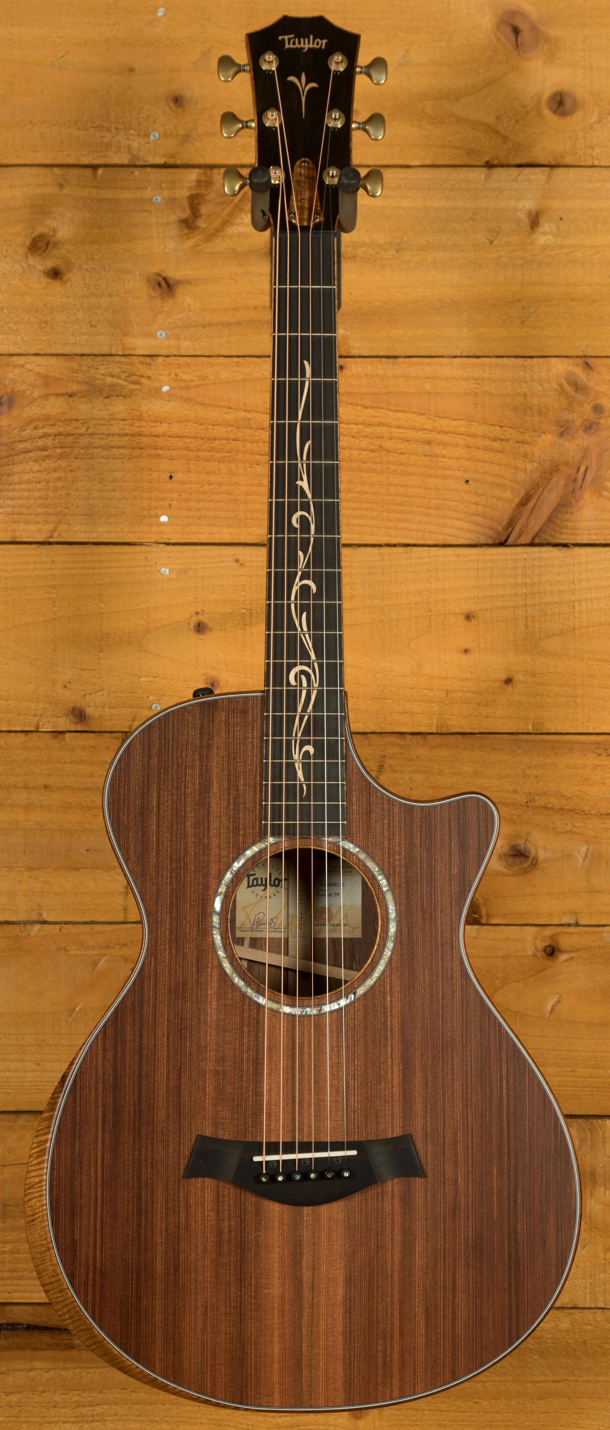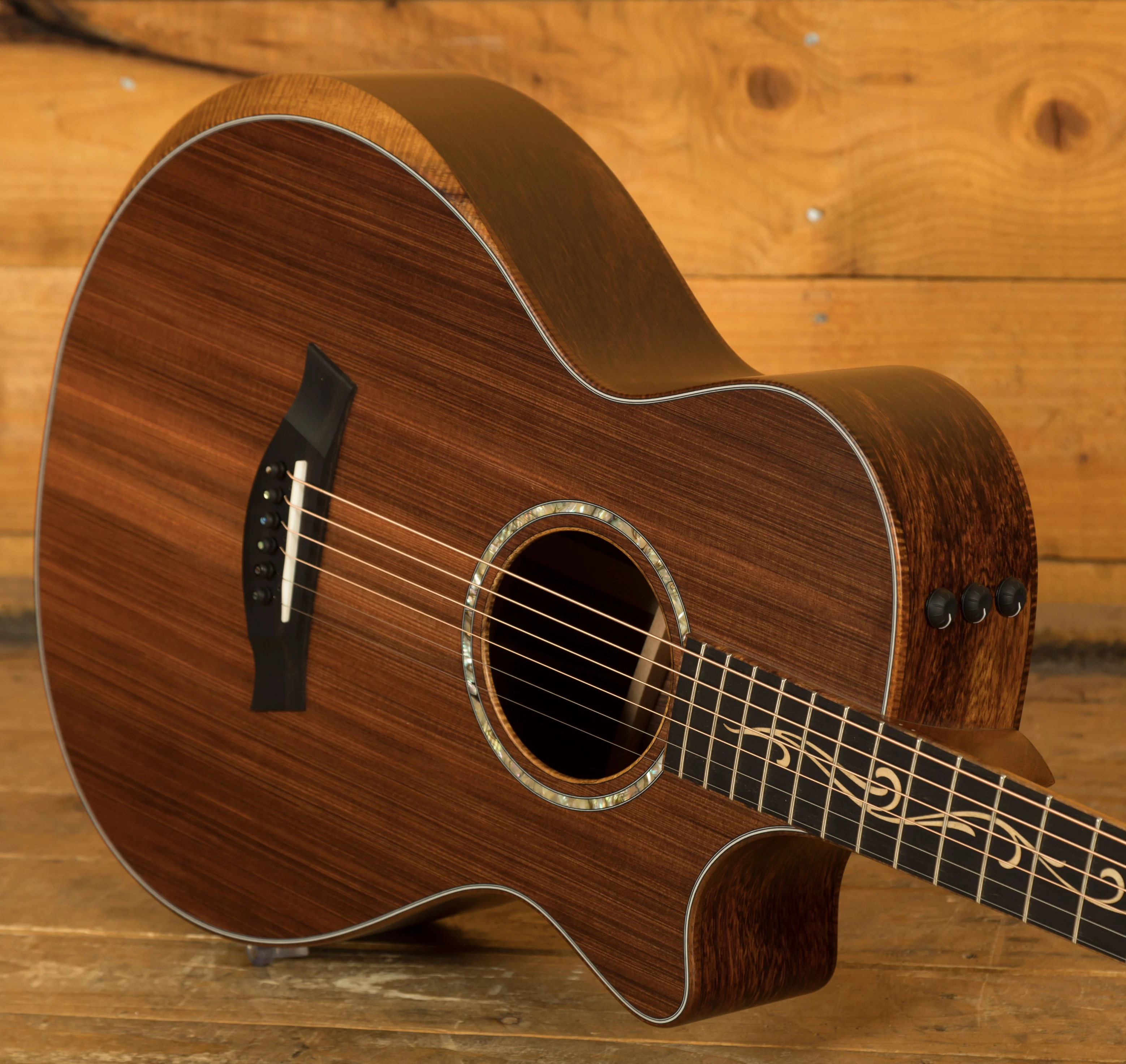 We are all familiar with the reputation of Taylor guitars, renowned for their exceptional craftsmanship, playability, and tone. Now, envision the prospect of owning a Taylor guitar that is uniquely yours. This exquisite, one-of-a-kind Taylor instrument came to fruition when our Peach Director, John, and Sales Manager, James, ventured to El Cajon, California, to pay a visit to our friends at Taylor. Together with Taylor's Master Guitar Designer, Andy Powers, they meticulously handpicked the most stunning wood sets, creating truly special, one-of-a-kind models, and this guitar is a testament to their collaborative effort. What makes this even more captivating is that this creative process can soon be witnessed in one of our feature videos on our YouTube channel, if not already available at the time of your reading. Showcasing the expertise of Peach and Andy, the Taylor Custom program is masterfully designed to bring forth a truly unique, heirloom-quality instrument.