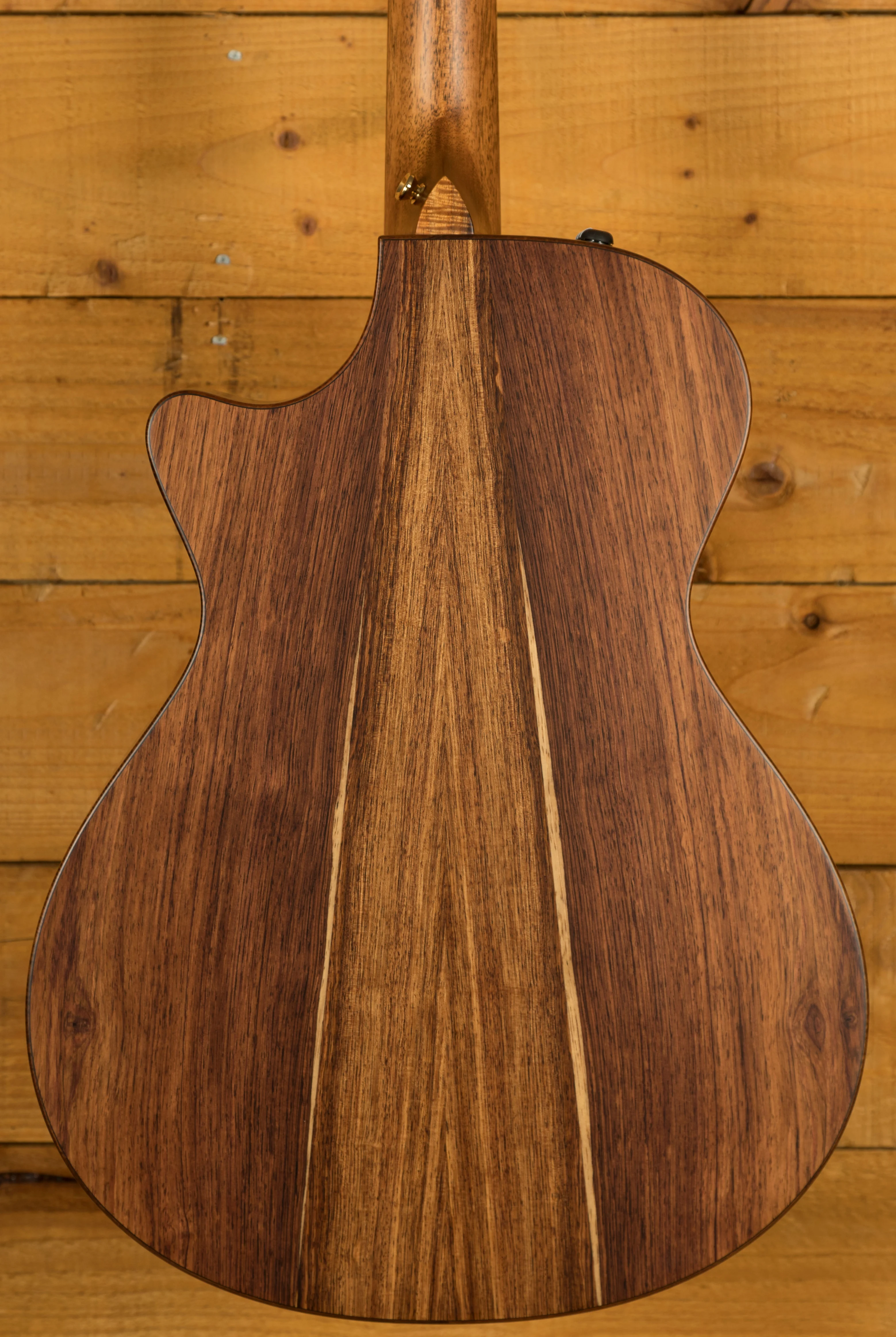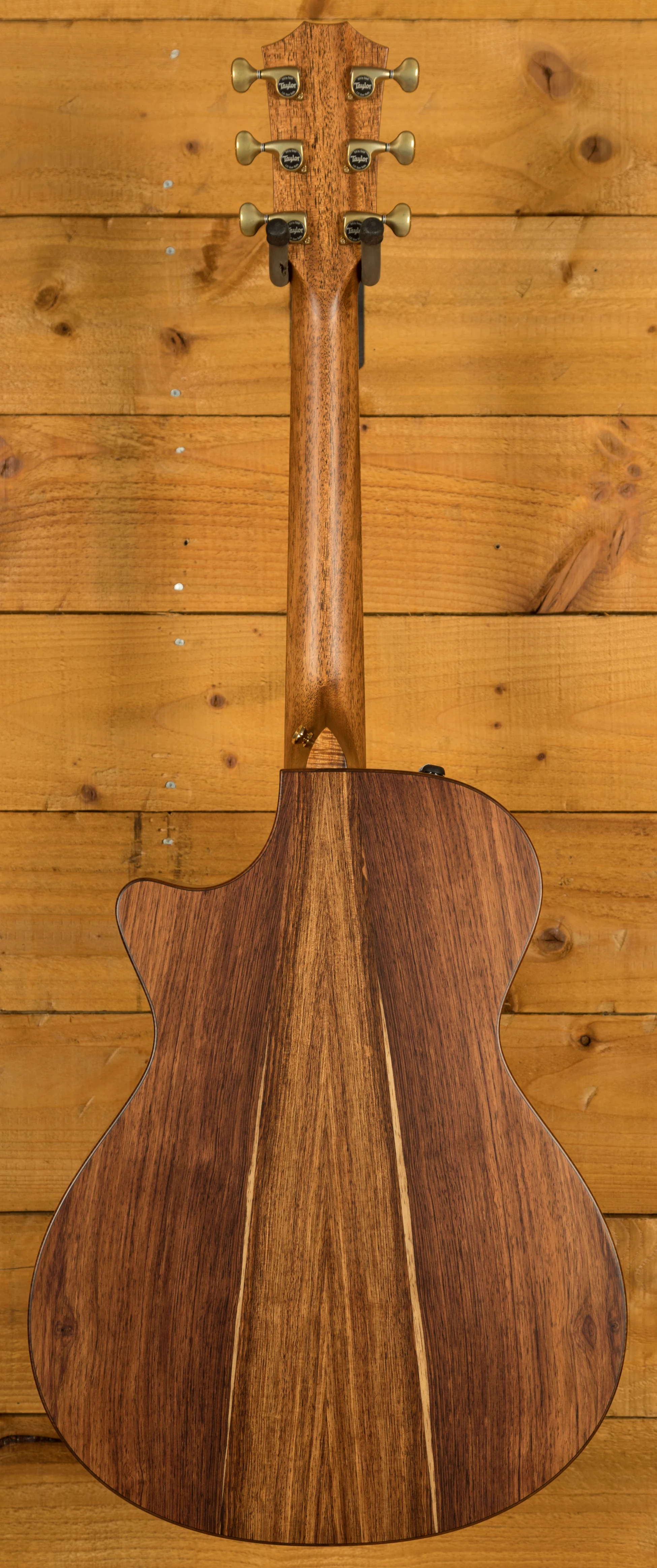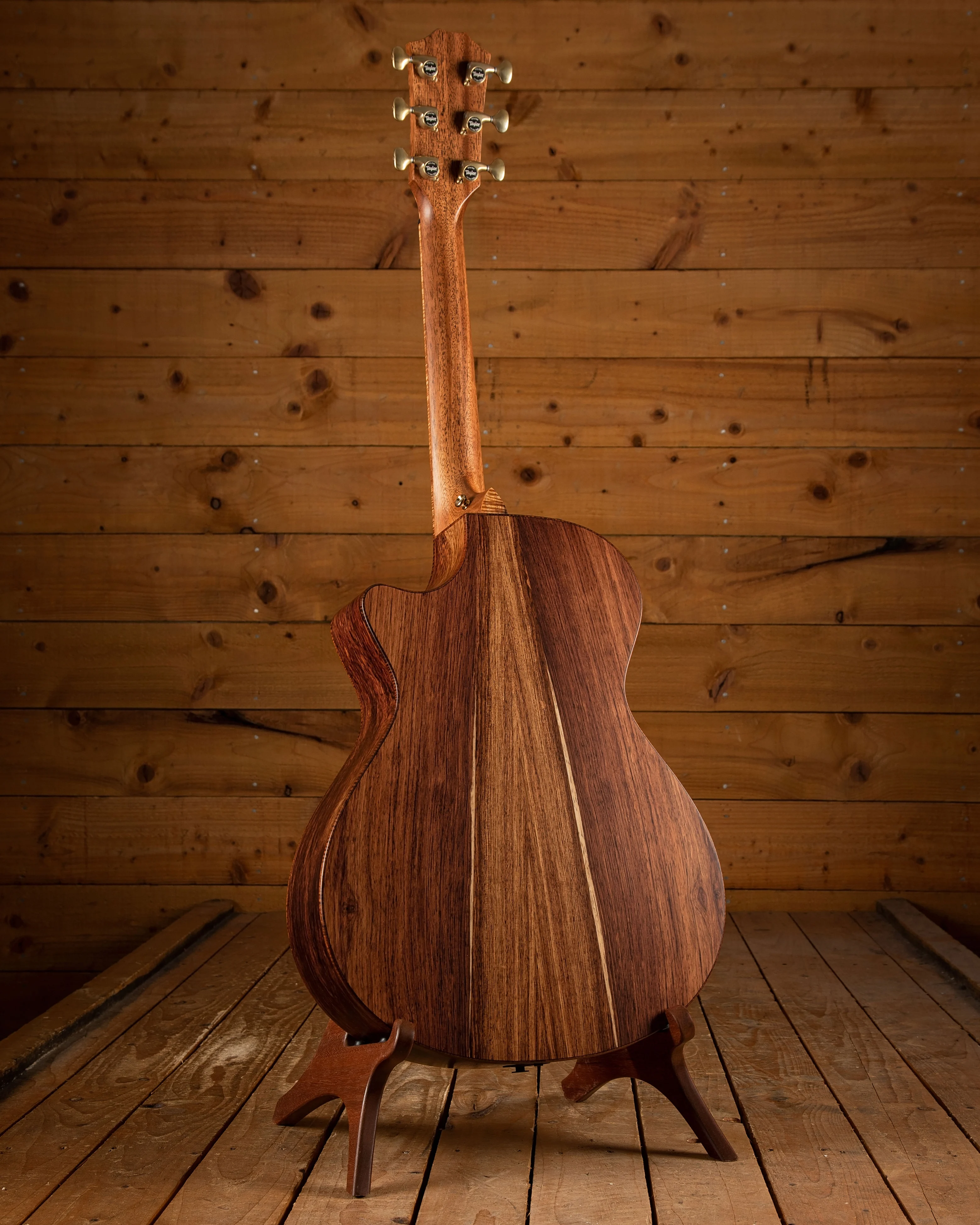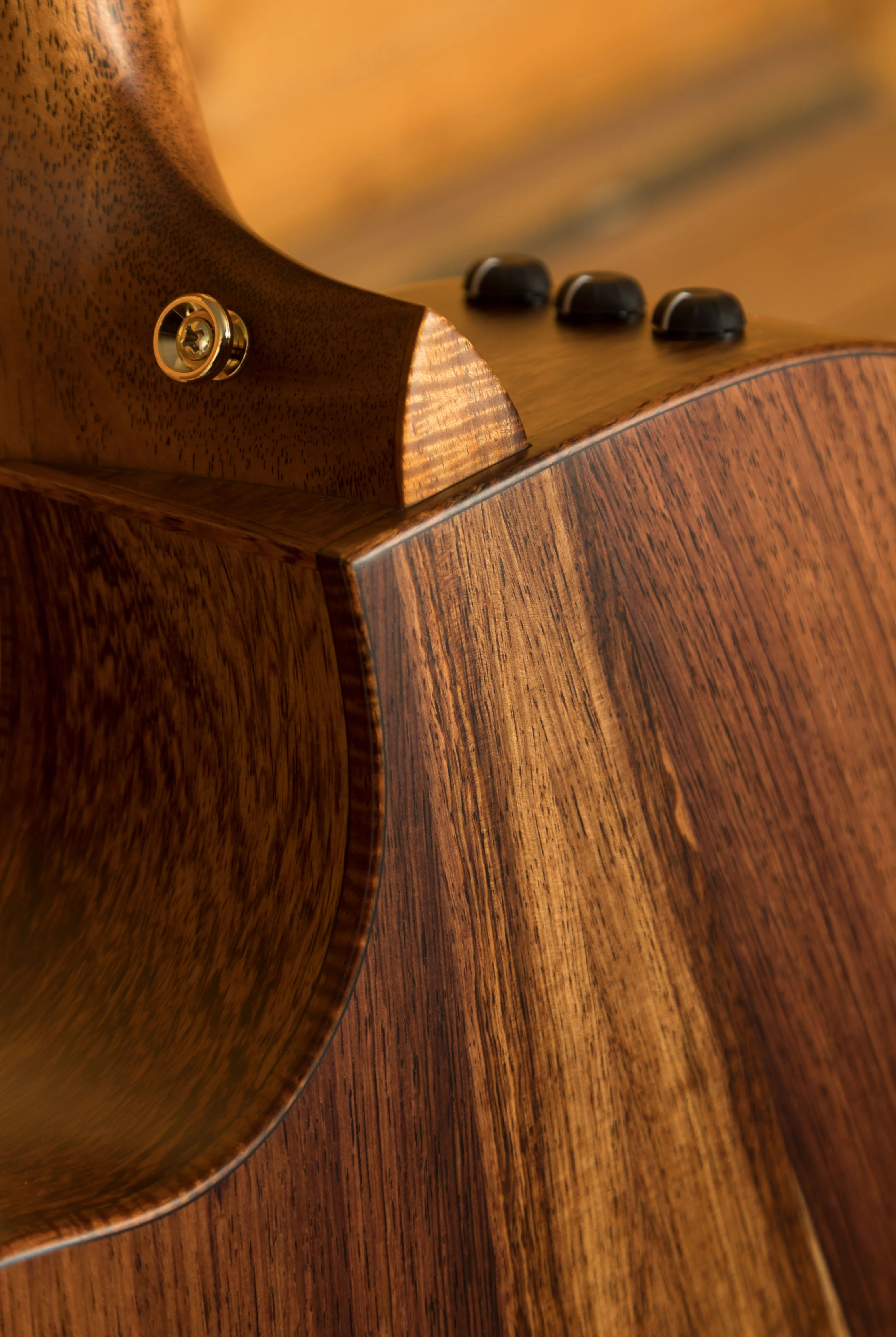 A distinctive feature of this model is the four-piece back configuration with a Simons wedge, named after its creator, Spanish luthier Jorge Simons. Both Andy and Bob Taylor prefer the symmetrical look of the four-piece bookmatched configuration, featuring a two-piece bookmatched wedge, which also provides structural advantages.
