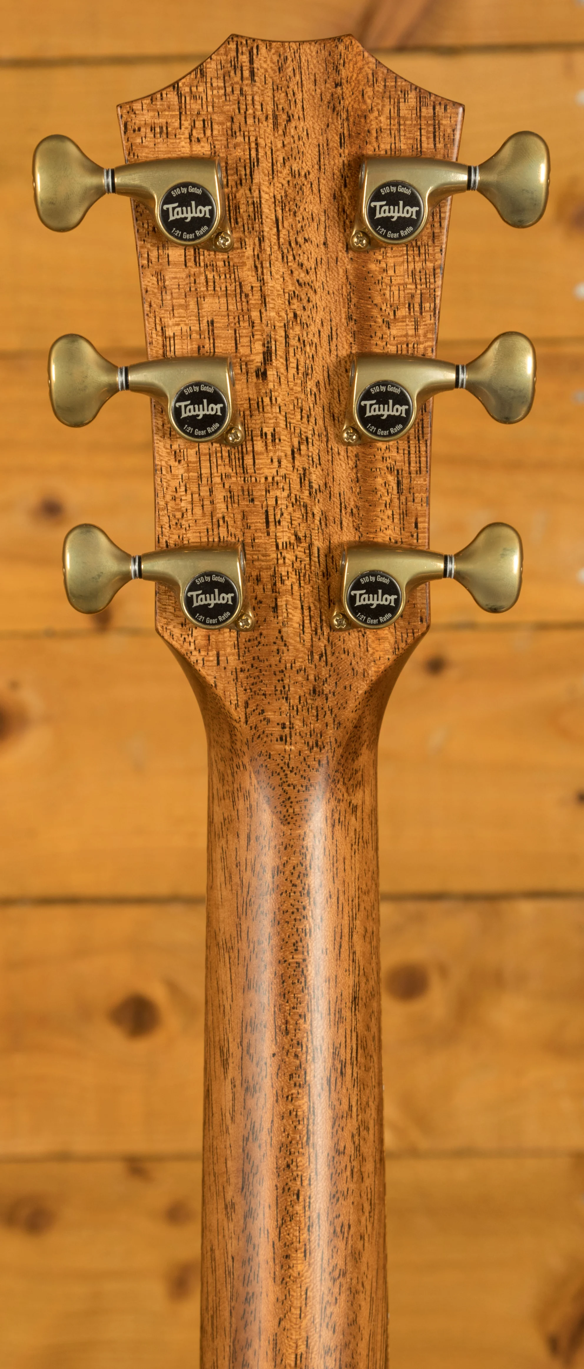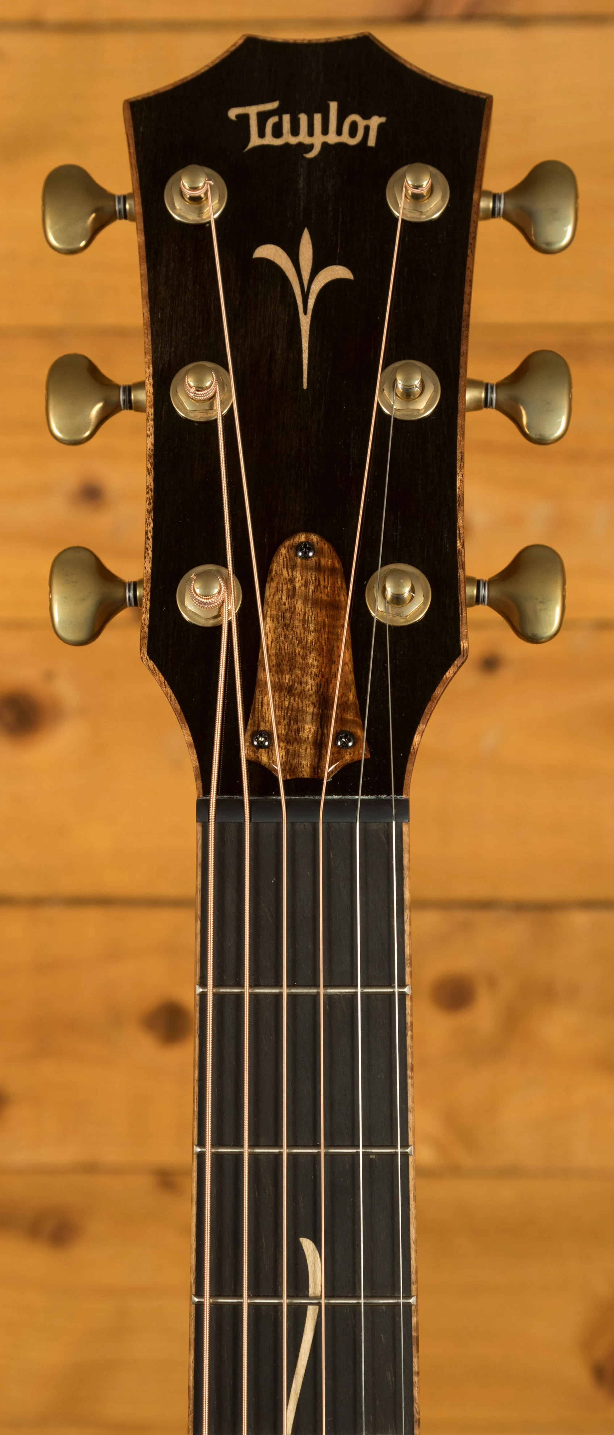 The captivating top of this guitar boasts stripy sinker redwood, a beloved choice for its origins. Sinker redwood soundboards are meticulously crafted from enormous old-growth redwood logs, recovered from the depths of Northern California rivers, some of which had been submerged for over a century. These soundboards exhibit a rich spectrum of colours, uniquely influenced by the silt and mineral-rich water. The age and size of these trees result in a tight grain with excellent cross-grain stiffness, yielding a bold, brilliant response complemented by warm overtones, akin to cedar but with an added brightness and headroom, often affectionately described around the Taylor community as "cedar on steroids." It's a perfect match with Honduran rosewood, prized for its resonant low-end and clear trebles, producing lush overtones that bloom as notes resonate. The redwood top, sourced from sunken California riverbeds, adds a touch of cedar-like warmth and sensitivity to touch, along with a substantial volume capacity that's perfect for dynamic playing. This guitar also features a beveled-style armrest for enhanced playability, along with exquisite appointments like a Simons back wedge, figured Hawaiian koa binding, and precision-engineered Gotoh 510 Antique Gold tuners.