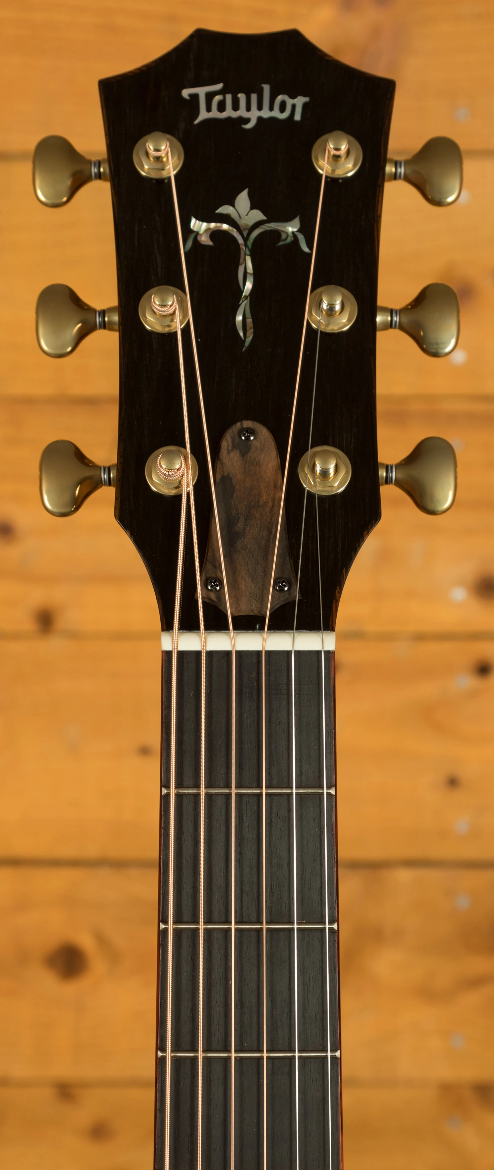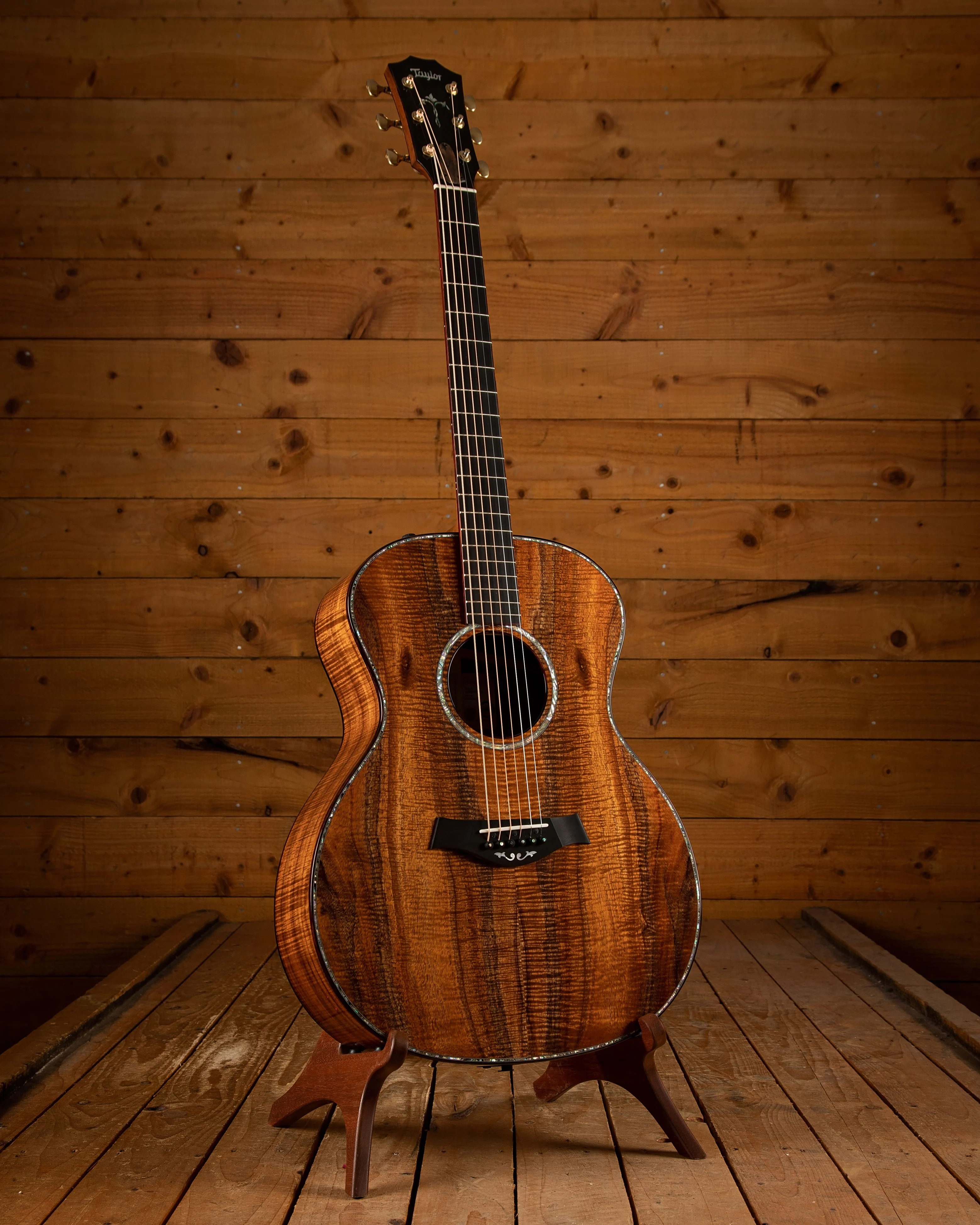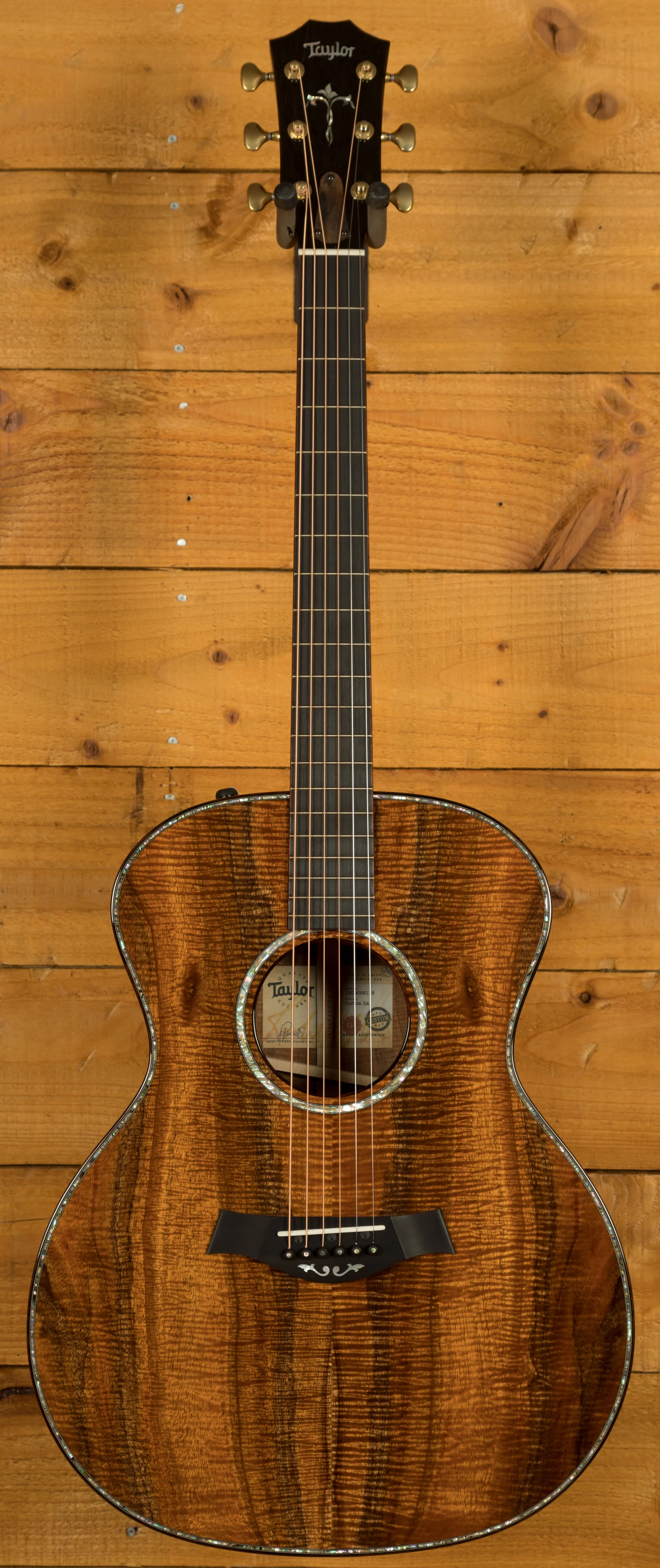 Aside from its exquisite top, this guitar boasts intricate abalone trim around the soundboard and for the rosette, cocobolo body binding, mother-of-pearl accents on the bridge and Taylor logo, as well as a captivating abalone peghead inlay and ebony bridge pins adorned with abalone dots. The tuners are high-quality Gotoh 510s in an Antique Gold finish, ensuring excellent pitch stability.