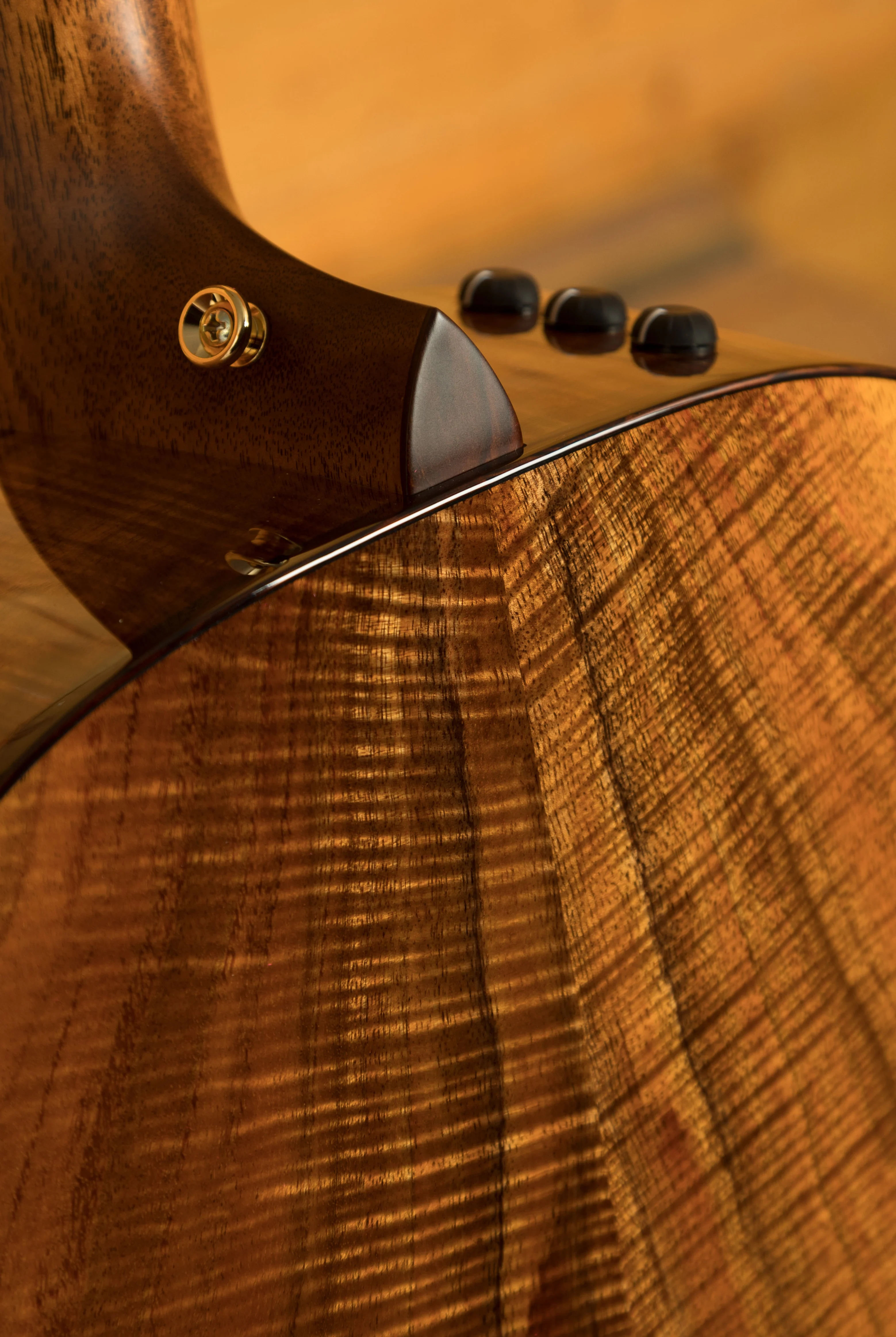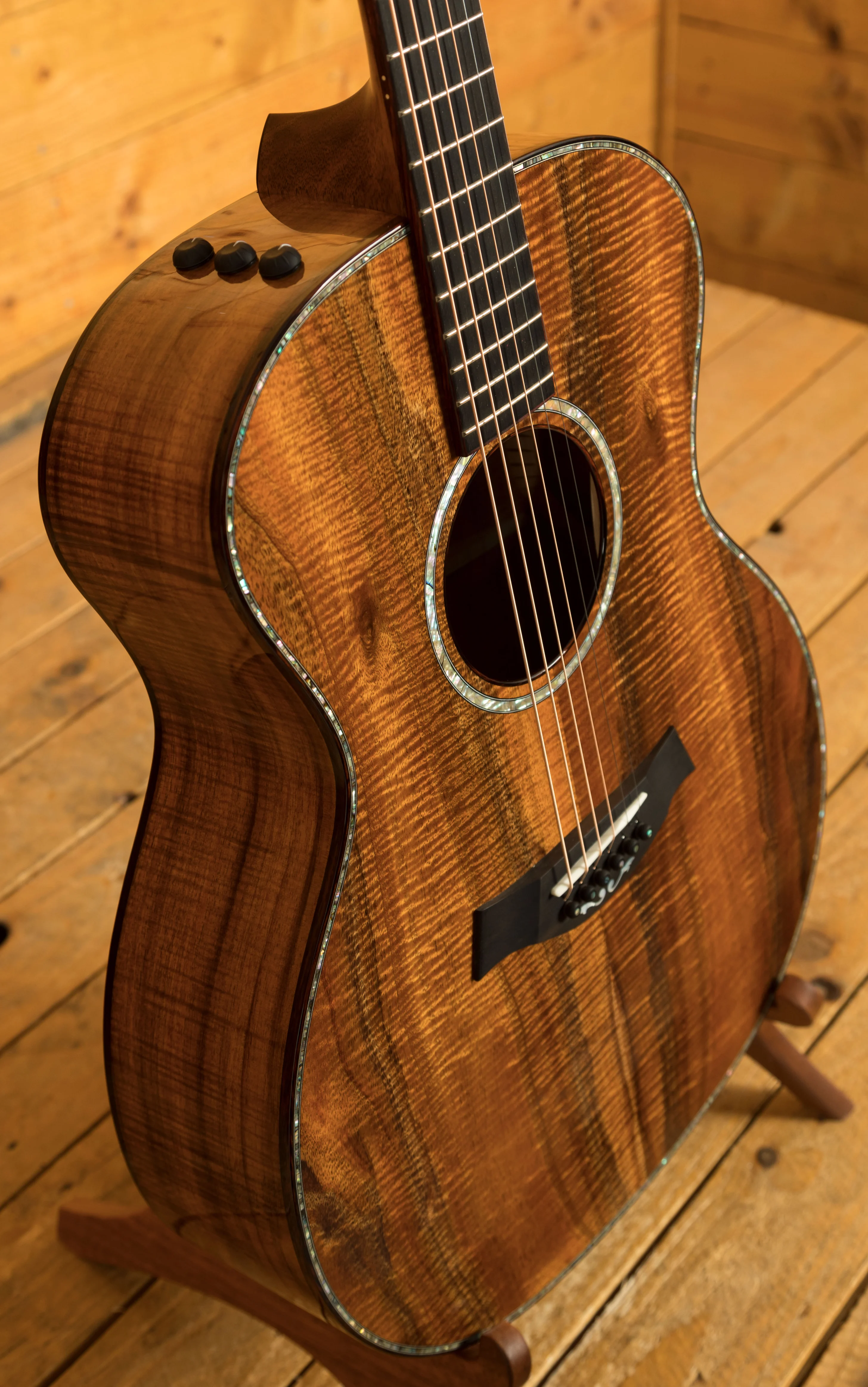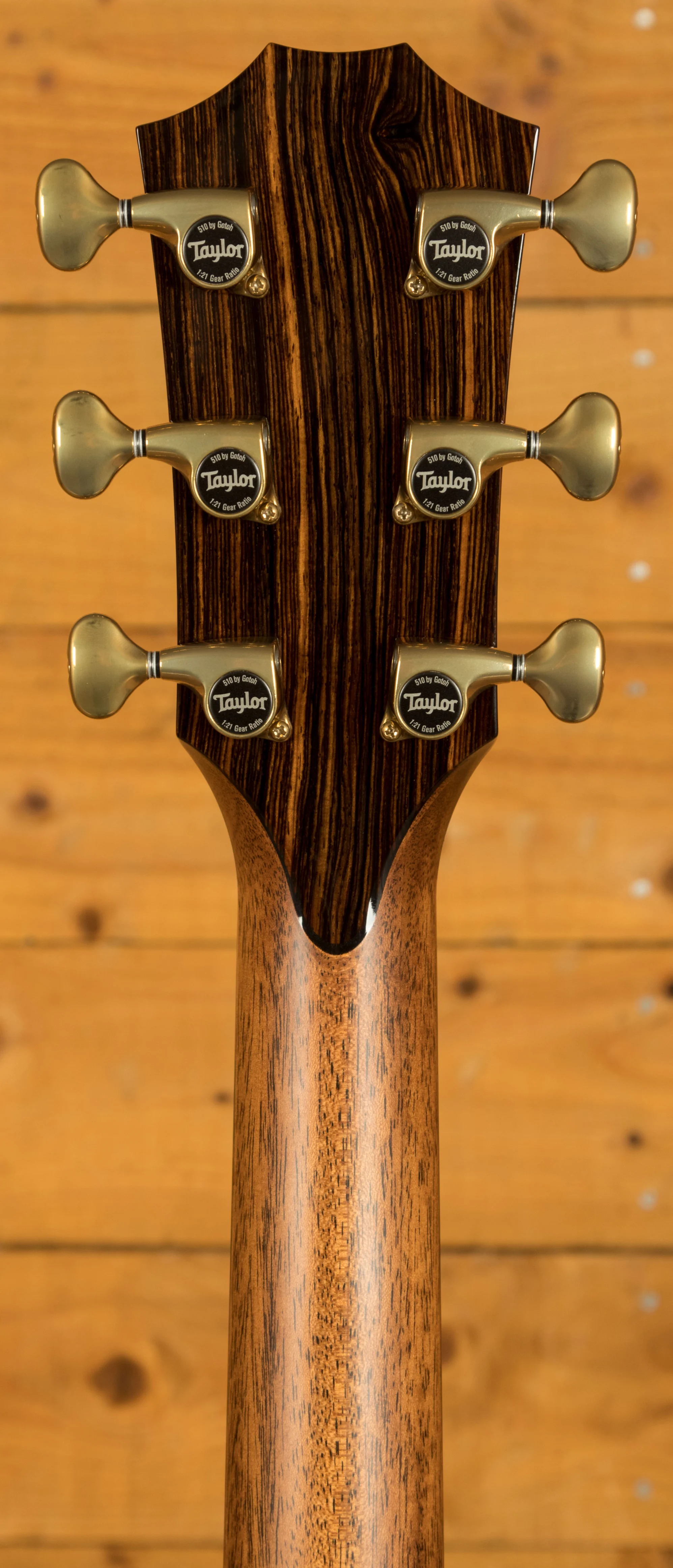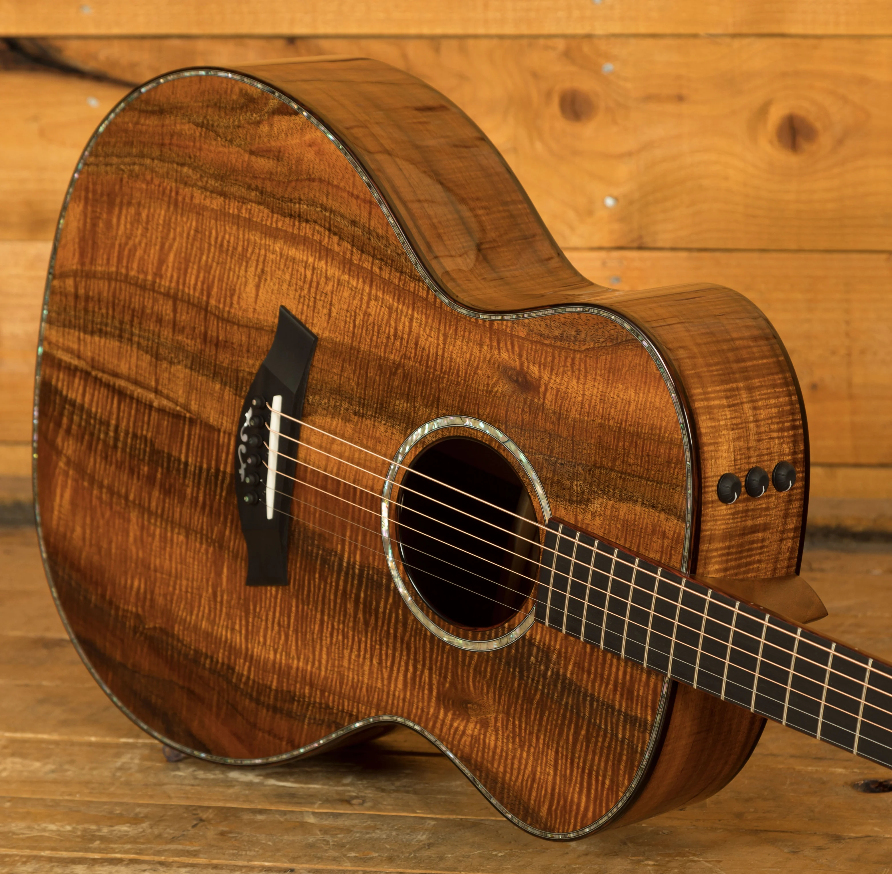 Aside from its exquisite top, this guitar boasts intricate abalone trim around the soundboard and for the rosette, cocobolo body binding, mother-of-pearl accents on the bridge and Taylor logo, as well as a captivating abalone peghead inlay and ebony bridge pins adorned with abalone dots. The tuners are high-quality Gotoh 510s in an Antique Gold finish, ensuring excellent pitch stability.