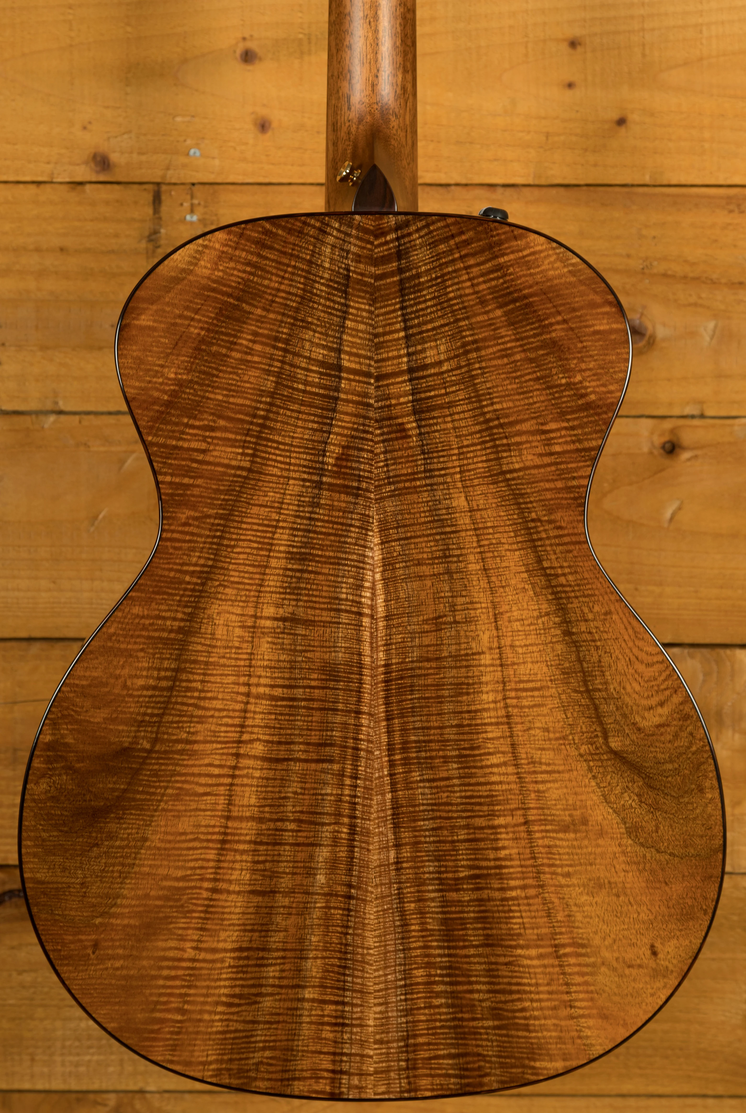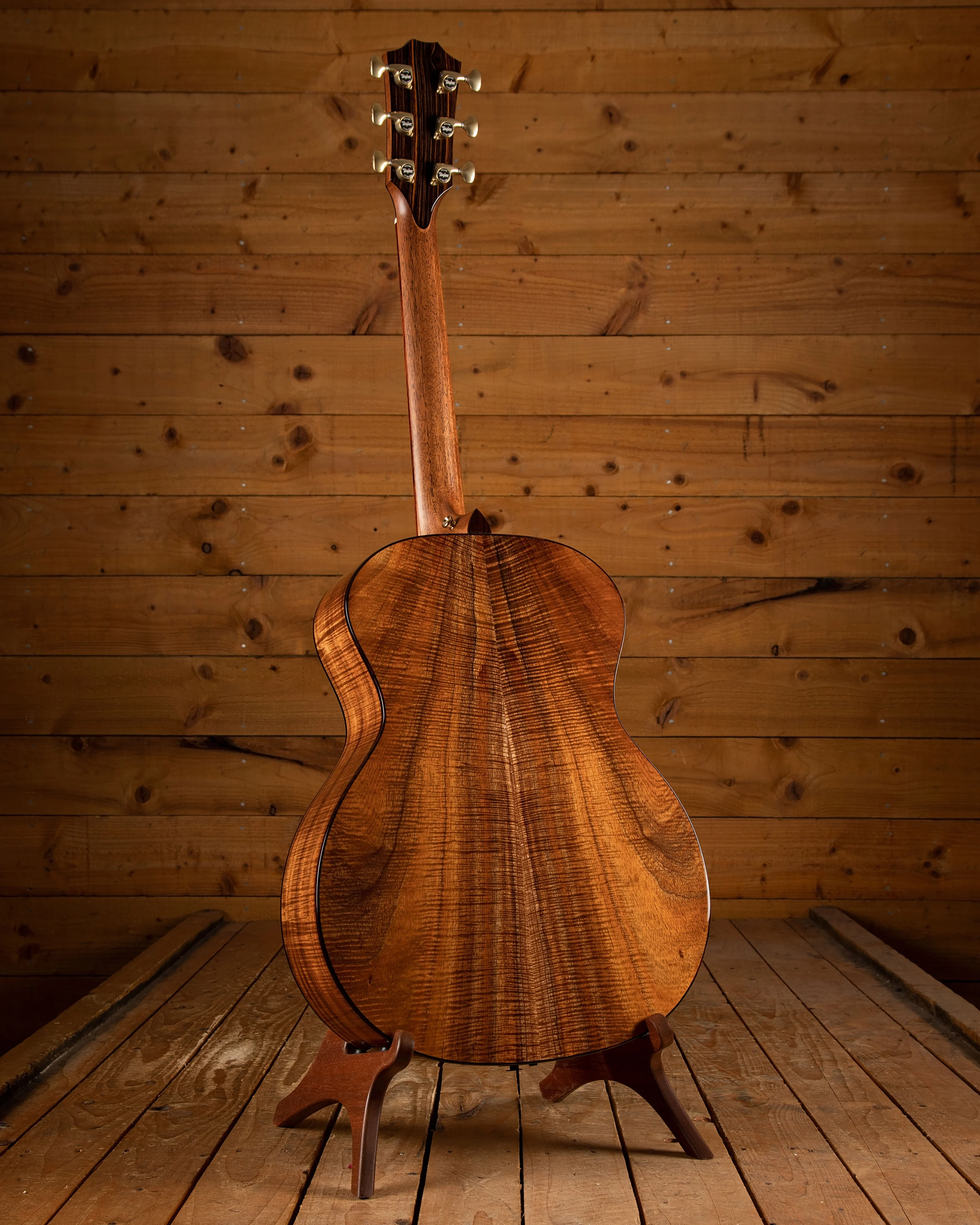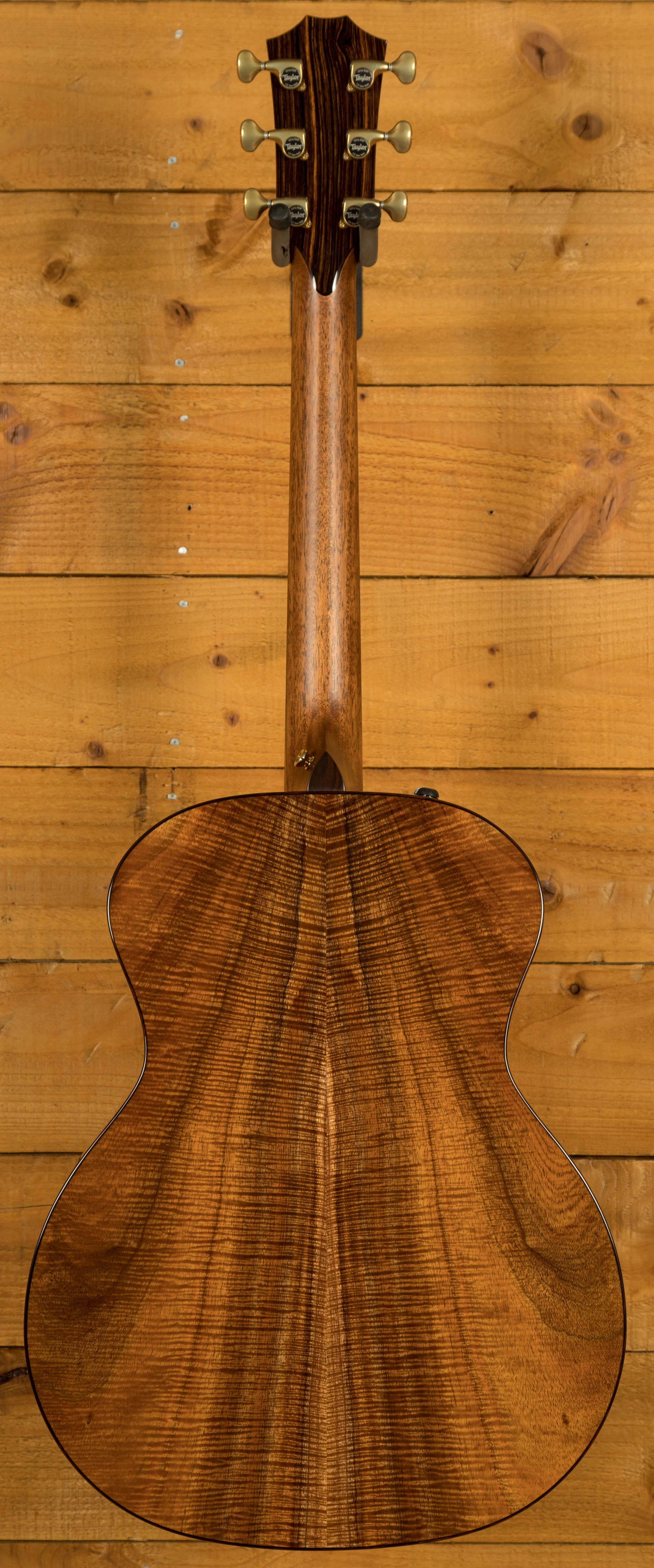 The body wood of this guitar is the stunning AA Hawaiian Koa. Hawaiian Koa, a dense tropical hardwood, combines midrange focus with added top-end brightness and resonance. As a koa guitar, especially an all-koa one, is played and matures, its midrange overtones gradually infuse warmth and sweetness into its sound. Koa's tonal character blends the midrange of mahogany with the bright top end of maple. Initially, a new koa guitar may sound a bit bright and tight, akin to maple, due to its density. However, as it's played, the sound opens up, enriching the midrange and providing a more resonant, sweet, and full tone. Sometimes, a player looking for a warmer tone may experiment with different pick materials, especially if they have a brighter playing style. Hawaiian koa has consistently captivated guitarists with its distinctive blend of rich acoustic sound and naturally striking visual allure. Players will appreciate a vibrant midrange response, clear and articulate trebles, and a touch of low-end warmth for a well-balanced sound that adapts to various playing styles. The hardwood koa top produces a warmer and darker response compared to a spruce top. With the inclusion of V-Class bracing, this guitar not only records and amplifies exceptionally well but also delivers an exceptional visual experience. Taylor's revolutionary V-Class bracing acts as the sonic engine, reshaping the sound to achieve more volume and sustain, along with improved tuning from top to bottom.