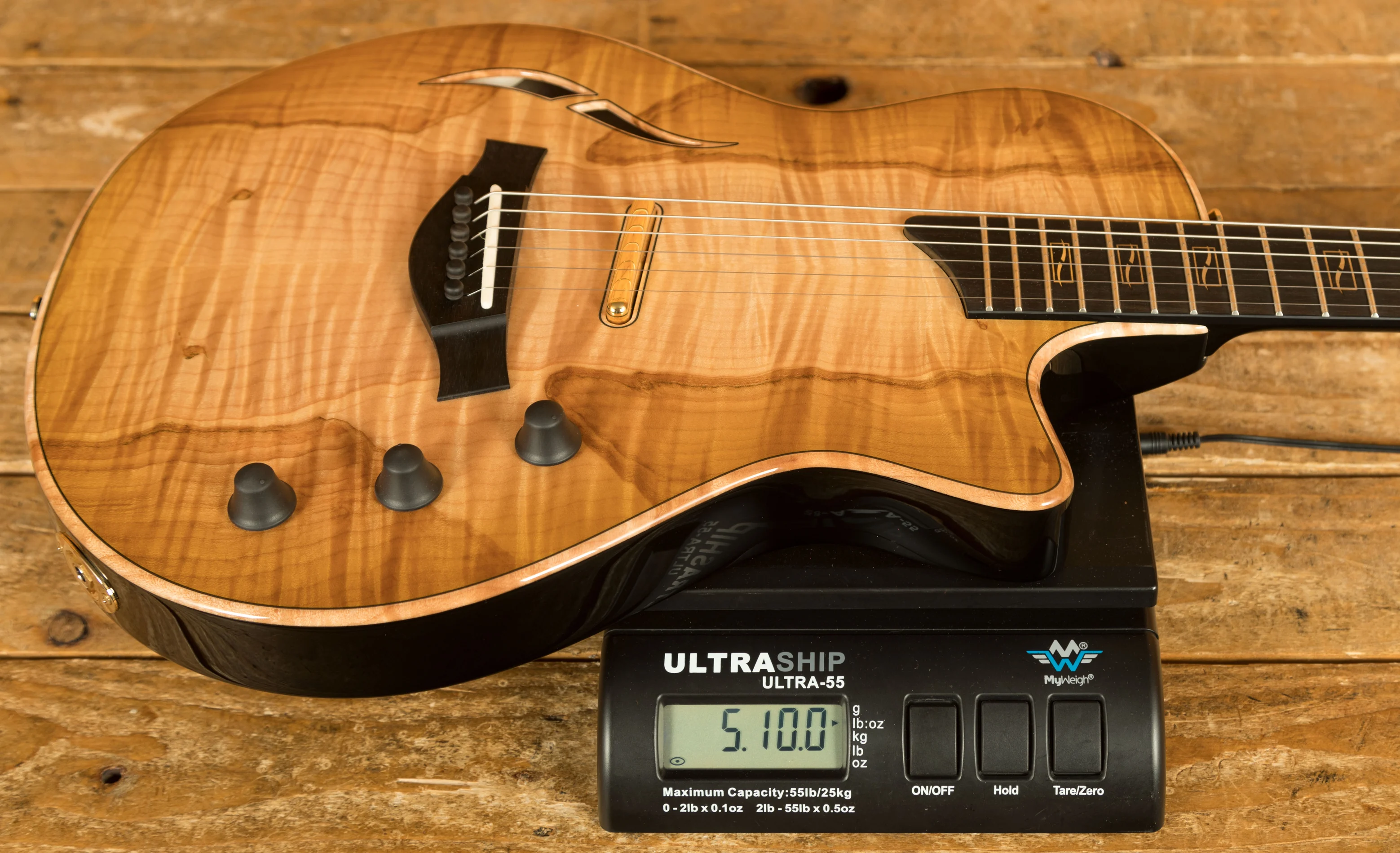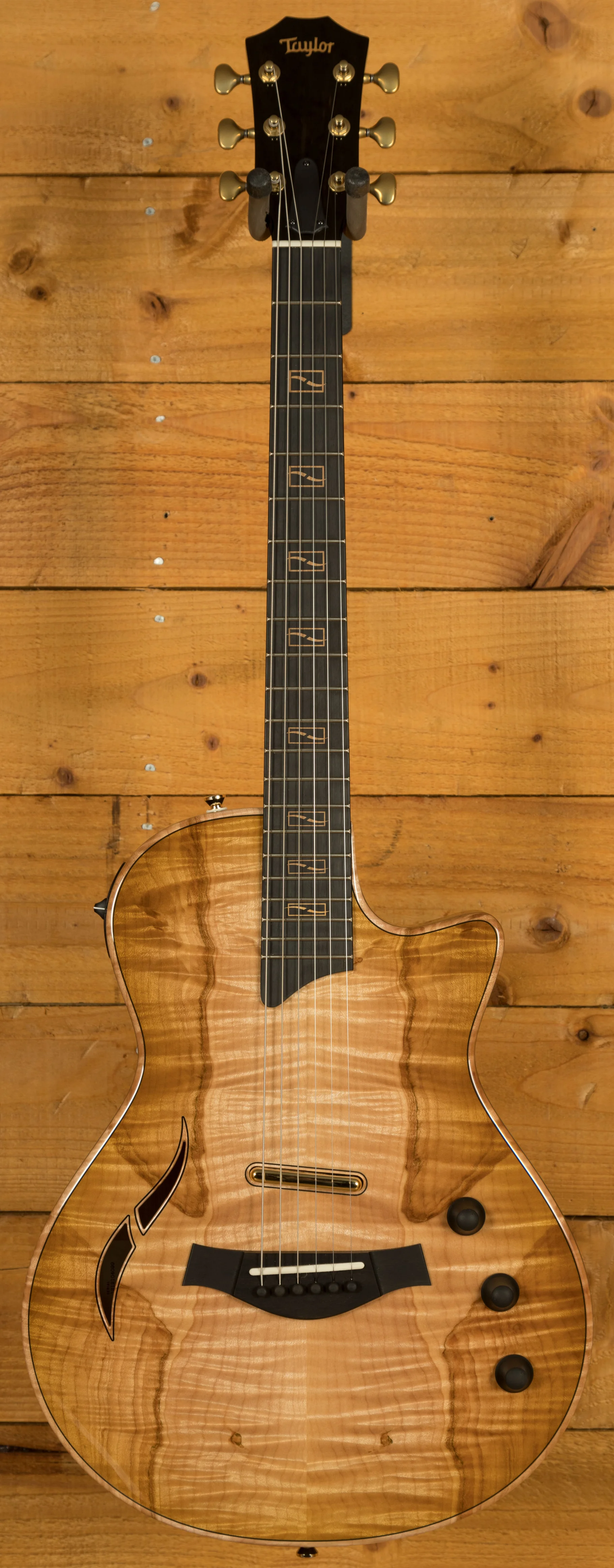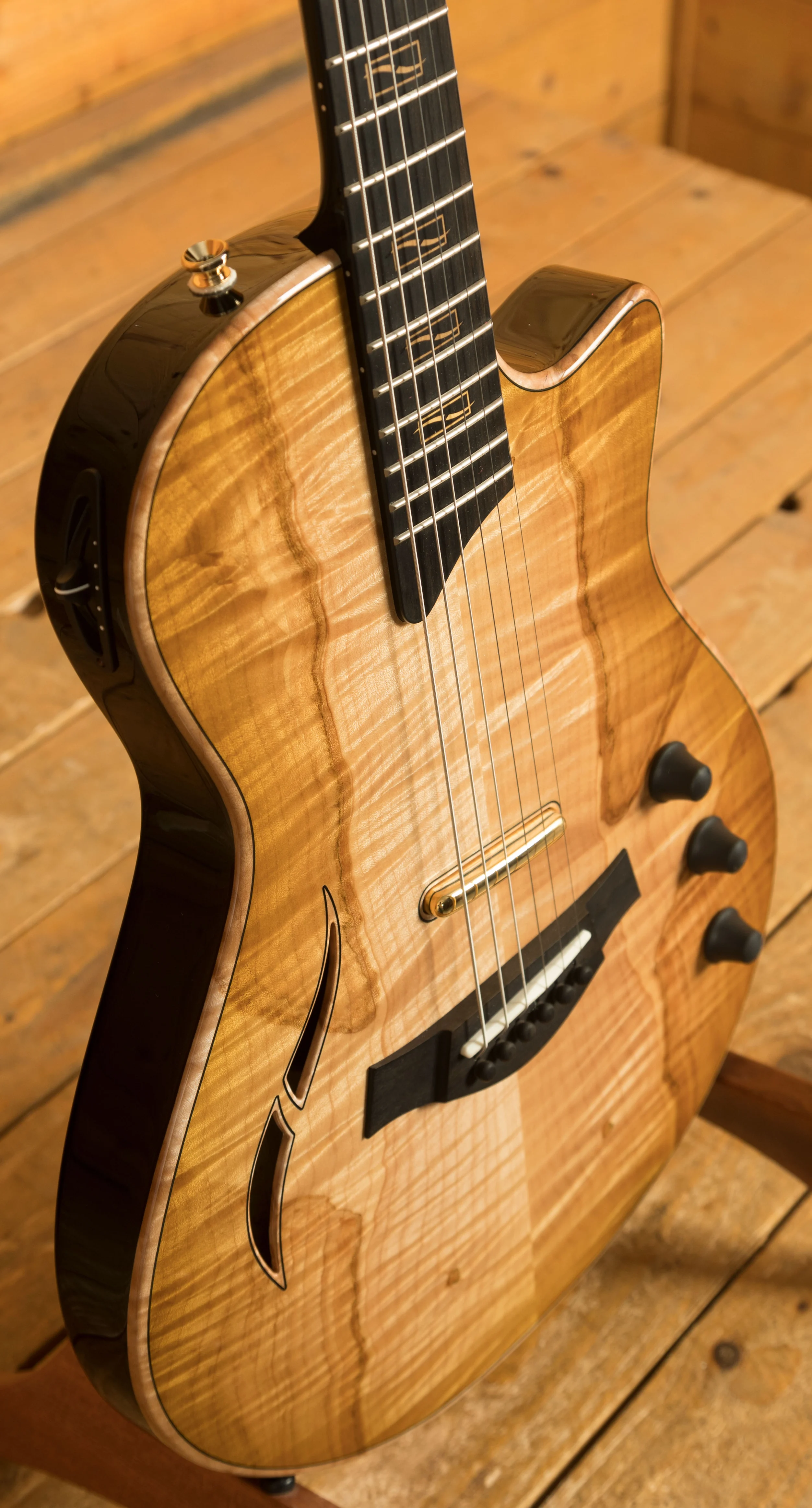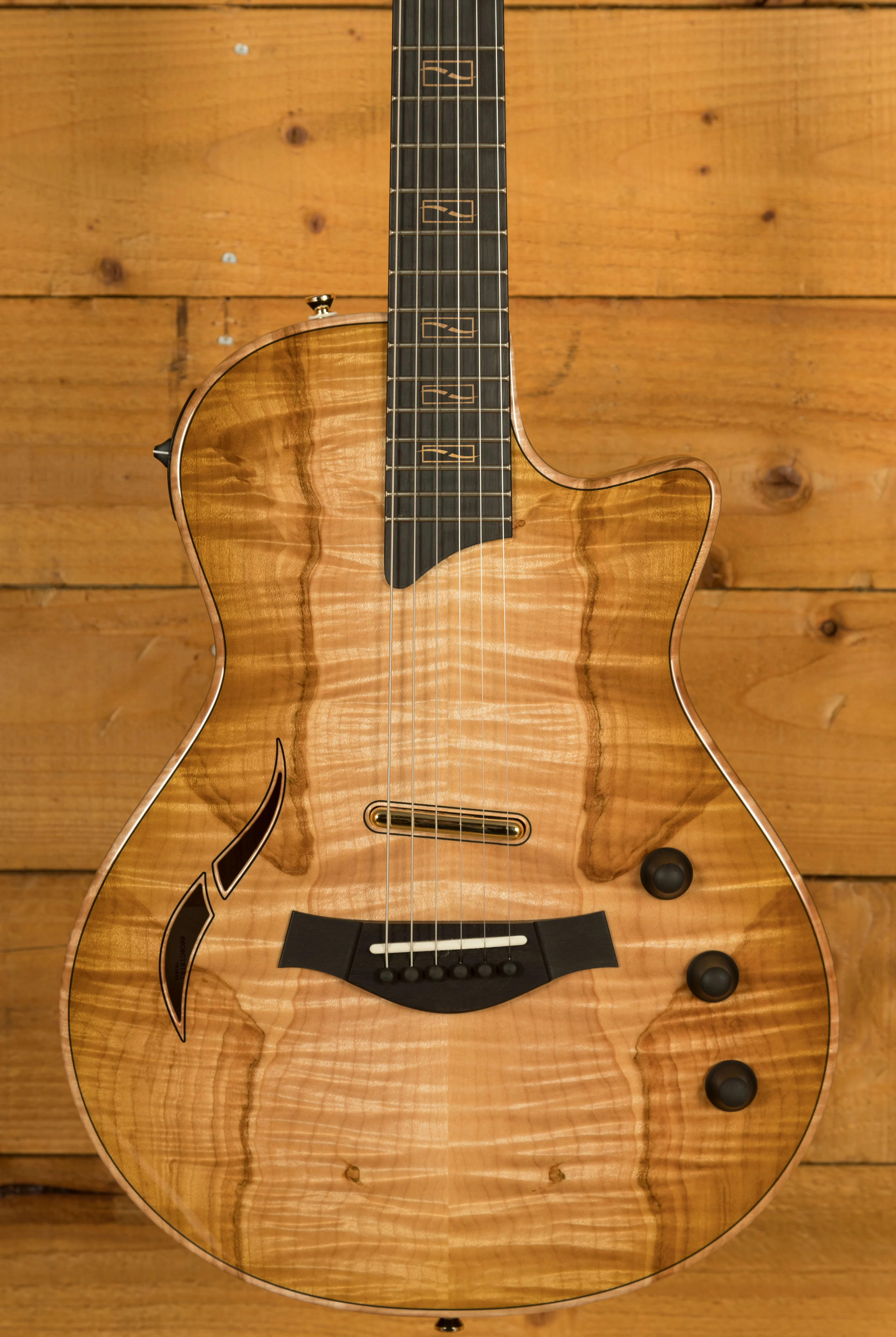 The Taylor Custom #27 T5z is a versatile hybrid hollowbody guitar designed for musicians who need both acoustic and electric tones in one instrument. Its lightweight shamel ash body, responsibly sourced from Southern California, provides excellent resonance and sustain. The antique blond Big Leaf maple top features unique heartwood on both the bass and treble sides, giving the guitar a distinctive aesthetic. Designed for comfort, it includes rounded body edges, an integral armrest, and a slim mahogany neck with jumbo frets for effortless playability.