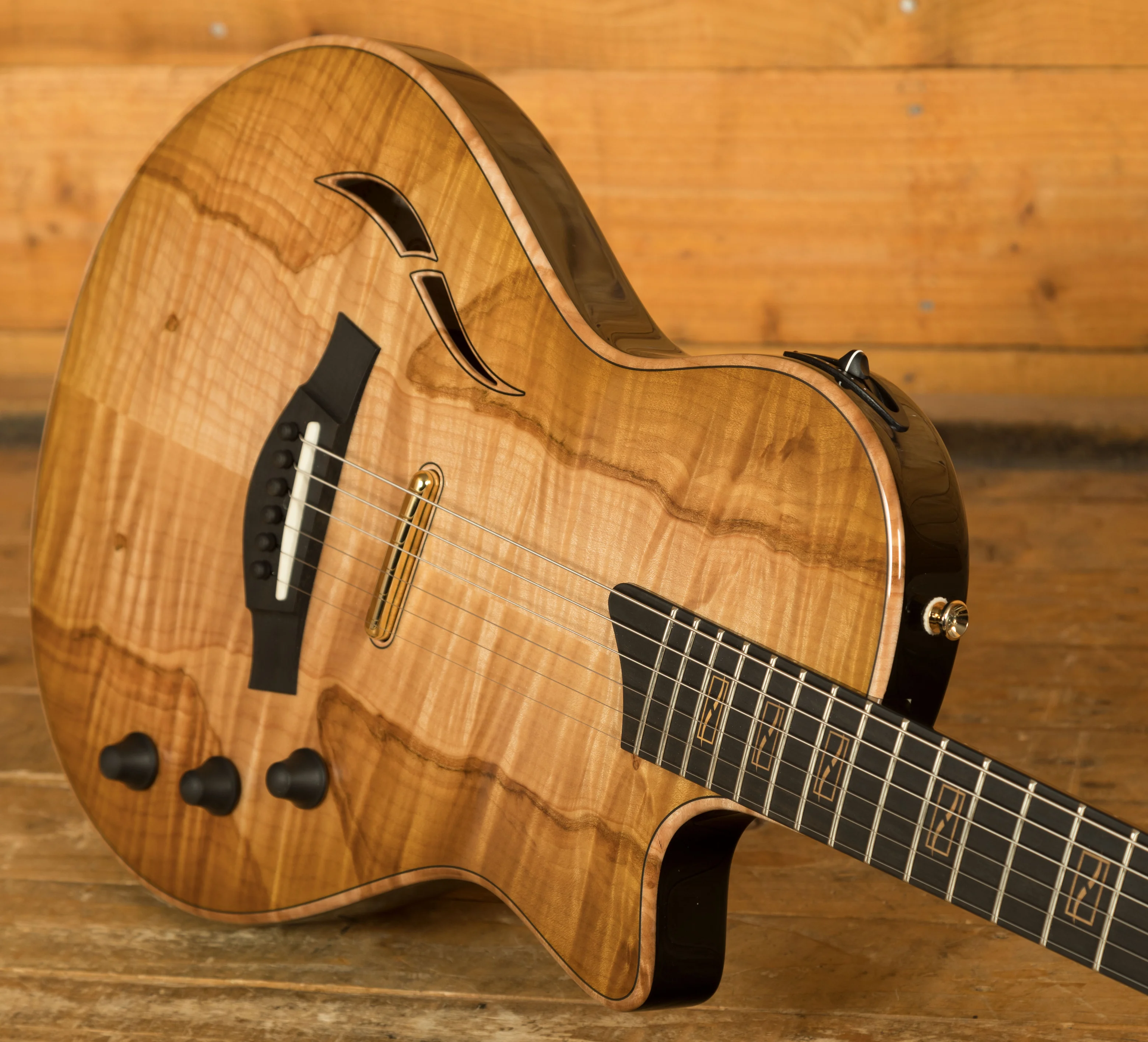 Custom aesthetic details further elevate the T5z’s appeal. The boxwood peghead logo and Boxed Wave fretboard inlays add a refined touch, while the high-gloss finish enhances the wood’s natural beauty. Premium Gotoh 510 antique gold tuners provide exceptional tuning stability and smooth operation. The guitar ships in a brown deluxe hardshell case for reliable protection and transport.