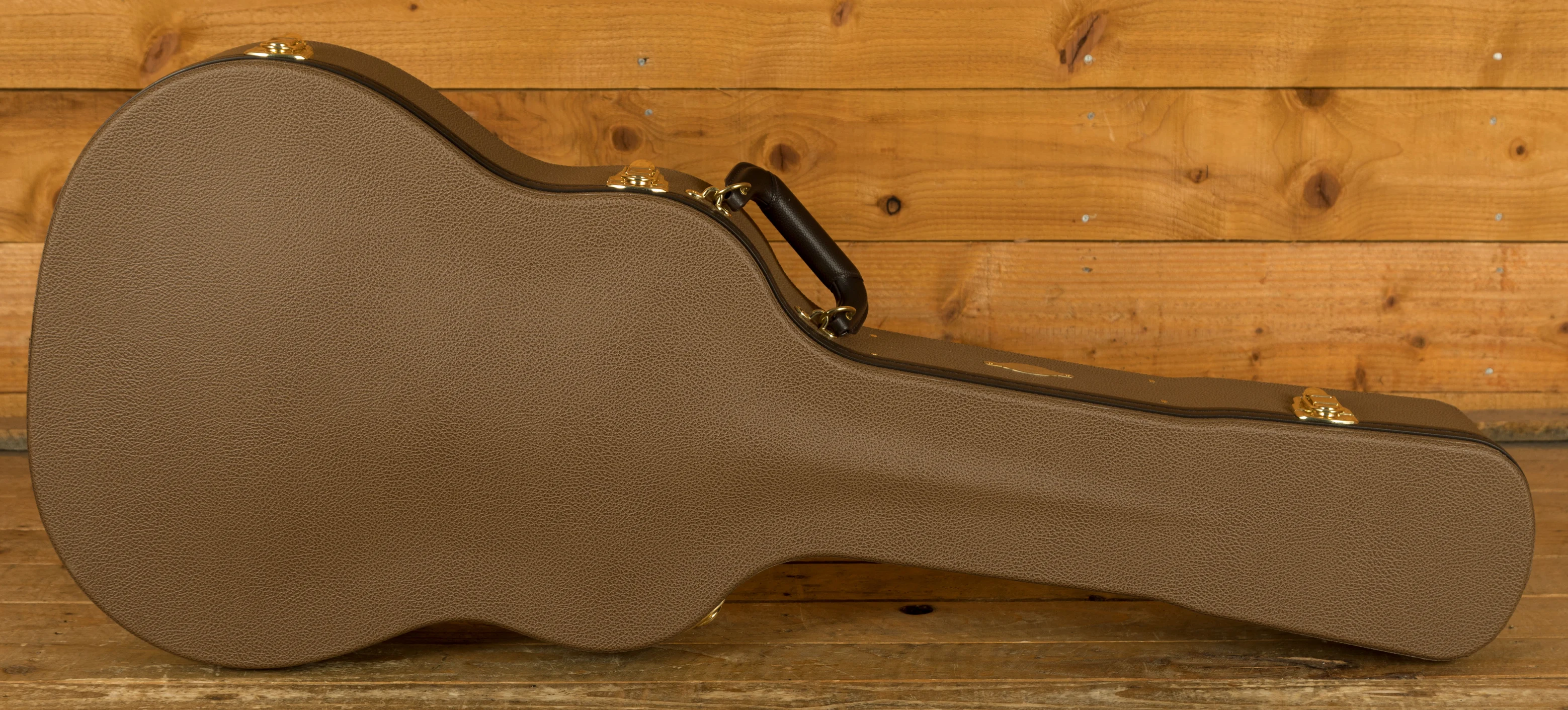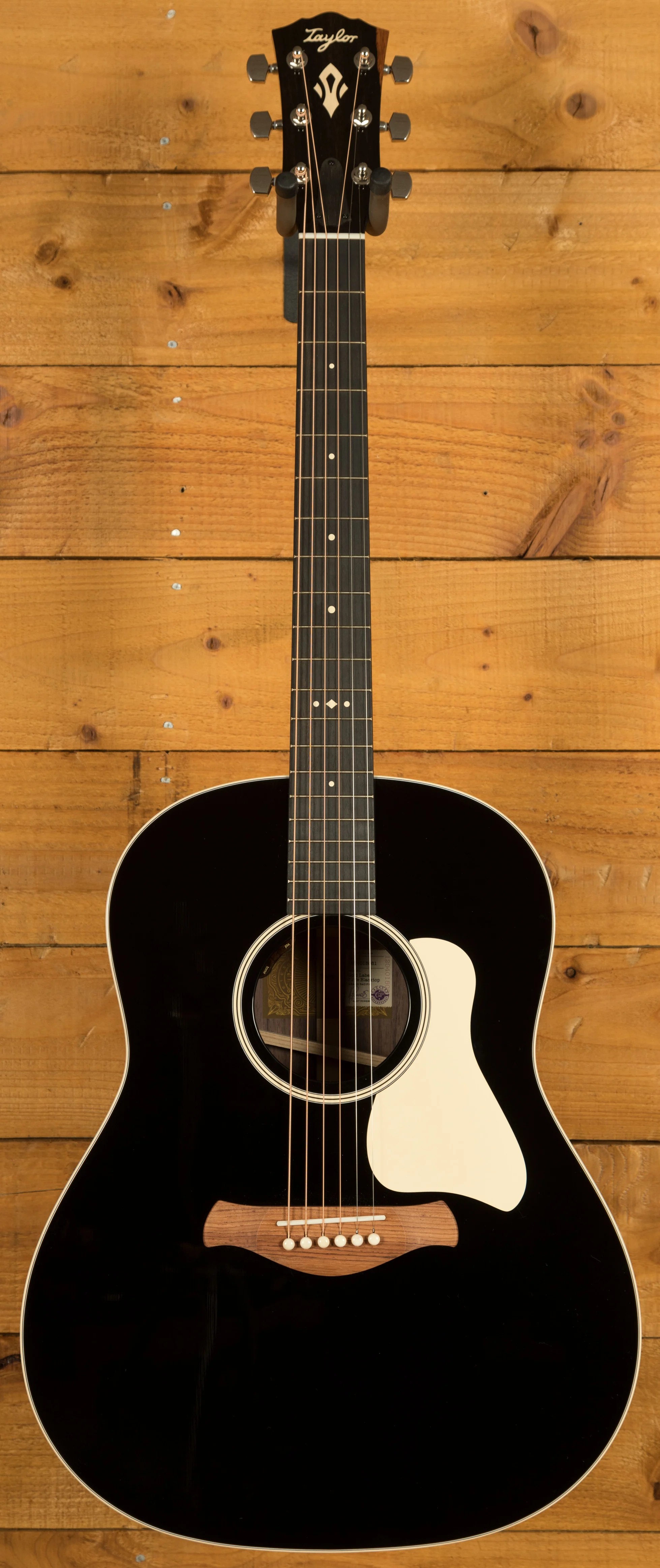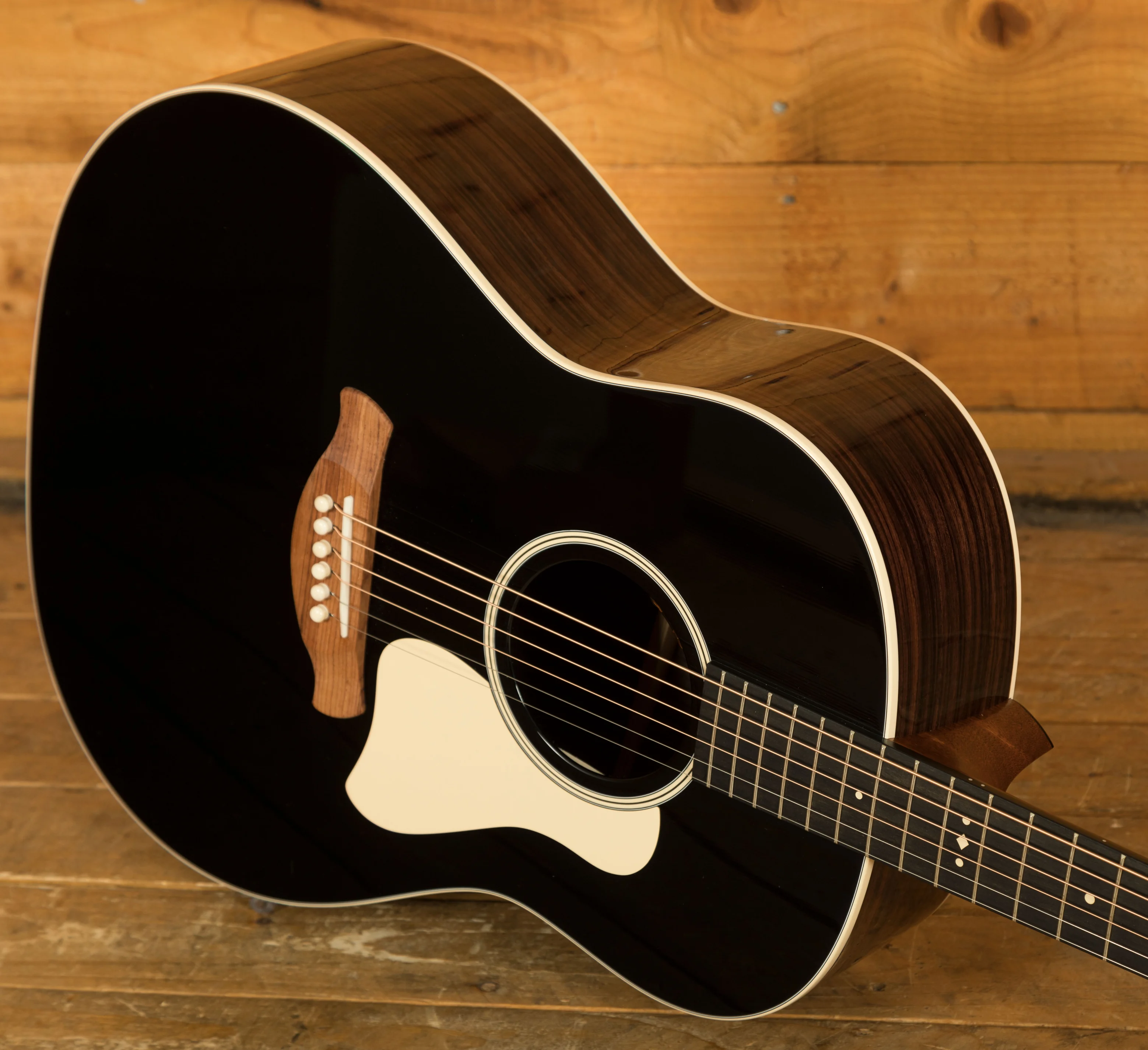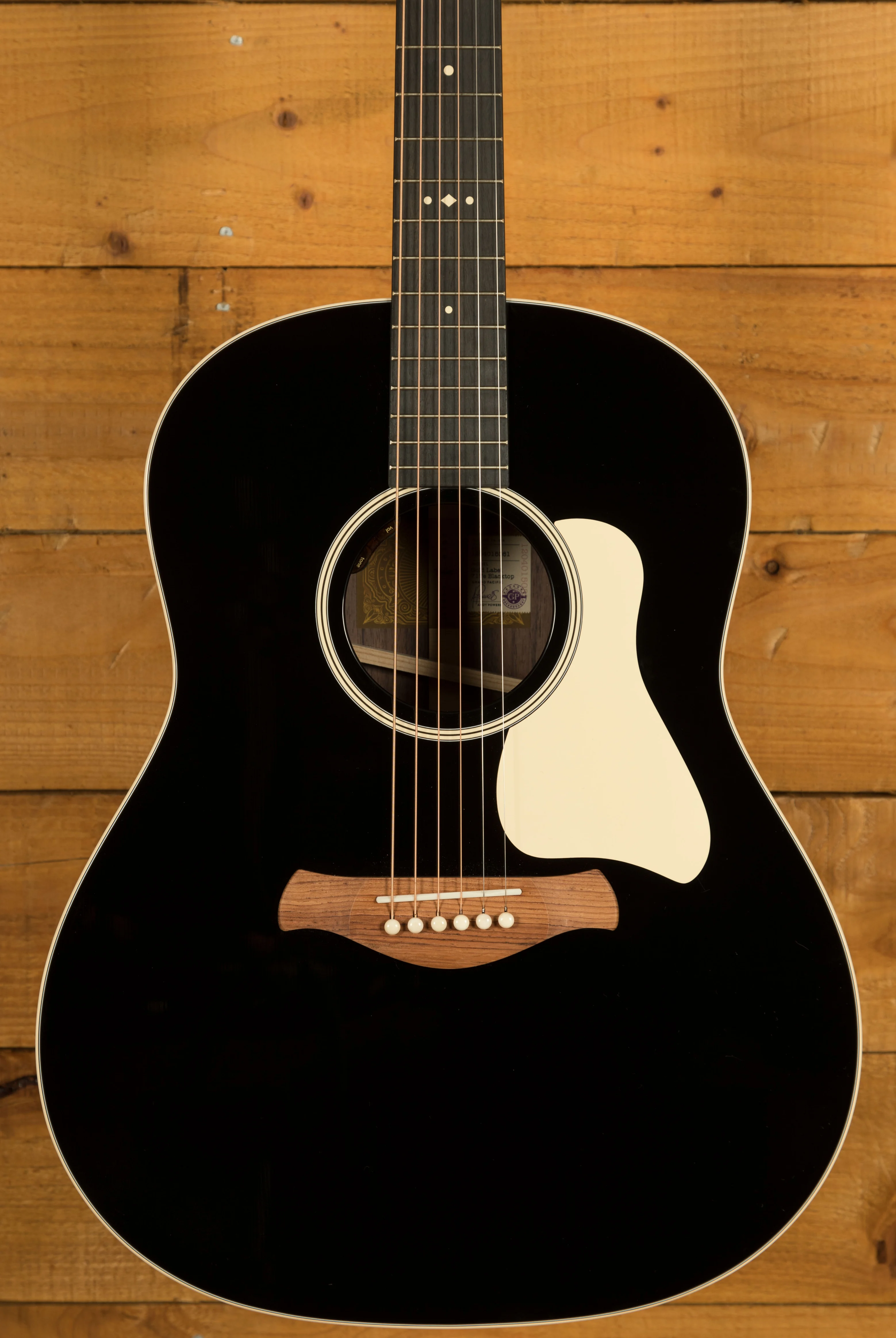 Visually, the full-gloss blacktop finish makes a bold statement, complemented by cream binding, a cream pickguard, and Crest inlays on the fretboard and headstock. The Honduran rosewood Curve Wing bridge and Indian rosewood bridge pins add boutique flair. Plug in with confidence thanks to the LR Baggs Element VTC pickup, and carry it in style with the included British Cocoa deluxe hardshell case.