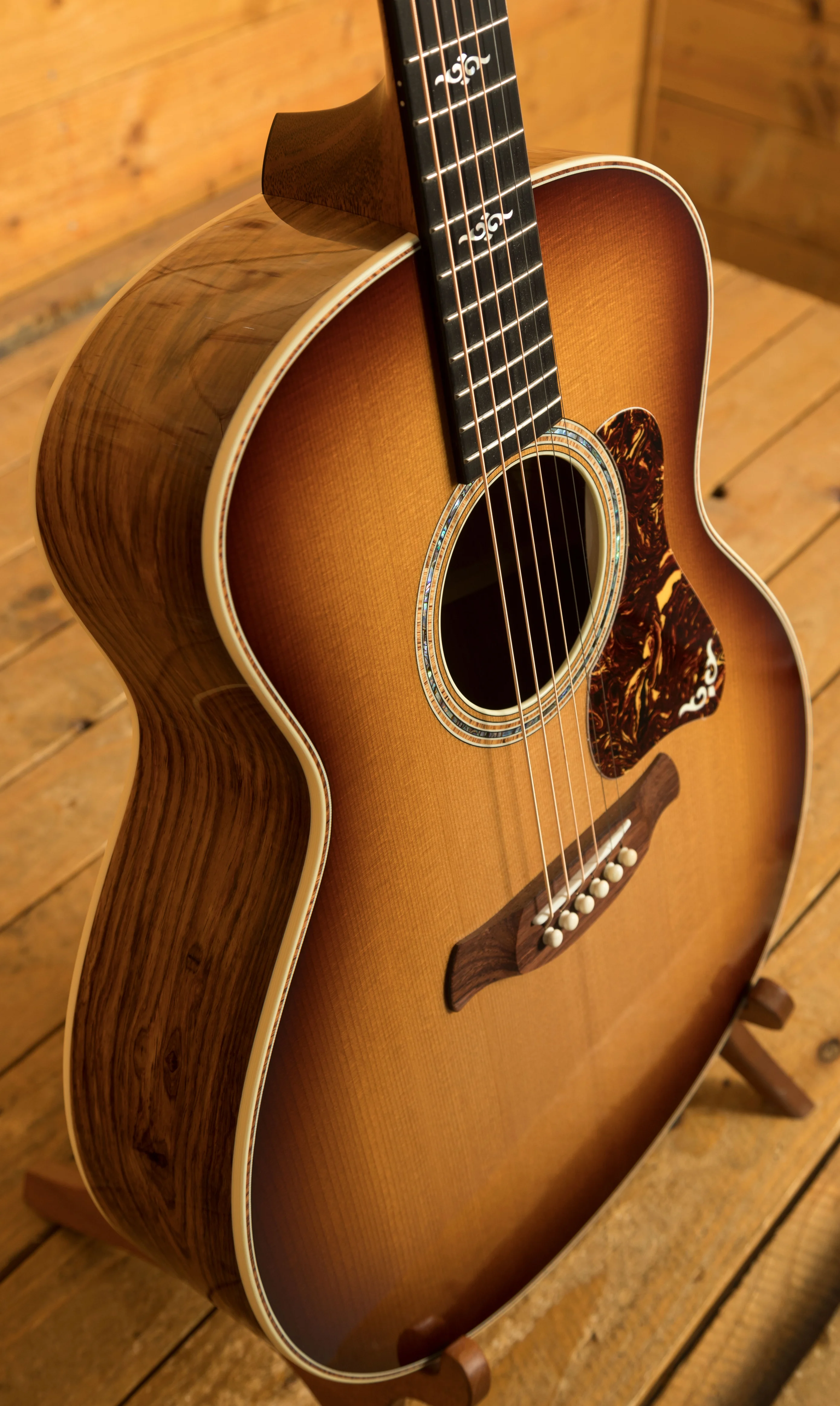 The 814e SB features the same innovative design elements found in all Gold Label models: the Super Auditorium body shape, Fanned V-Class bracing, and long-tenon neck joint. These features combine to create a powerful, resonant sound with exceptional clarity, sustain, and dynamic range. The fanned bracing, applied with hot hide glue, contributes to the guitar's open, airy tone.