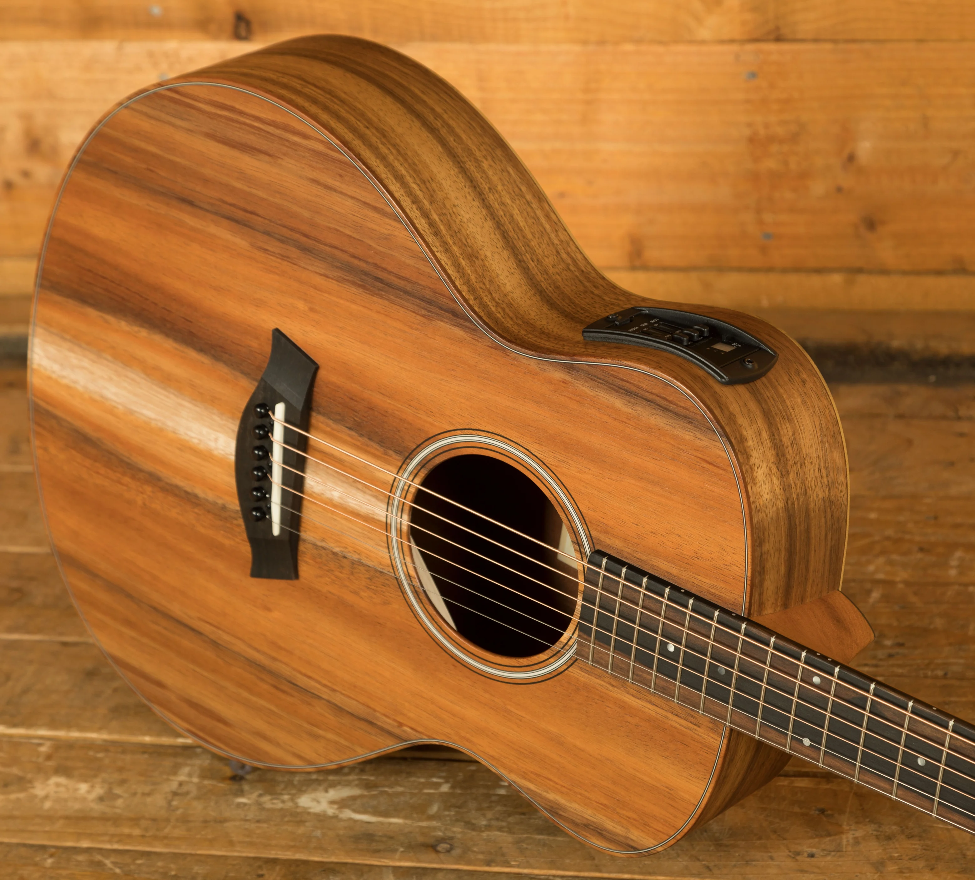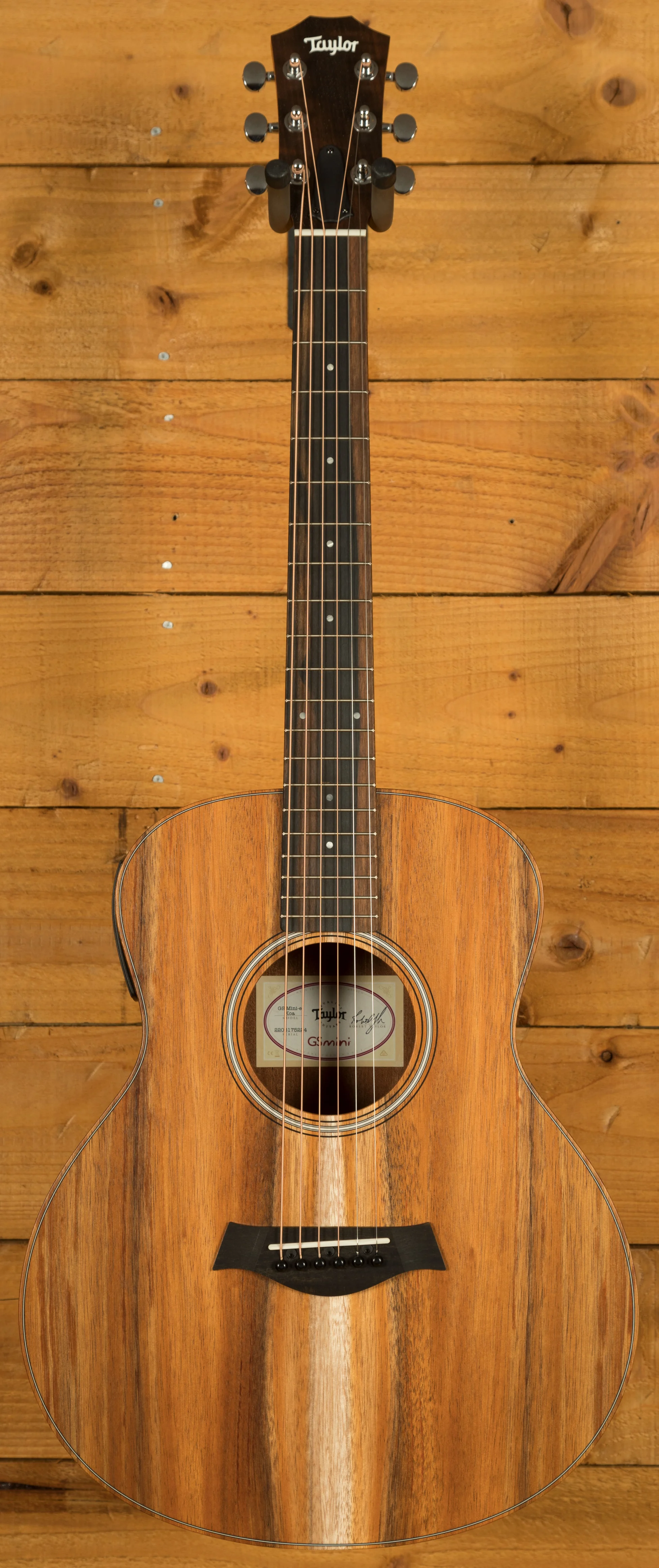 The GS Mini-e Koa brings the vibrant sound and organic beauty of Hawaiian koa to Taylor's ultra-popular reduced-scale acoustic guitar. The GS Mini's compact proportions make it a great choice for players who take their music on the road, and with a solid koa top, this model serves up a rich, bold sound that punches well above its weight for a smaller guitar. The built-in ES-B pickup offers clear, natural amplified tone and includes a digital tuner with an easy-to-read LED display. The GS Mini-e Koa ships with a structured gig bag.