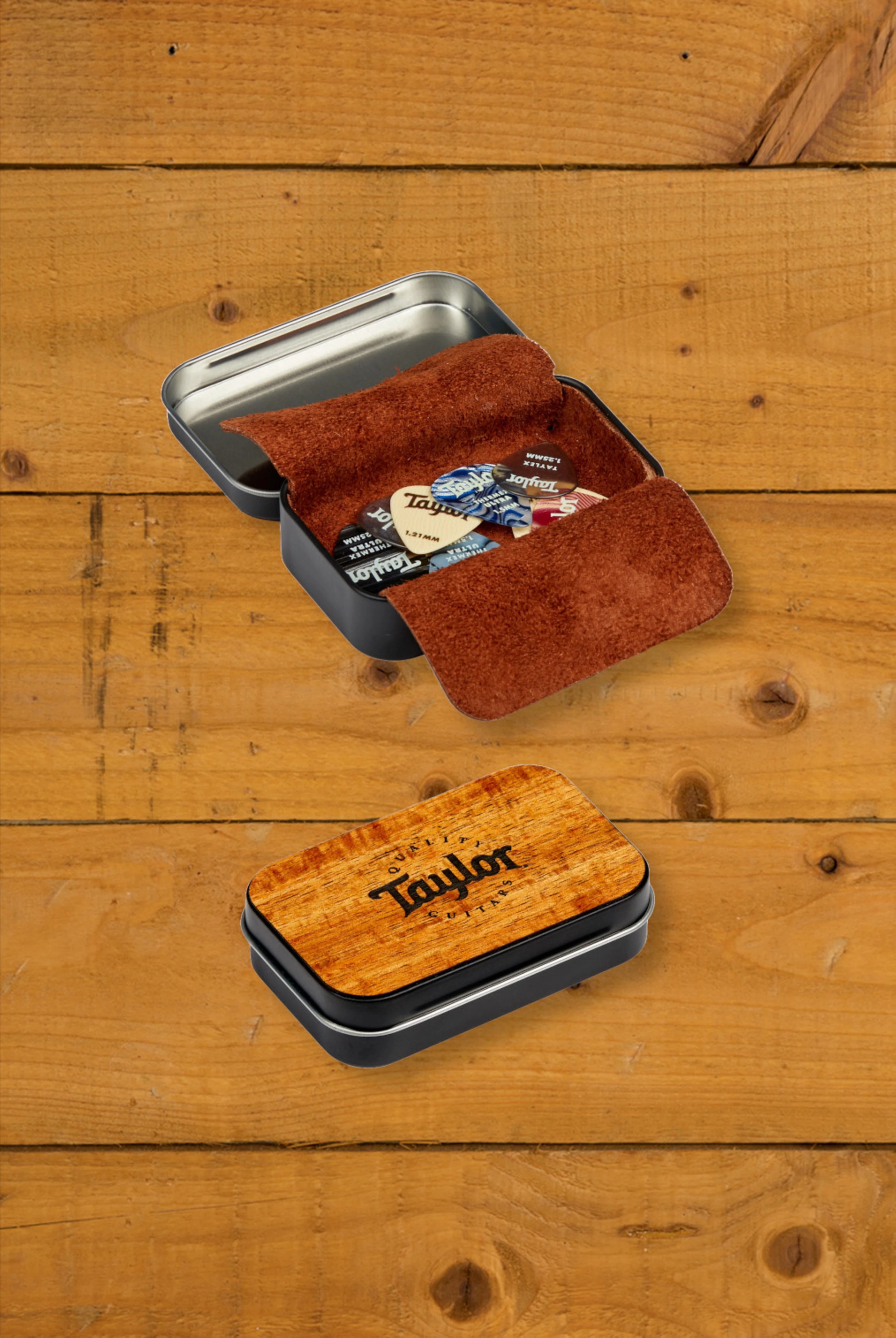 Since the guitar pick as we know it was introduced in 1922, players have been choosing their picks almost entirely on function and feel. Taylor has rethought every aspect of pick design for these DarkTone Series guitar picks, offering players a wider range of musical colours with new materials that emphasise different parts of the frequency range. This sample pack features one pick from each DarkTone family, with varying sizes and materials so that you can experiment with the array of sonic textures that your guitar can produce. Try these tone-enhancing picks and hear what you've been missing. This Collector's Edition DarkTone pick pack features a genuine Hawaiian koa wood top and classic brown leather lining. As functional as it is beautiful, this pick tin is a striking addition to any space where you make music.