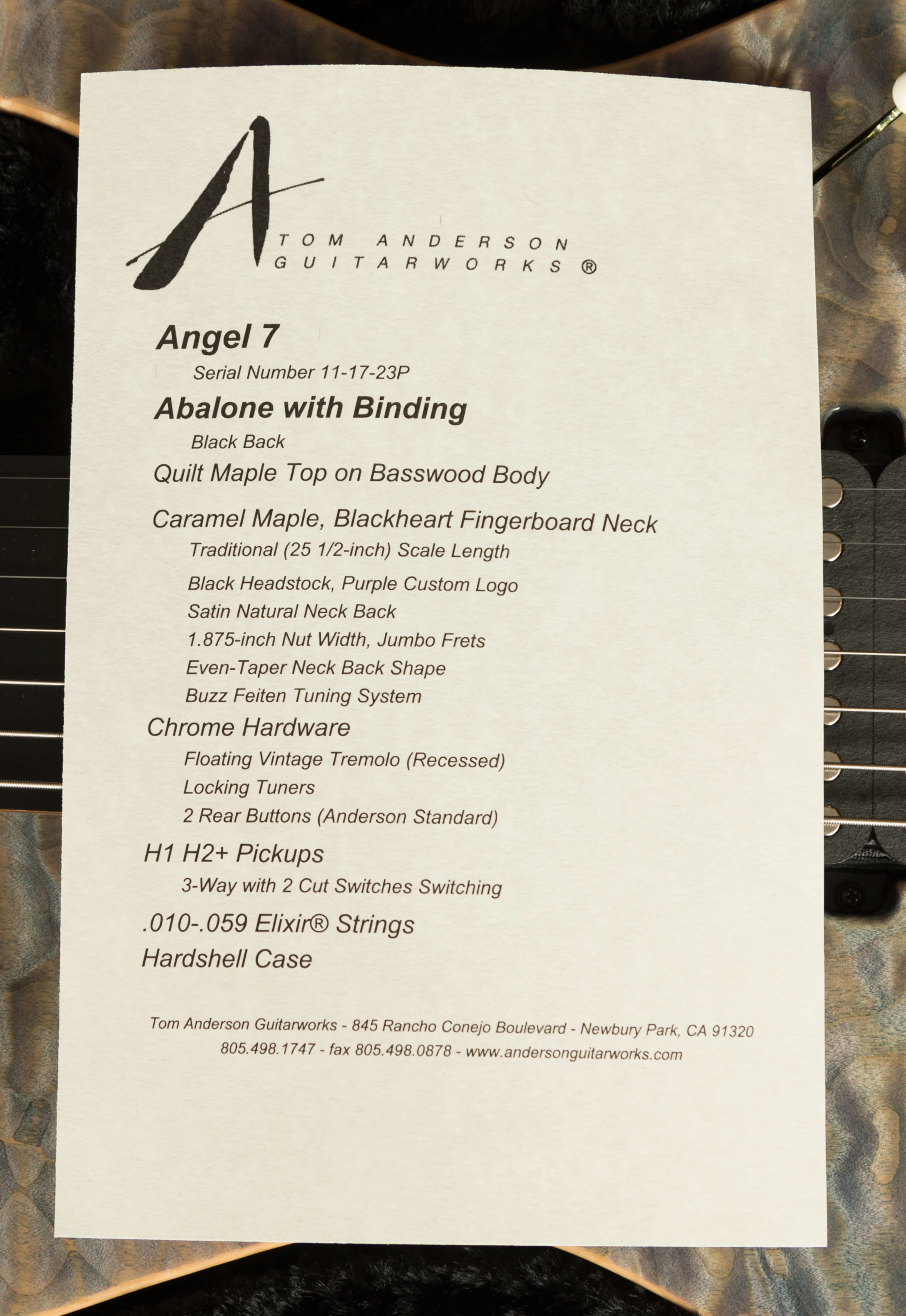 With a beautiful Quilt Maple top on a killer Basswood body this Angel 7 is super rich and incredibly resonant. Finished in a vibrant Abalone finish, it really shimmers like the wings of an Angel. Vibrant yet understated. It even features some slick body binding for extra visual goodness! Tom Anderson guitars always look a cut above.