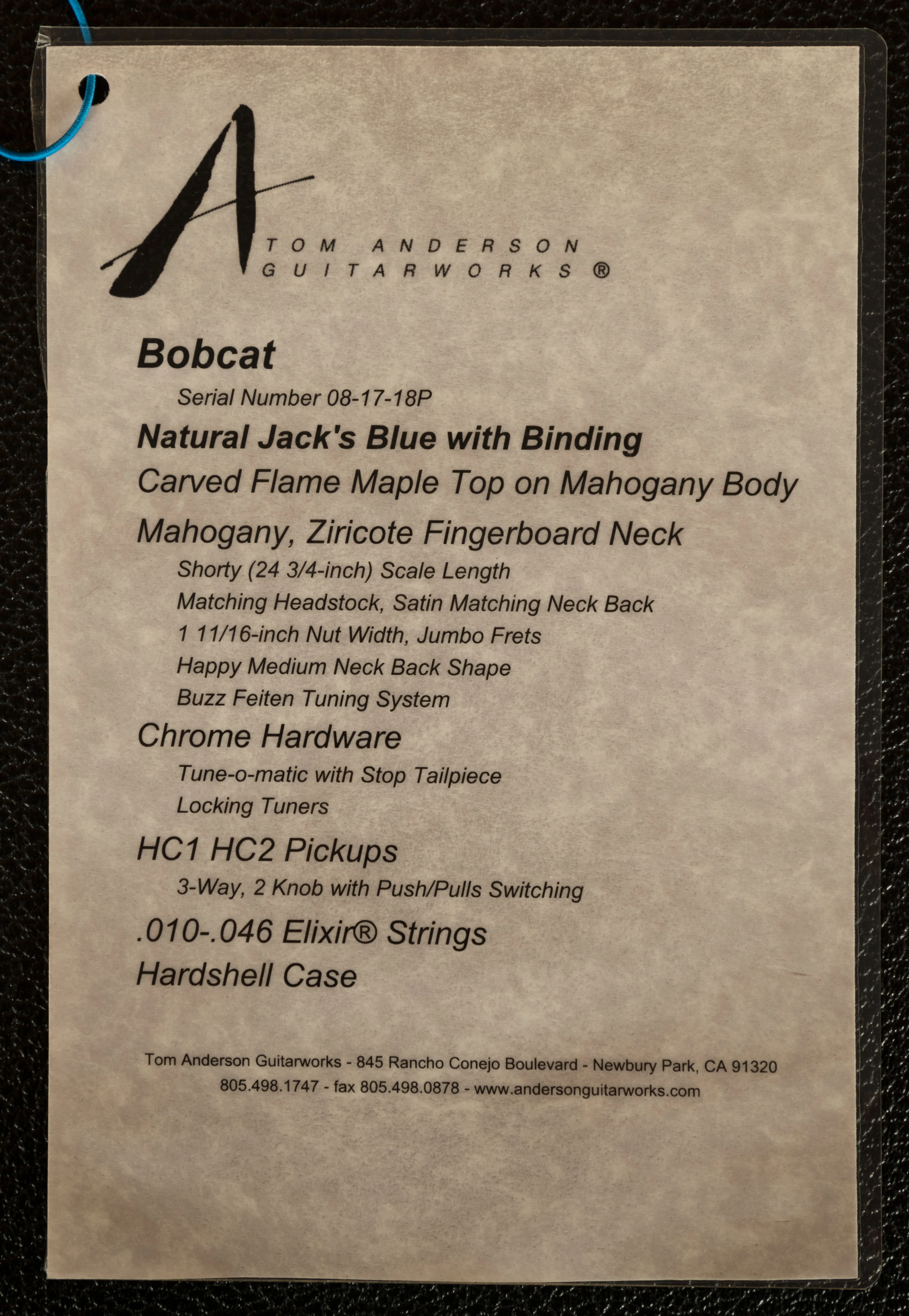 Unleash the sonic versatility of this Tom Anderson Bobcat in Natural Jack's Blue, handcrafted on August 17, 2018, at Tom Anderson Guitarworks in California. A standout in Anderson’s lineup, this guitar features a carved flame maple top over a mahogany body, finished in a striking Natural Jack's Blue with binding that highlights the wood’s natural beauty with a subtle, elegant edge. The mahogany neck, paired with a ziricote fingerboard, offers a short 24 3/4-inch scale length, a Happy Medium profile for comfortable playability, a 1 11/16-inch nut width, and jumbo stainless steel frets for effortless bends and solos. In gigged condition with a few scuffs but nothing major, this Bobcat shows light wear from live use, adding character without compromising its stunning appearance or performance.