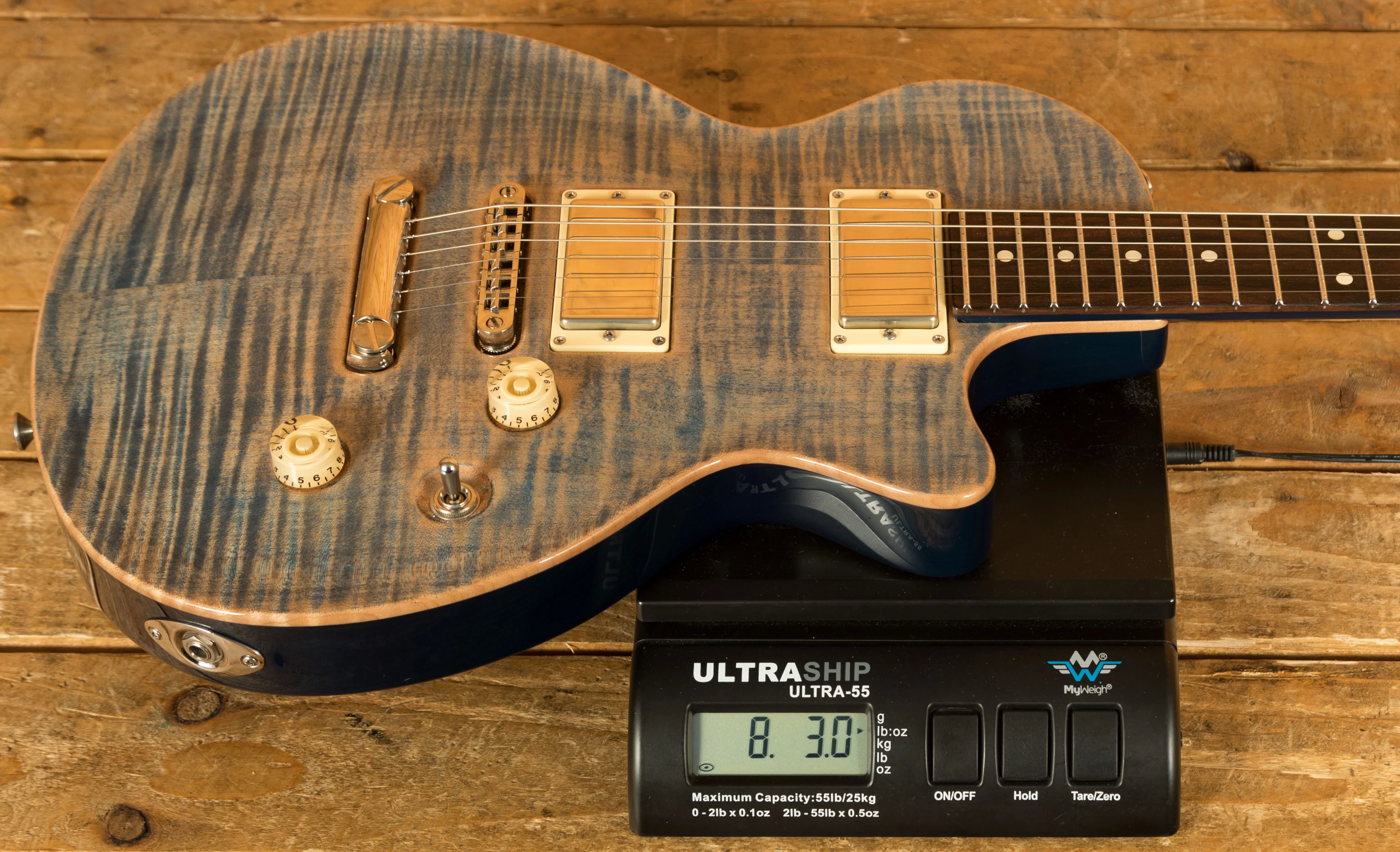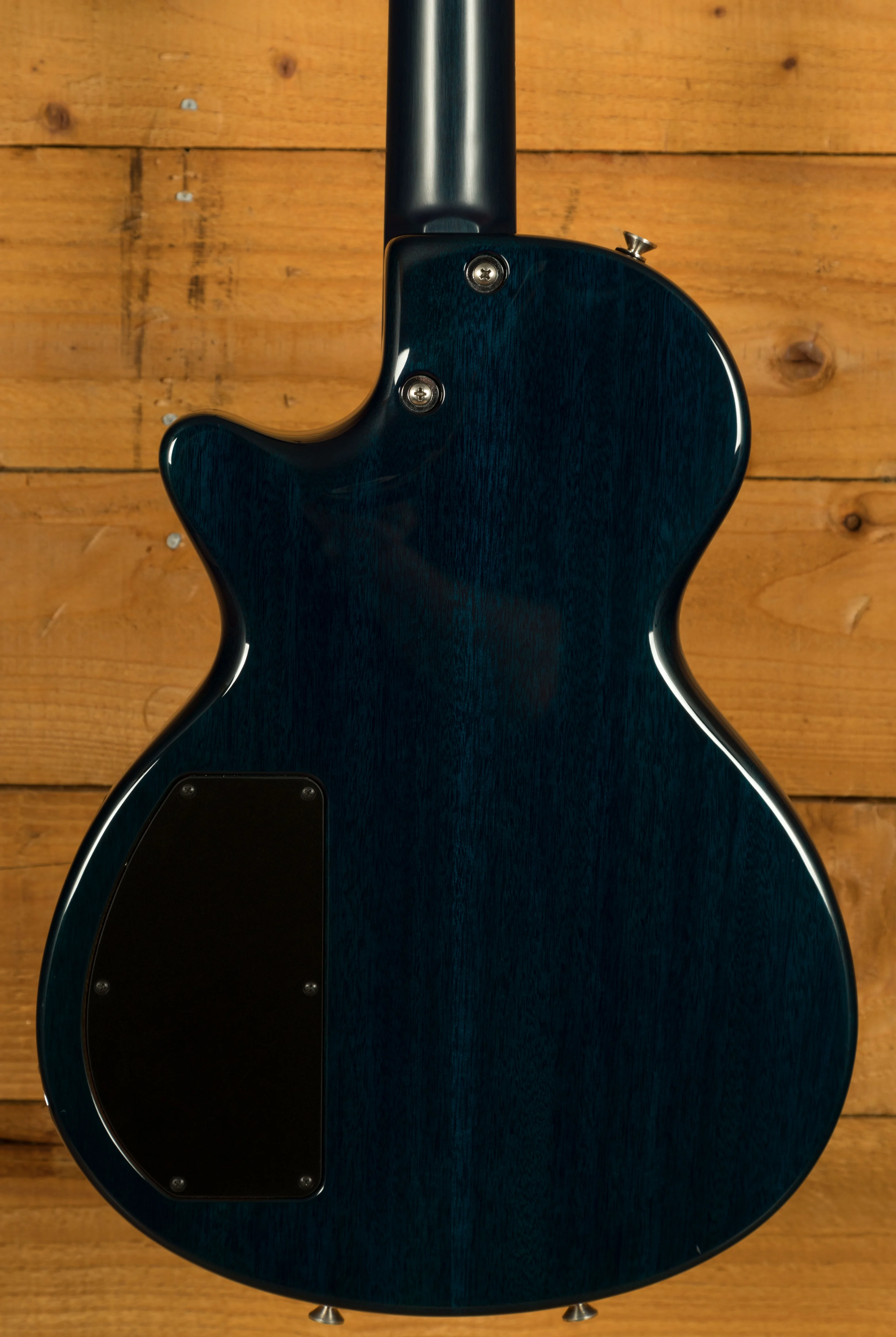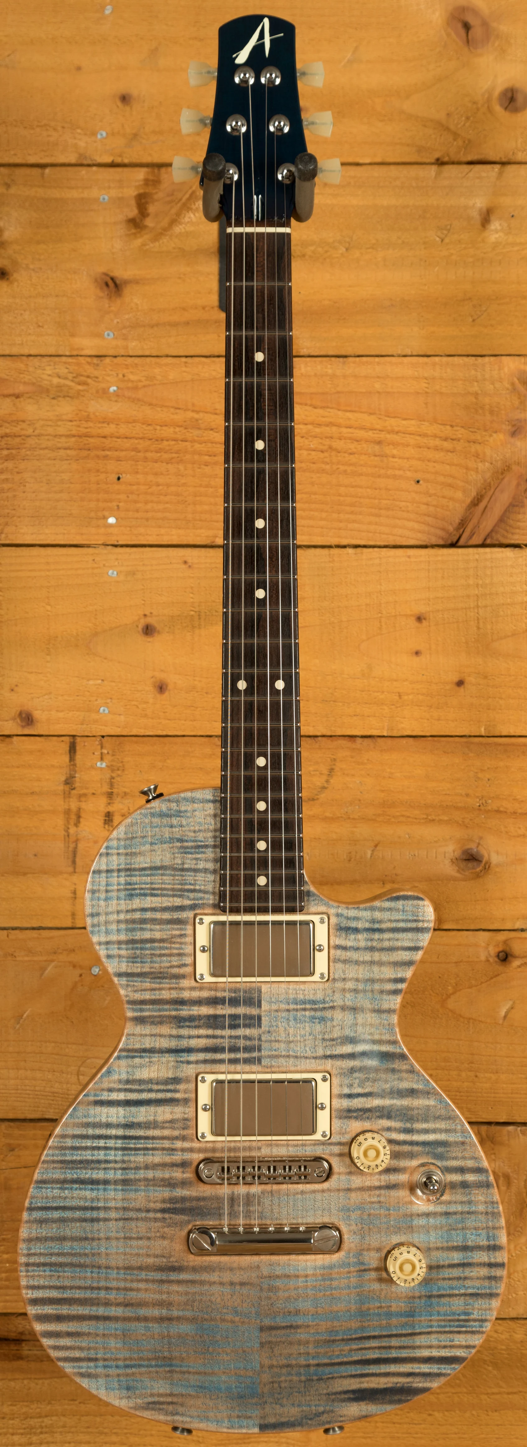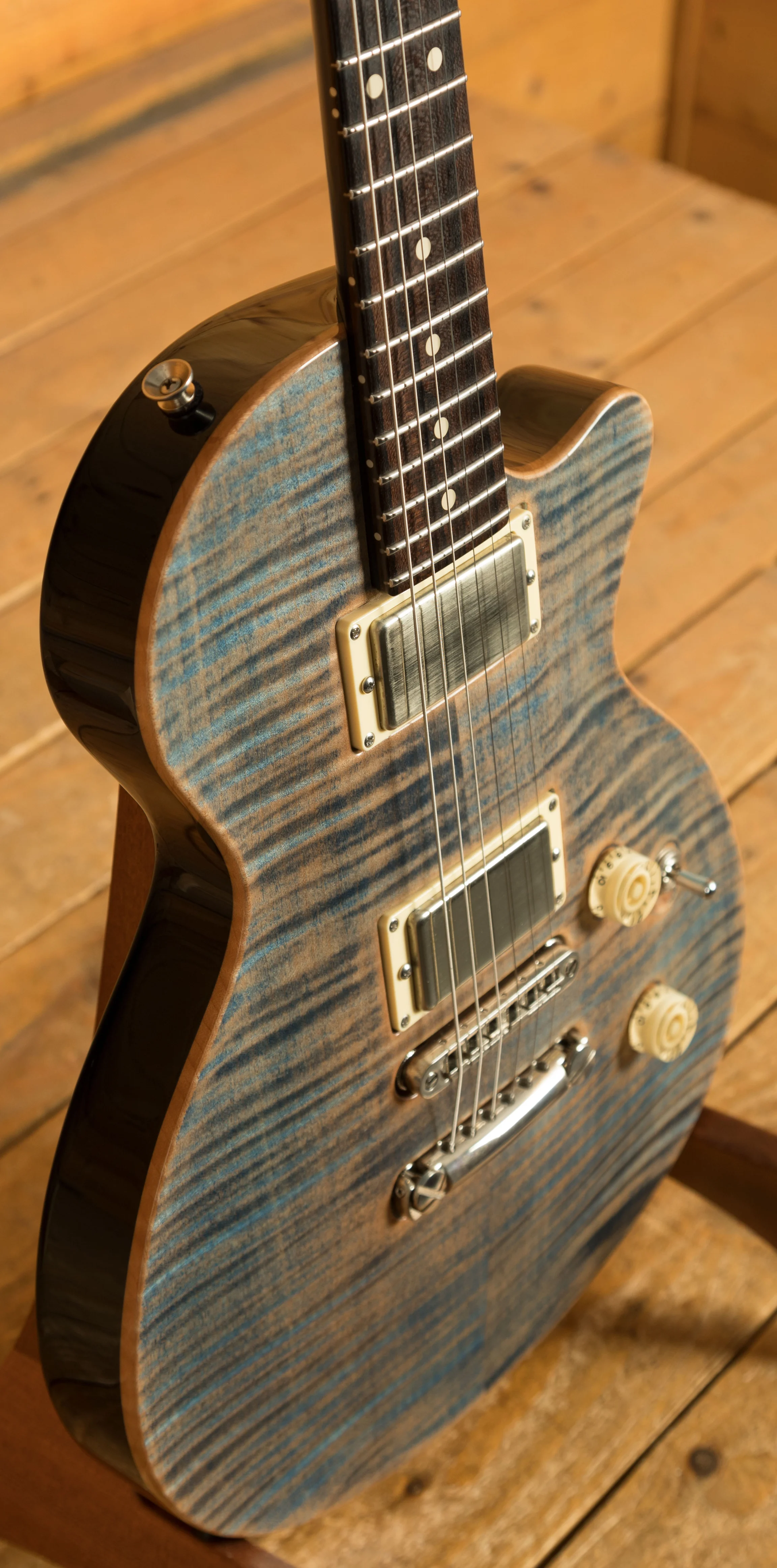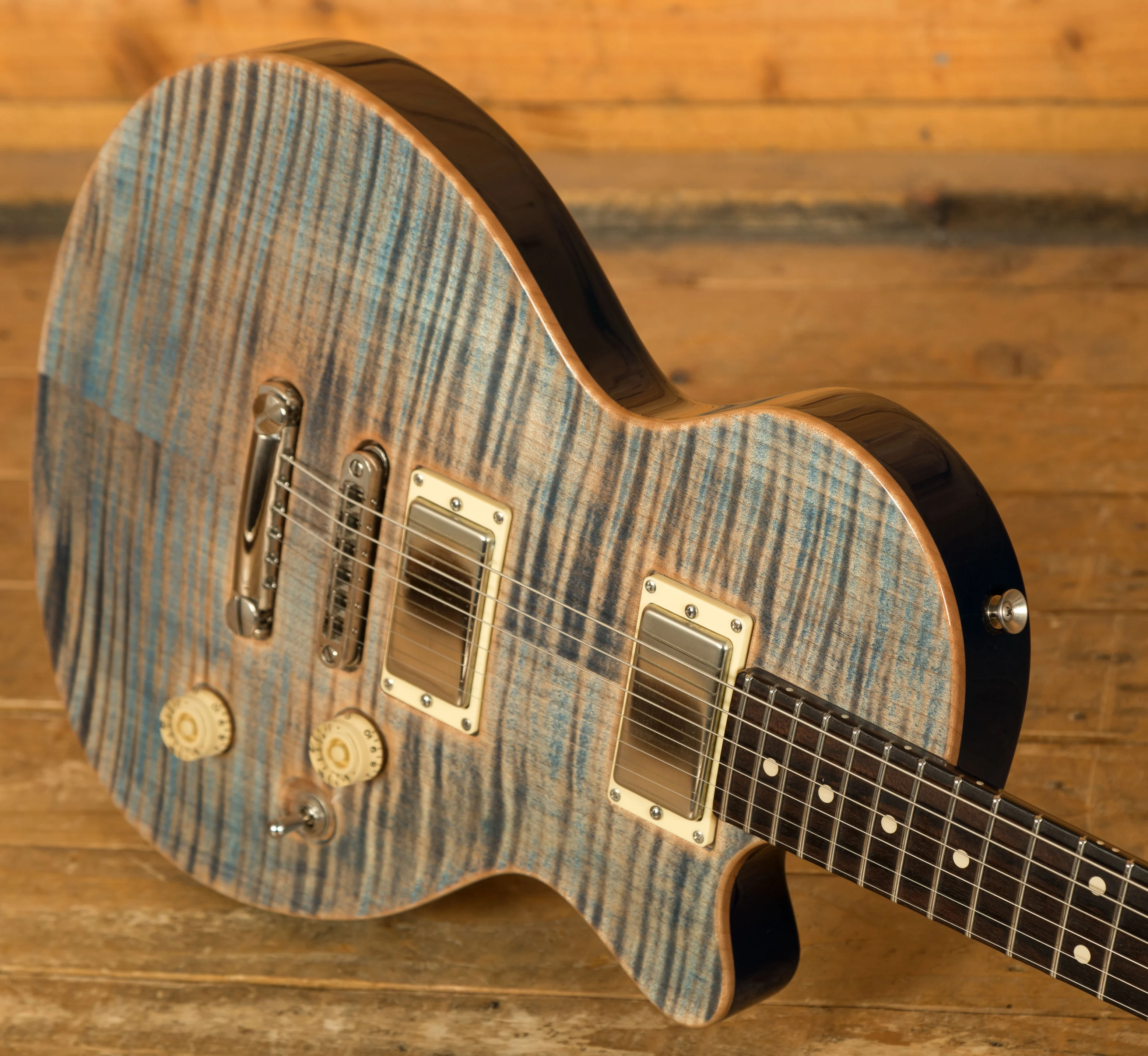 Body & Neck: Carved flame maple top on a mahogany body in Natural Jack's Blue finish with binding, paired with a mahogany neck featuring a Happy Medium profile and a ziricote fingerboard with no inlays, offering a 24 3/4-inch scale length and jumbo stainless steel frets for versatile playability.