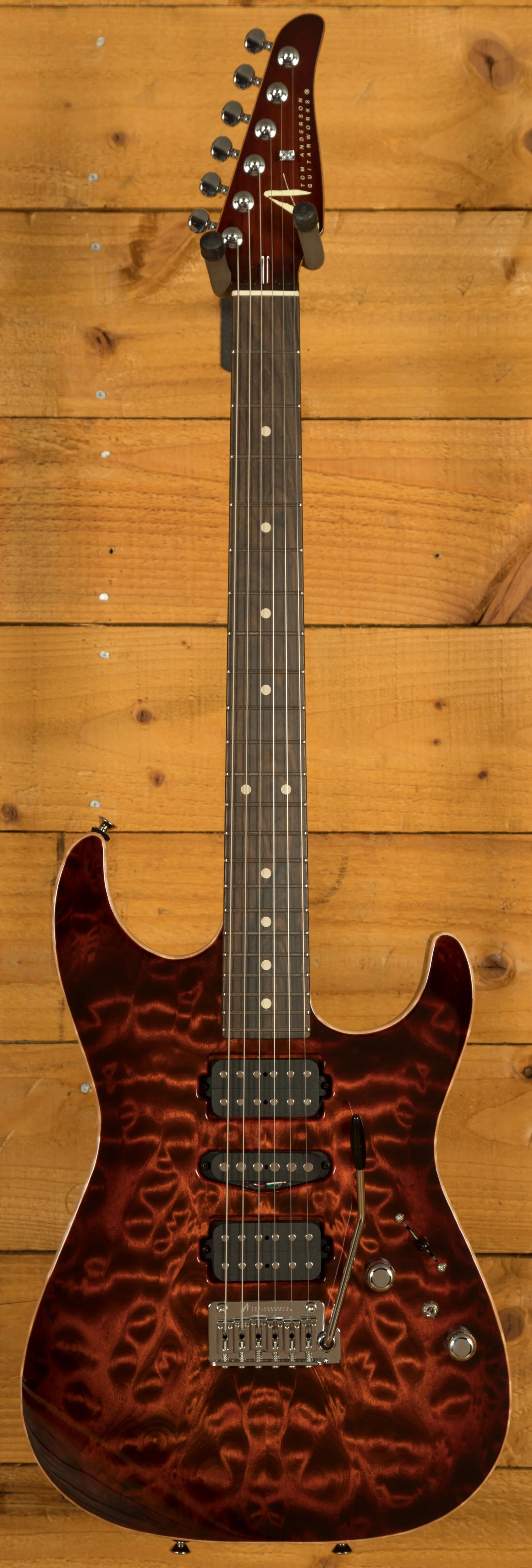 Tom Anderson guitars are renowned for their playability, and the Drop Top is no exception. The caramel maple neck with a Ziricote fingerboard features a 12 to 14-inch conical radius, providing a comfortable playing surface that facilitates effortless string bending. The Even-Taper +.030 neck back shape ensures a consistent feel from the nut to the 12th fret, offering a sleek and fast playing experience. Stainless steel jumbo frets further enhance playability, providing silky smooth string bends and liquid smooth vibrato.
