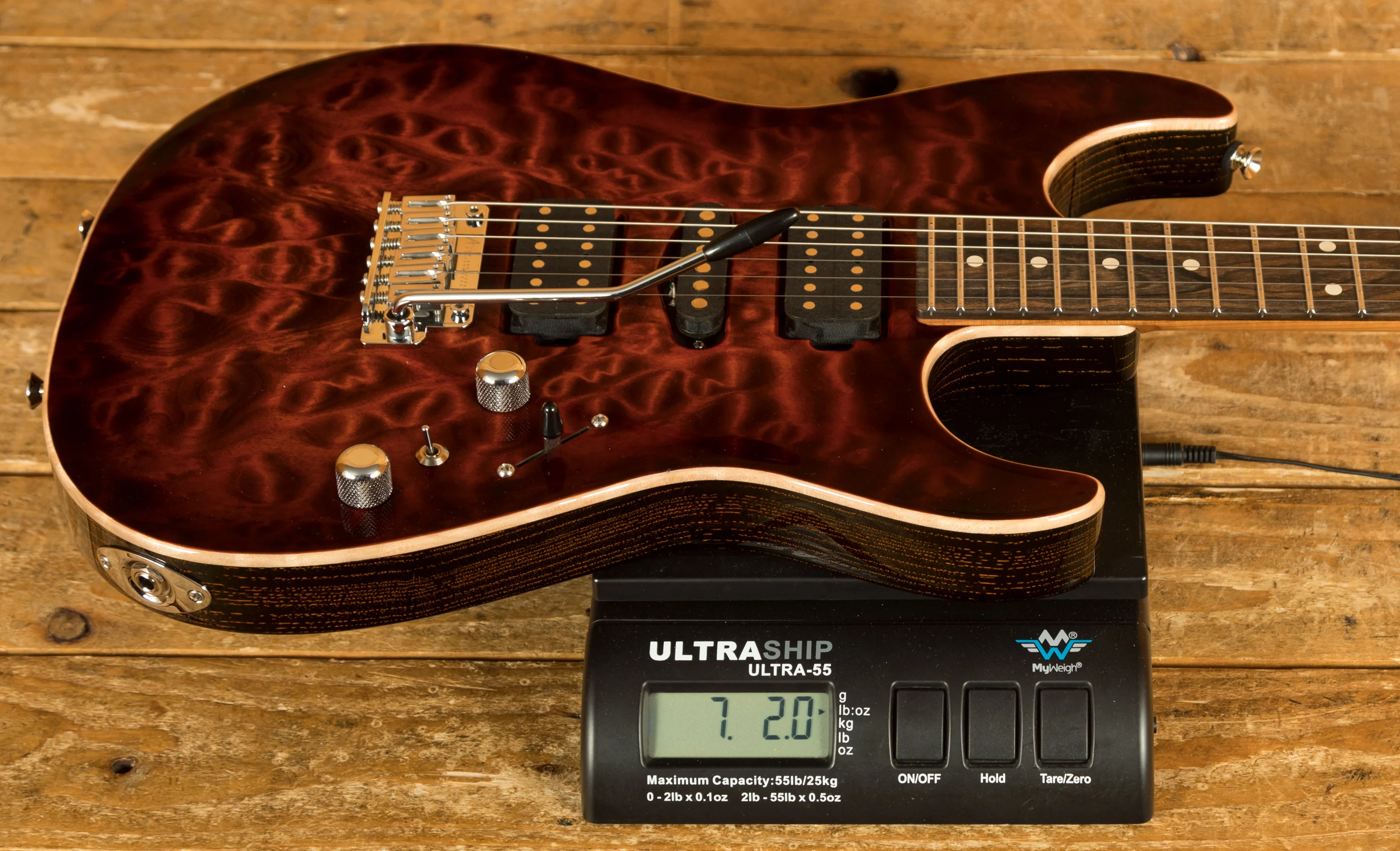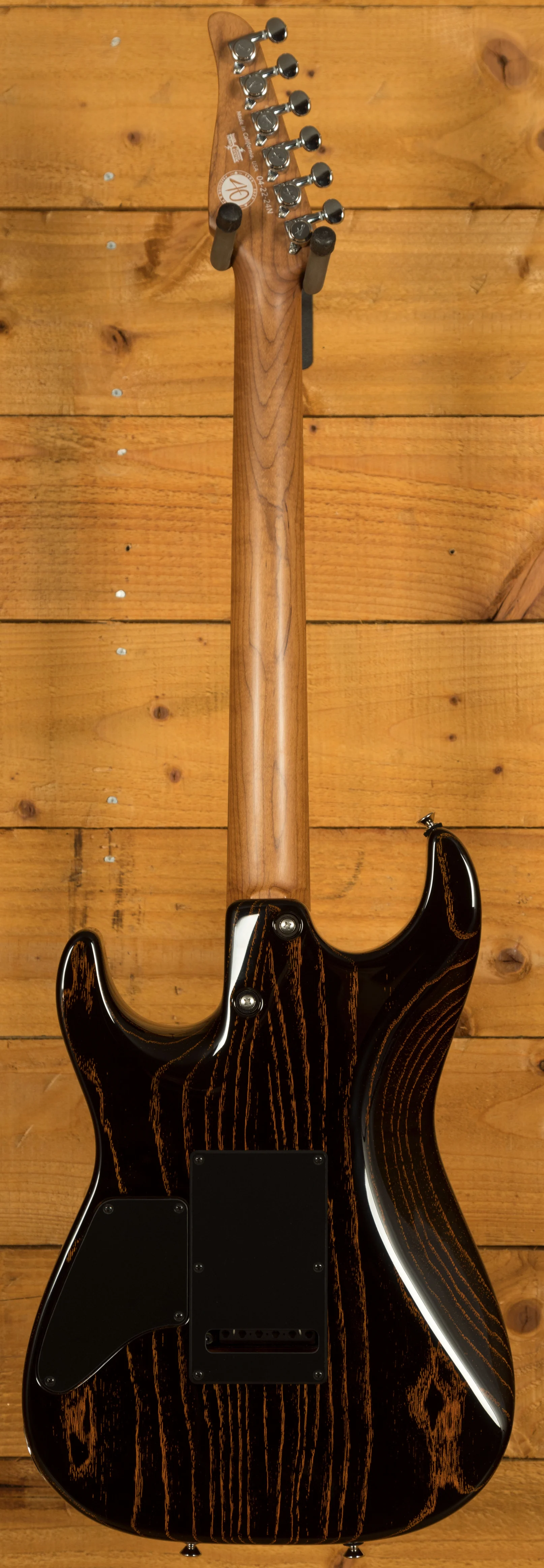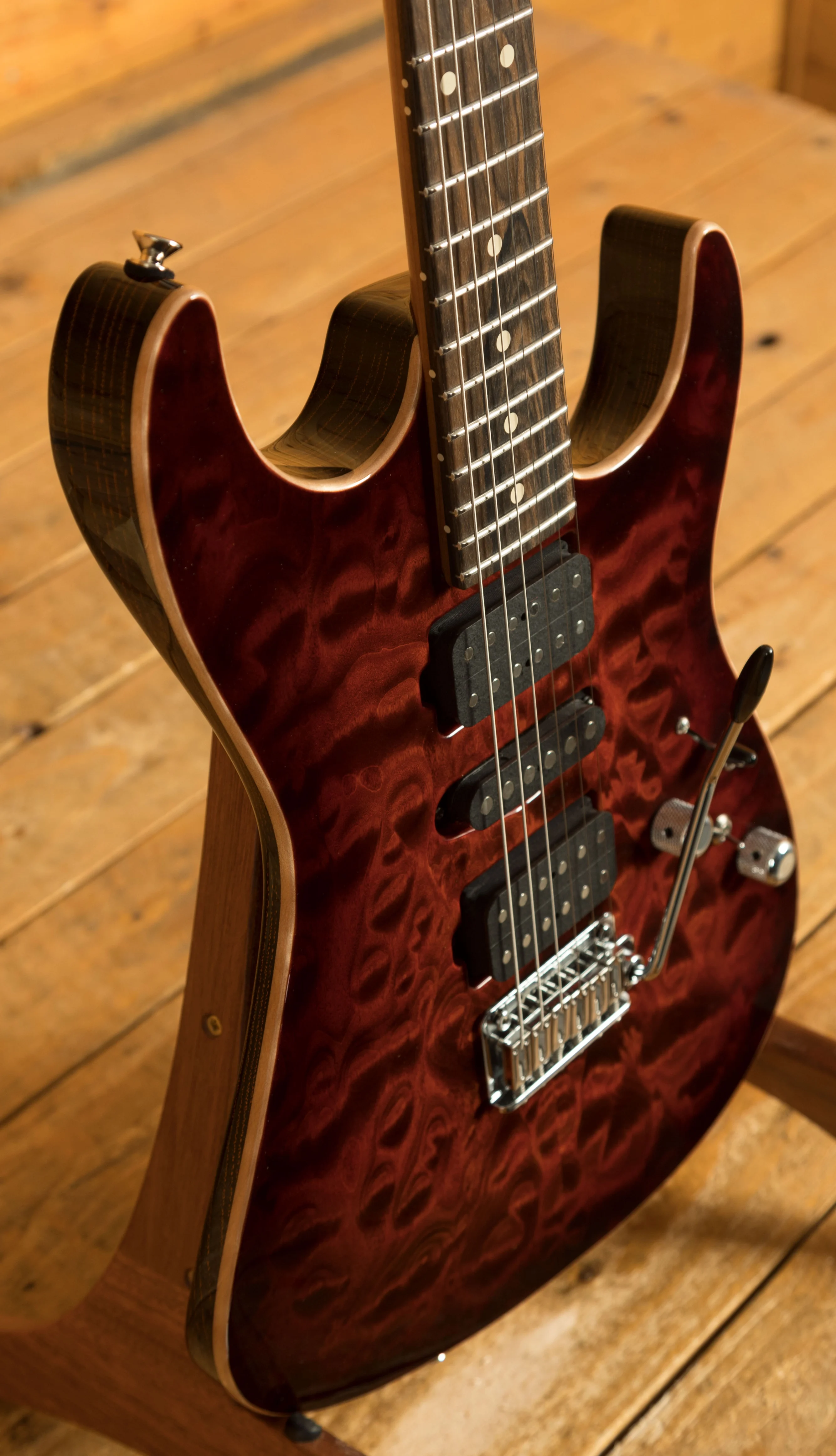 Introduced in 1990, the Drop Top redefined the S-style guitar by incorporating a maple top that dropped to create a comfortable forearm contour. This innovative design choice, featuring a body top thickness of 3/16 of an inch, not only enhances the guitar's aesthetic appeal but also enriches its sonic character. The result is an instrument that is as visually striking as it is musically versatile.