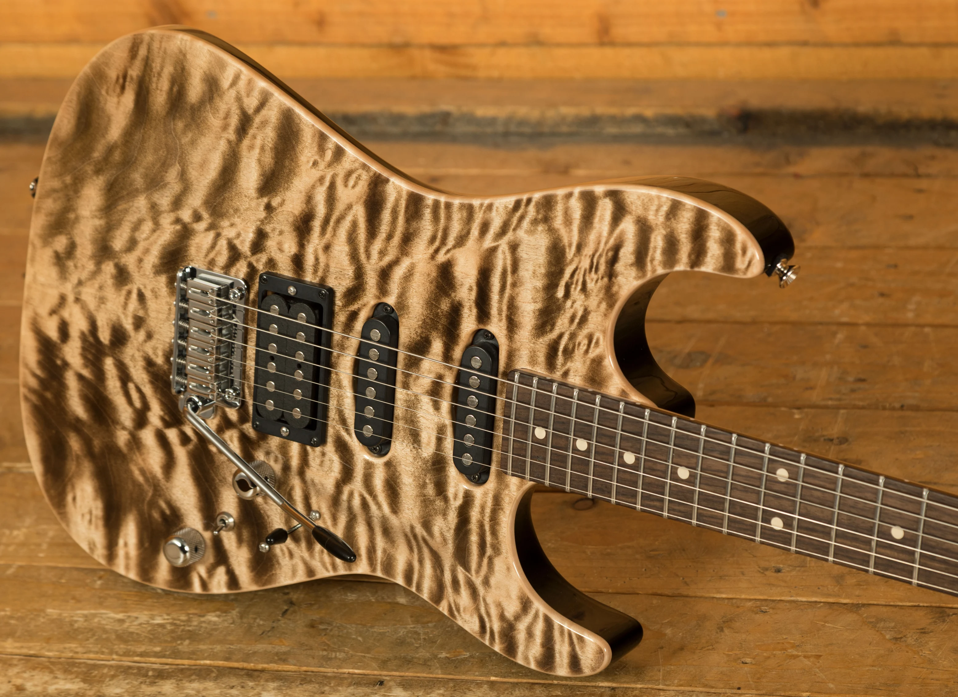 The Natural Satin Maple neck has an Even-Taper +.030 profile with 1 11/16" nut width and 25.5" scale length, for a slick but stable neck grip. The 12"-14" compound radius Rosewood fingerboard adorned with jumbo stainless steel frets provides a brilliant playing surface, perfect for every style.
