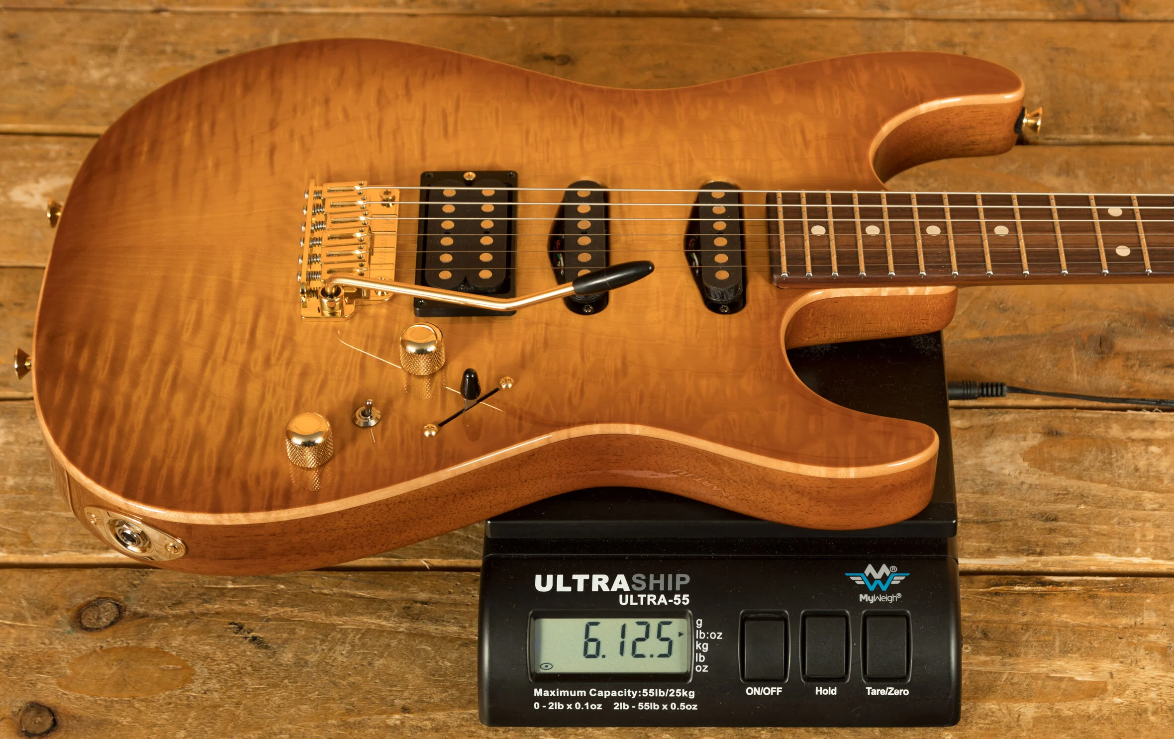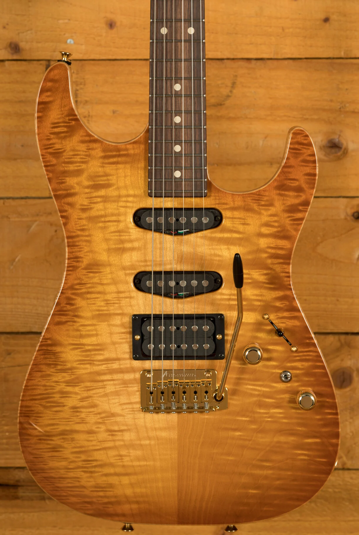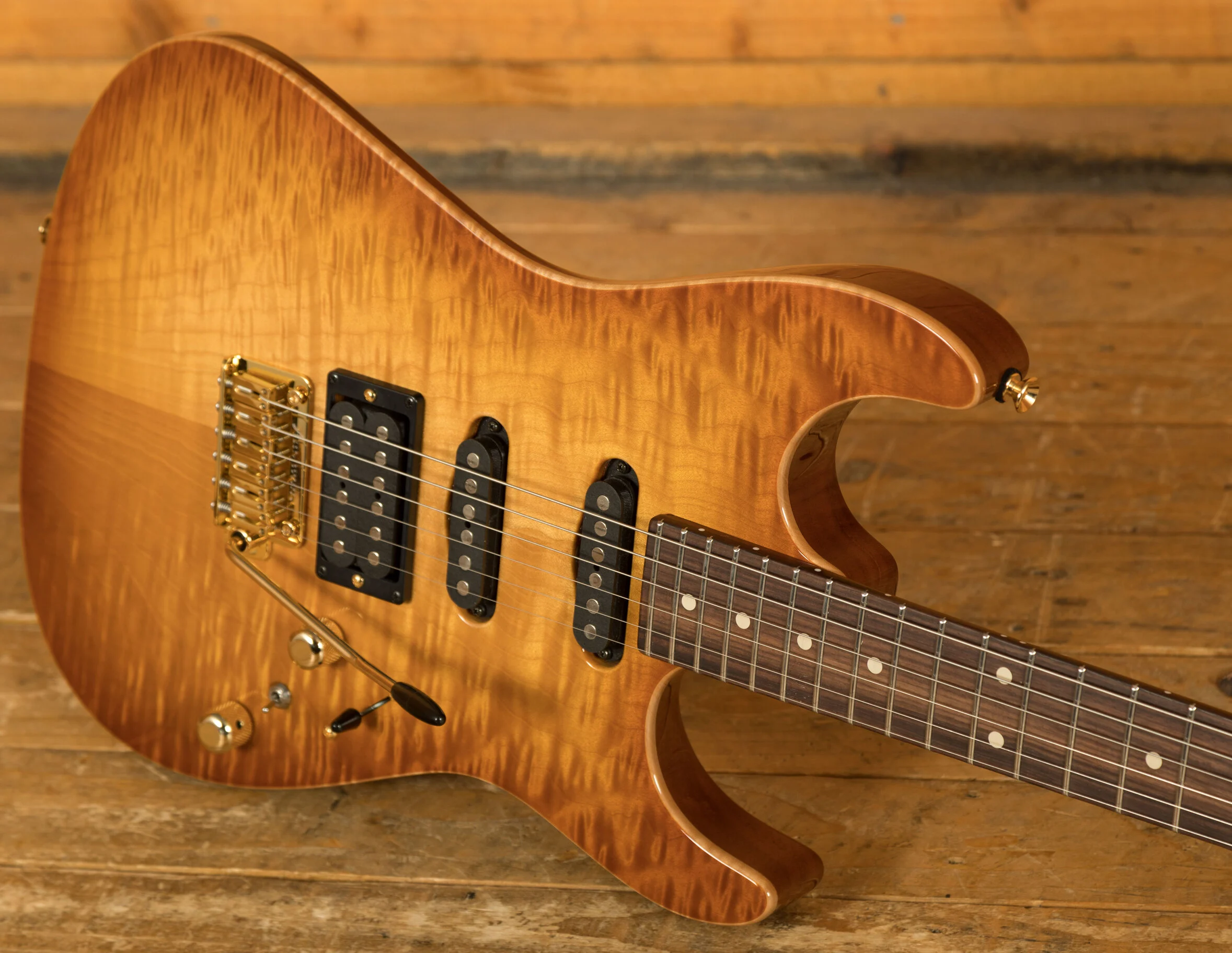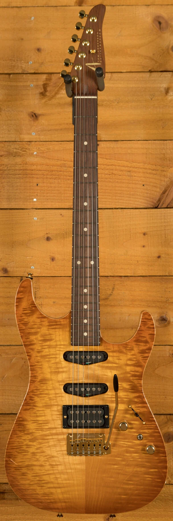 The Anderson Drop Top features a traditional 25 1/2-inch scale length, a standard in the industry known for its balanced feel and versatility. Finished in the stunning Honey Shaded Edge with Binding, the Spanish cedar body with quilt maple top boasts a captivating appearance, enhanced by a matching body back and satin natural headstock.