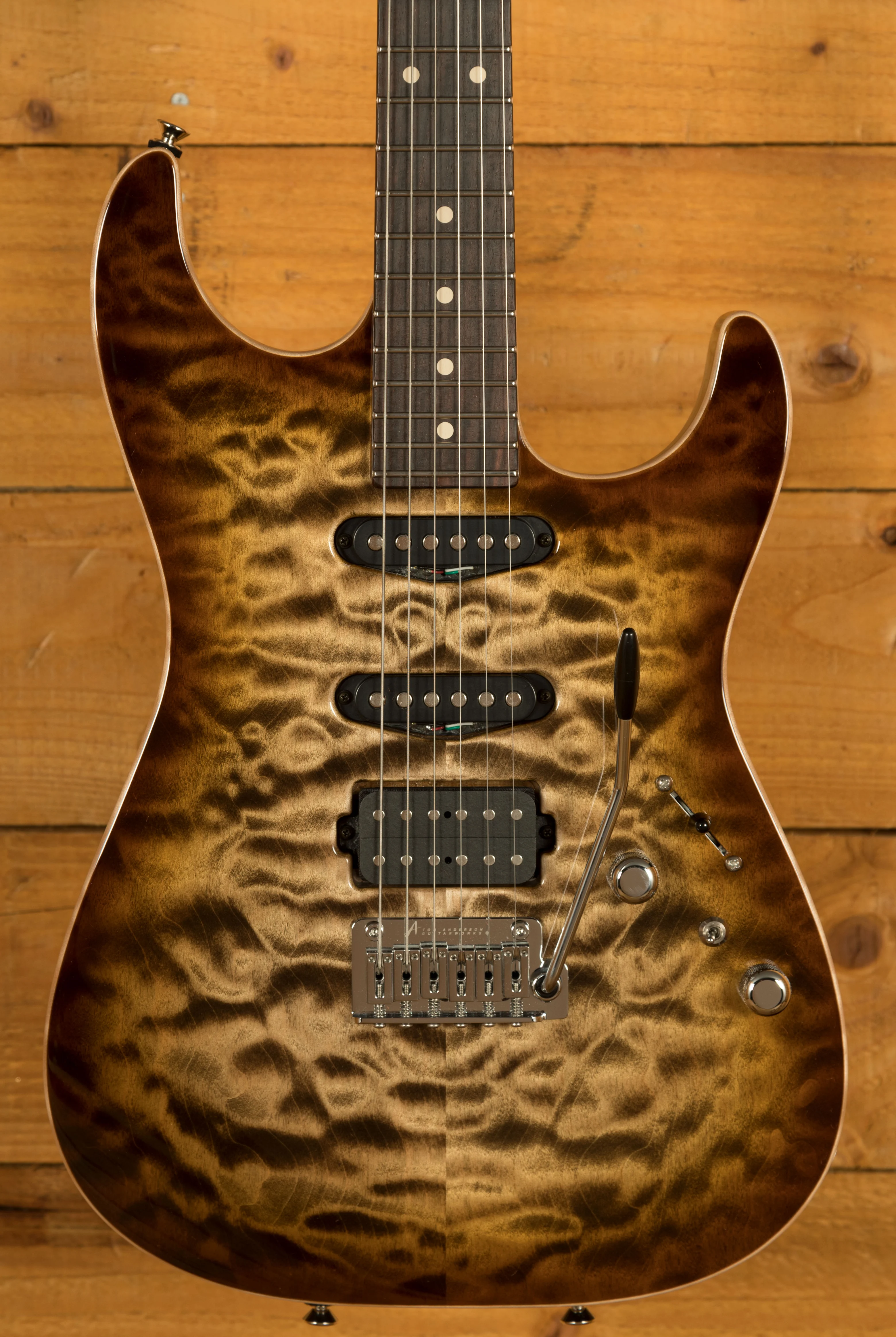 The neck is crafted from caramel maple and paired with a rosewood fingerboard. Anderson's choice of a fingerboard radius ranging from 12 to 14 inches ensures optimal playability, facilitating effortless string bending and smooth fretting across the entire range of the guitar.