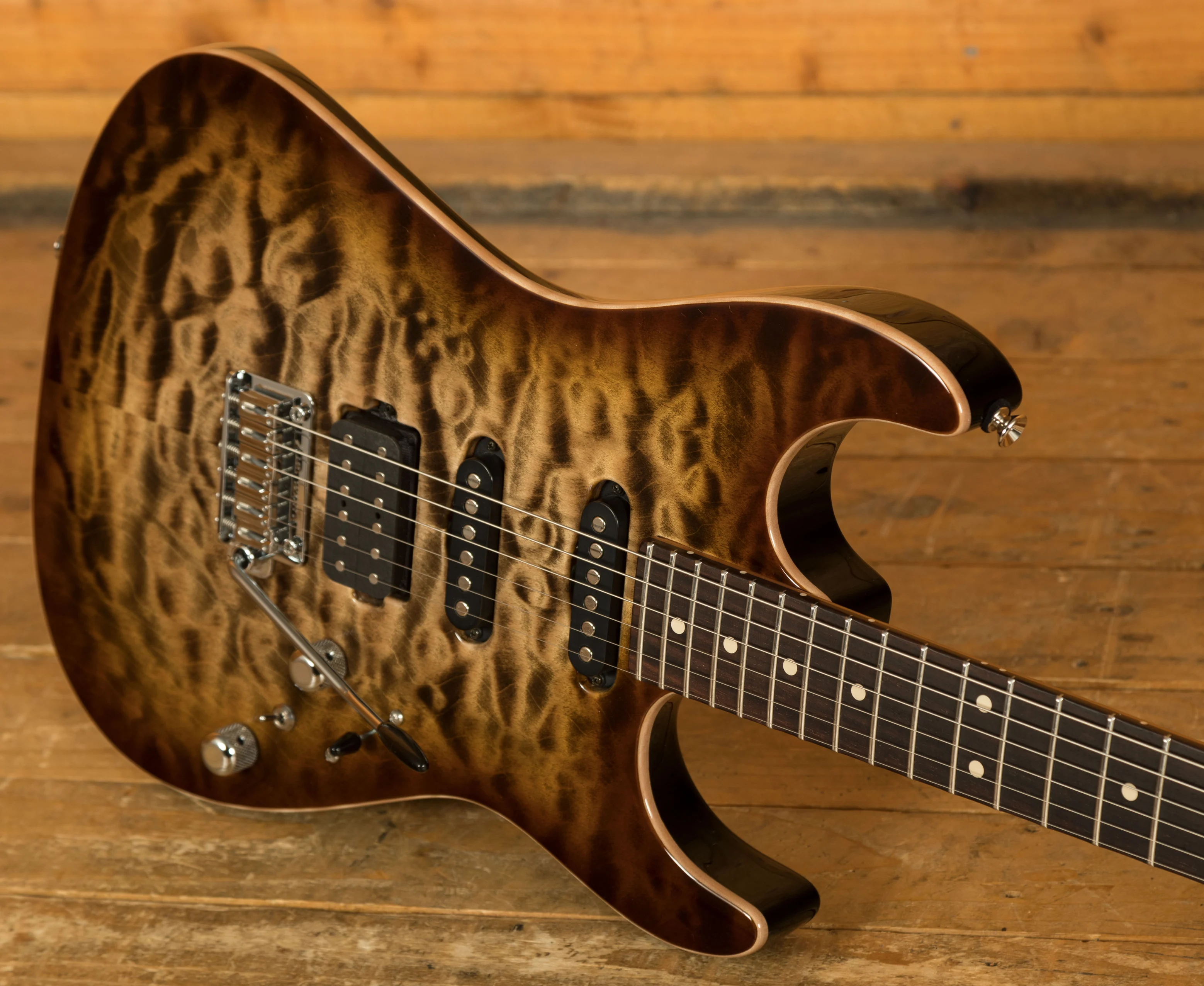 The Anderson Drop Top guitar is instantly recognisable, thanks to its striking exotic wood top. The "drop" in Drop Top refers to the innovative technique where the maple top is bent to create a comfortable forearm contour. This not only enhances the guitar's ergonomic feel but also adds to its aesthetic allure with sweeping body lines that catch the eye.