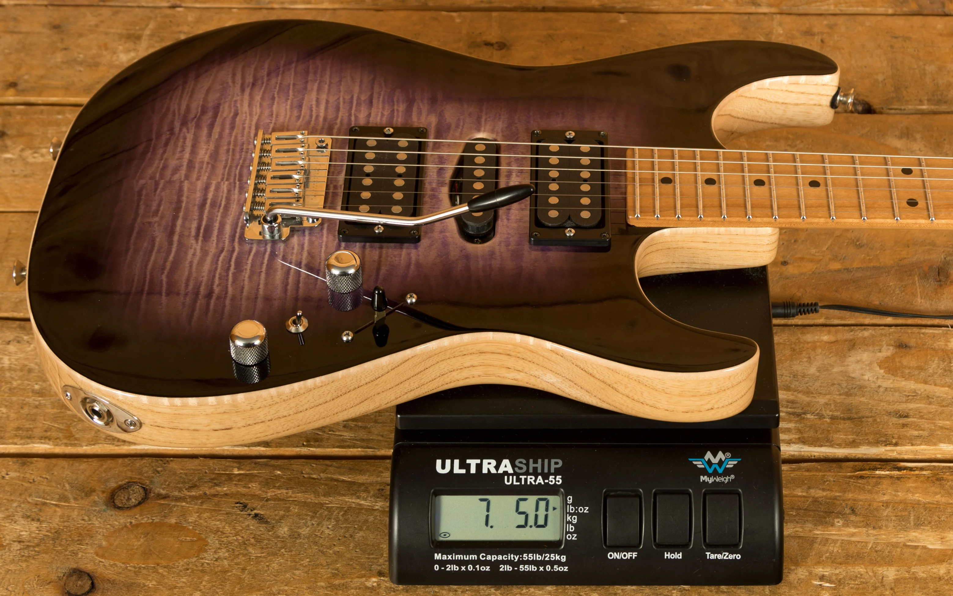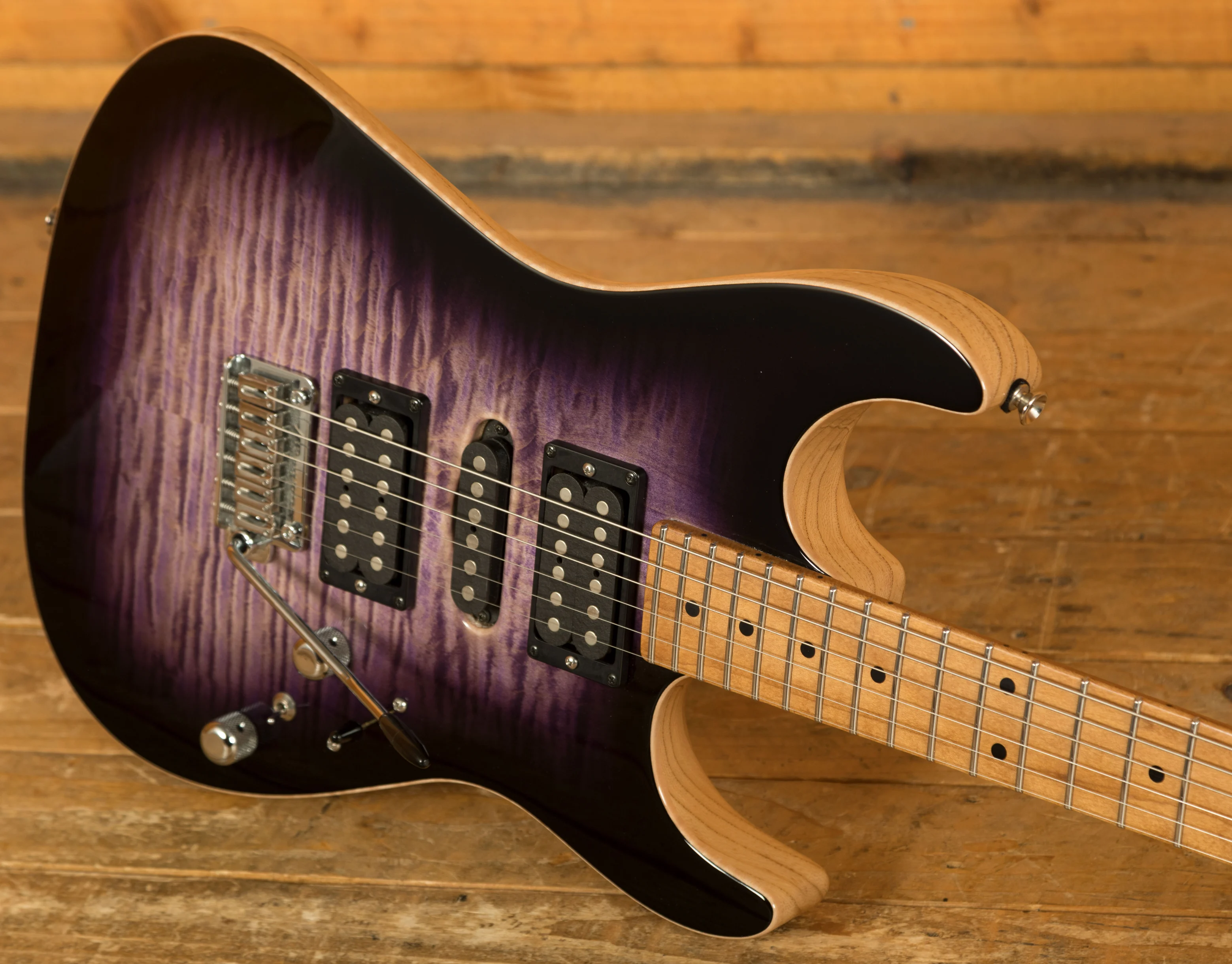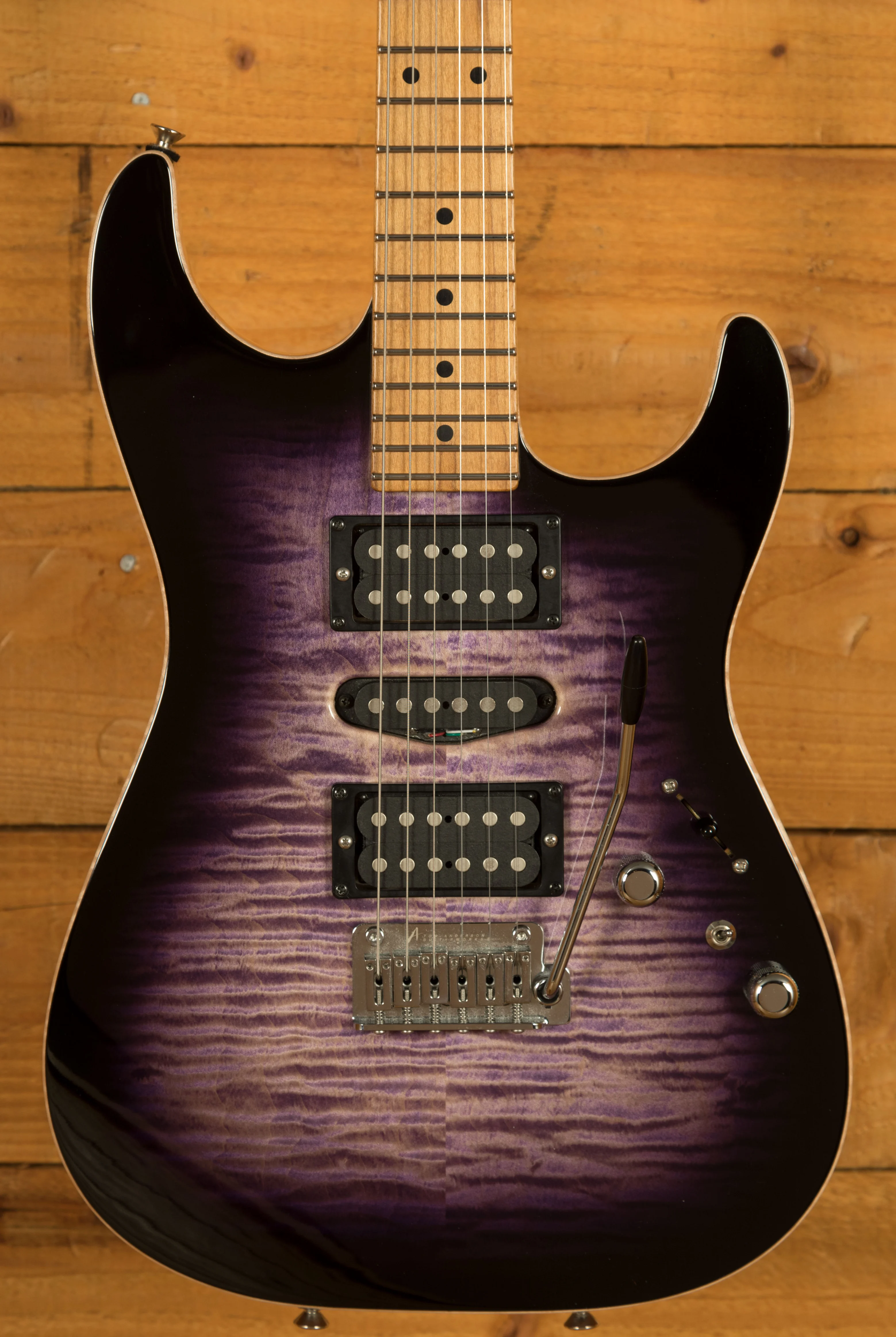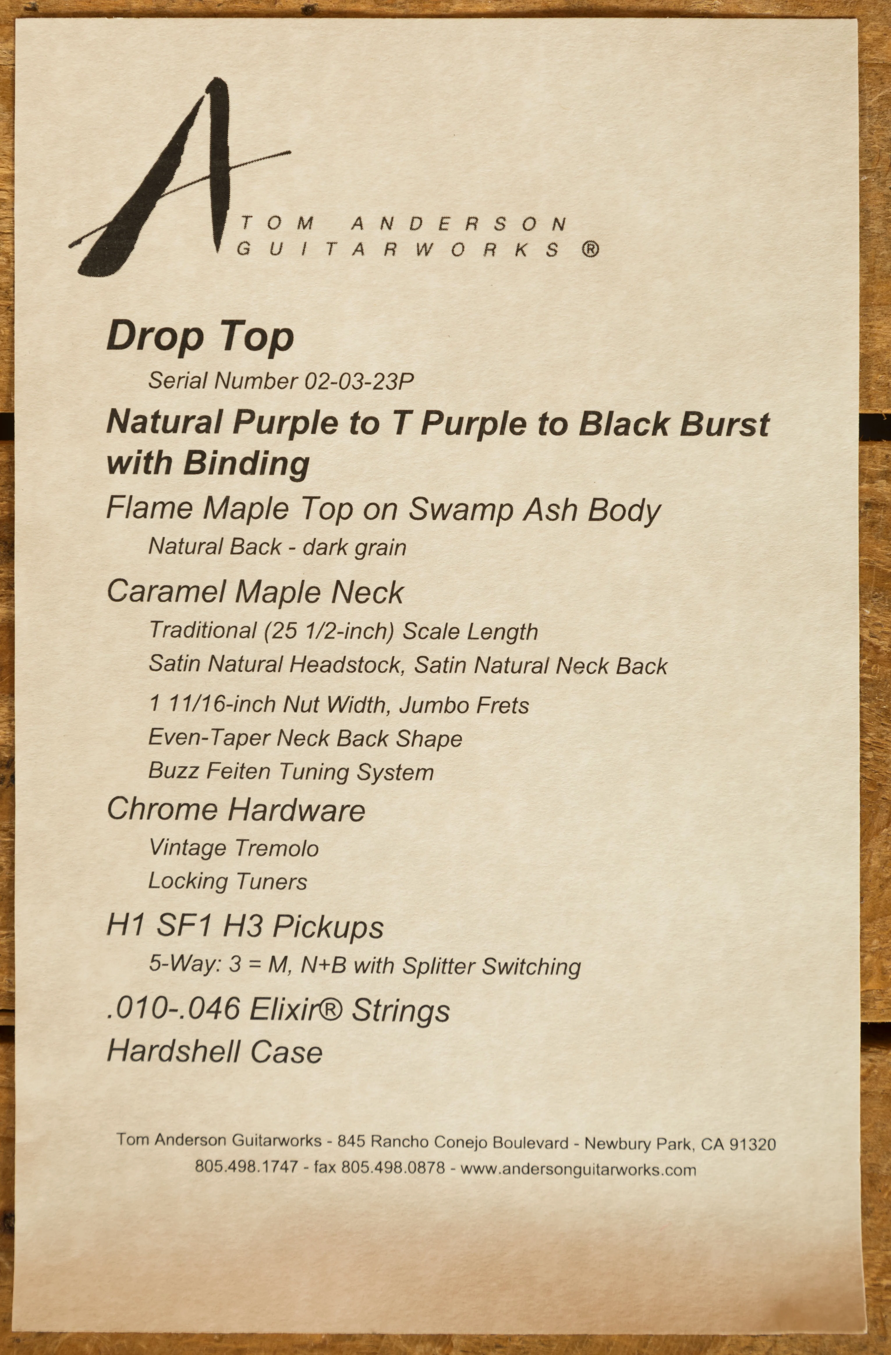 The Anderson Drop Top features a traditional 25 1/2-inch scale length, a standard in the industry known for its balanced feel and versatility. Finished in the stunning Natural Purple to T Purple to Black Burst Gloss with Binding, the guitar boasts a captivating appearance.