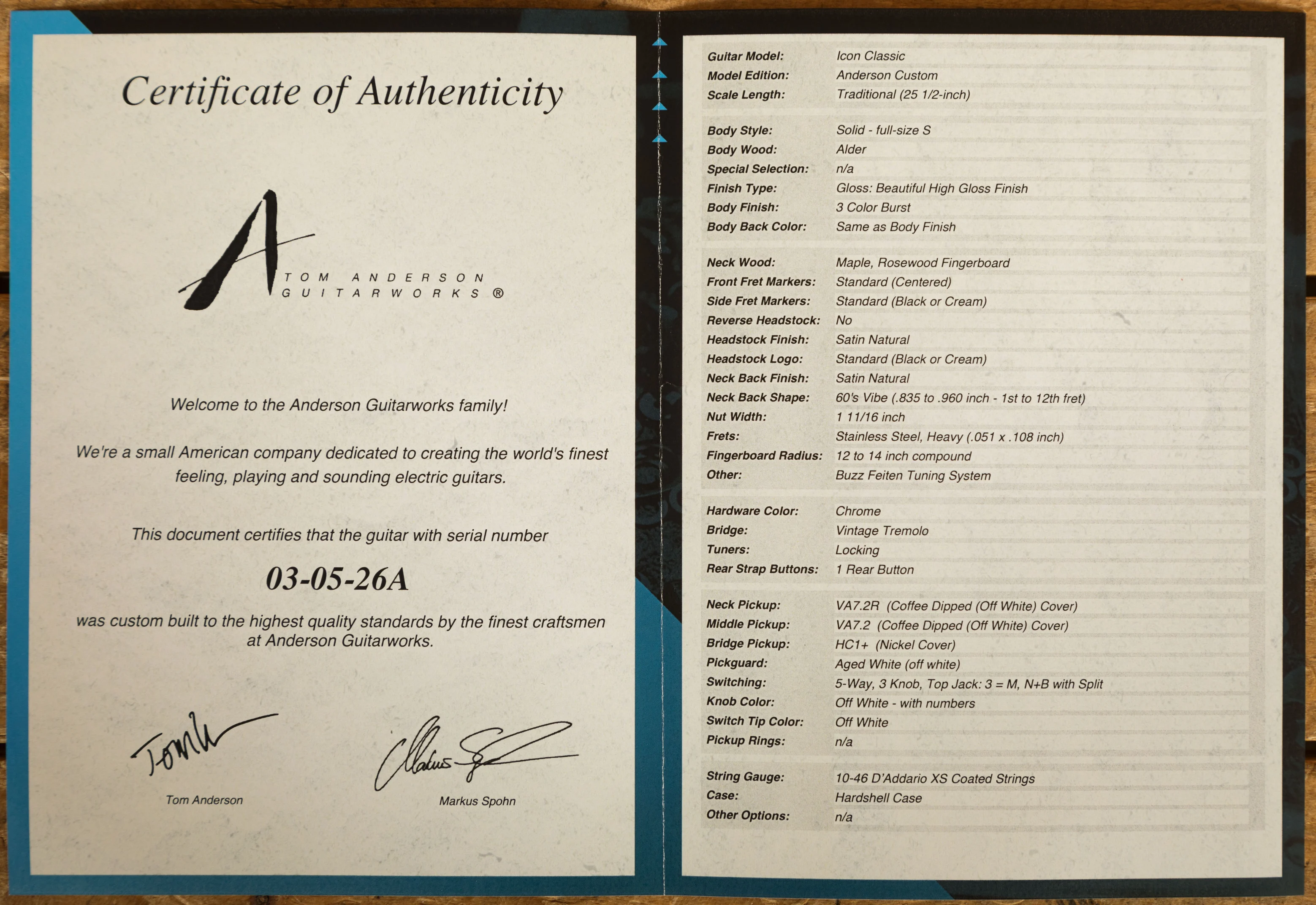 Equipped with stainless steel heavy frets, the Icon Classic offers players an astronomically improved playing experience. These frets, polished to perfection, provide silky smooth string bends and liquid-smooth vibrato, elevating the player's technique and touch. The stainless steel frets, extensively used on over 15,000 Anderson guitars, are known for their durability and exceptional playability without compromising tonal quality.