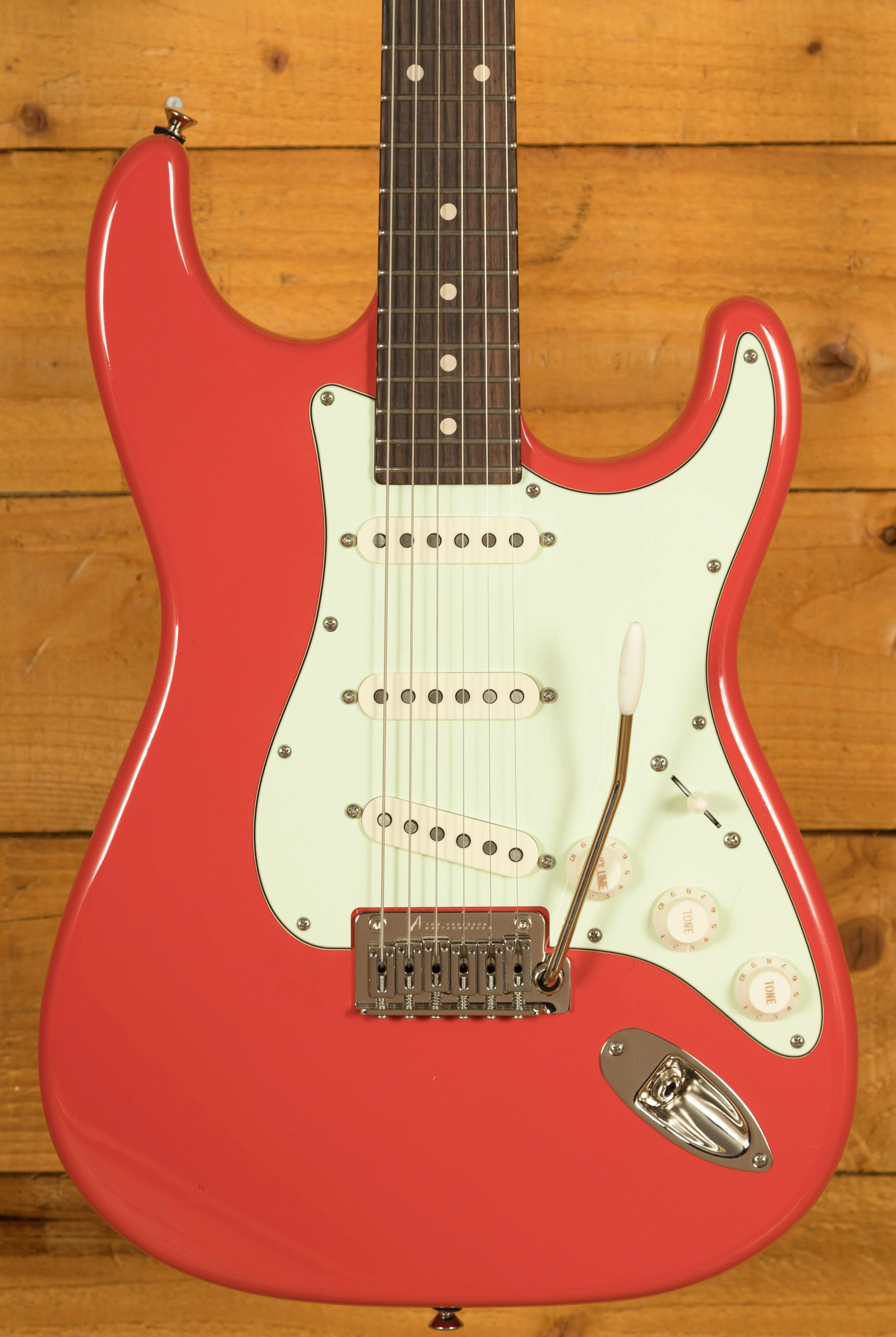 With a resonant Alder body the Icon Classic is super punchy in tone perfect for cutting through in a live situation. Finished in a Fiesta Red nitro lacquer this Icon Classic just oozes cool. This guitar has been spec'd with Tom Anderson's level 1 distressing, which creates the appearance of a well-maintained Rock 'n' Roll relic, it features a few slight dings and some very light lacquer checking. Classy and understated, Tom Anderson guitars always look a cut above.