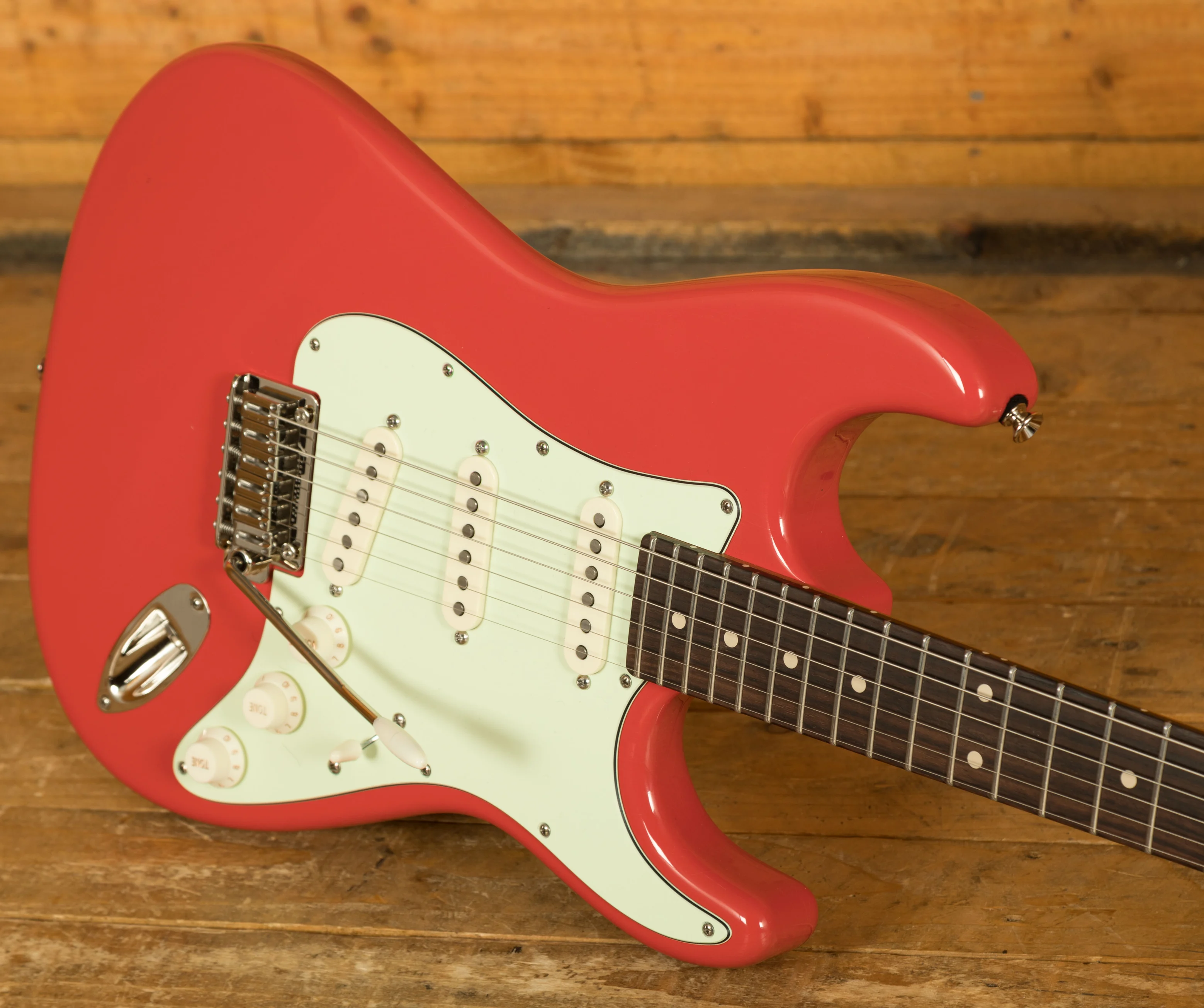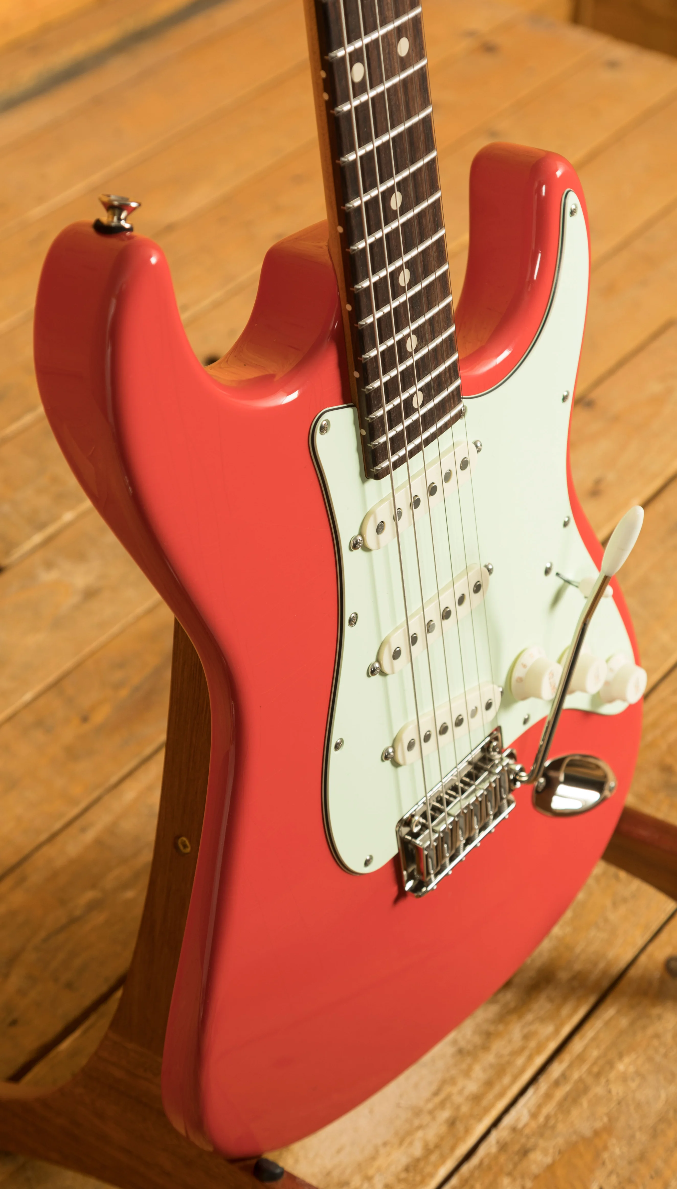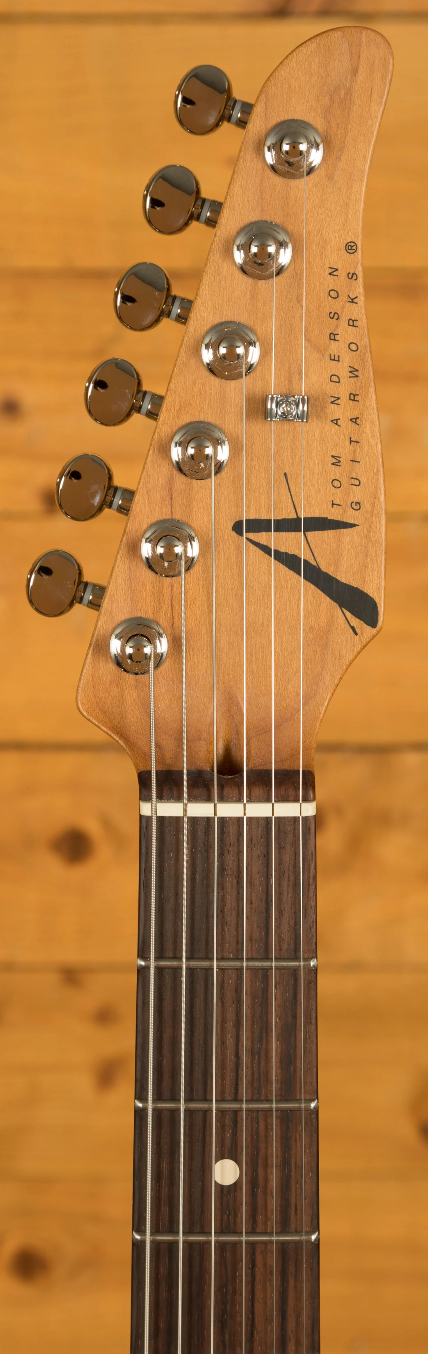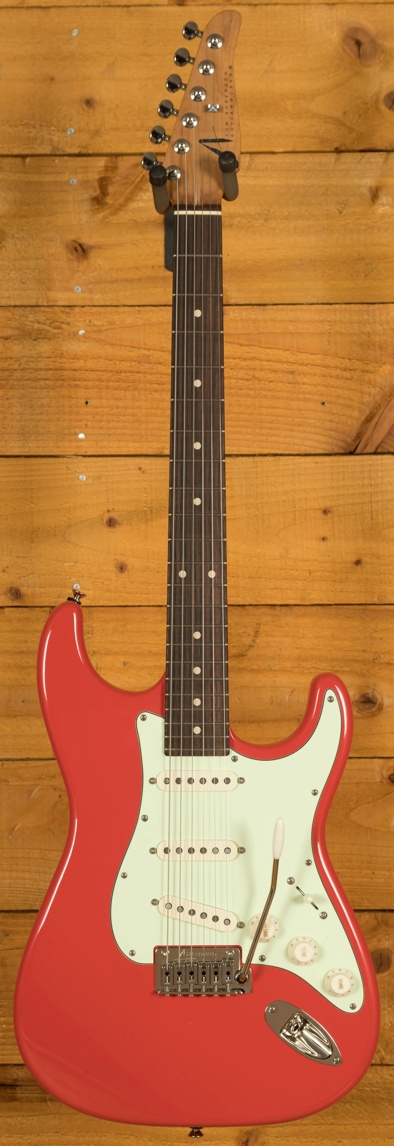 Rocking Tom Anderson VA7.2R, VA7.2 and VA7.2+ pickups, you have tonnes of tonal options here, it has a really full bodied and fat, lush tone. With locking tuners and a vintage tremolo bridge, you get incredible tuning stability and intonation.