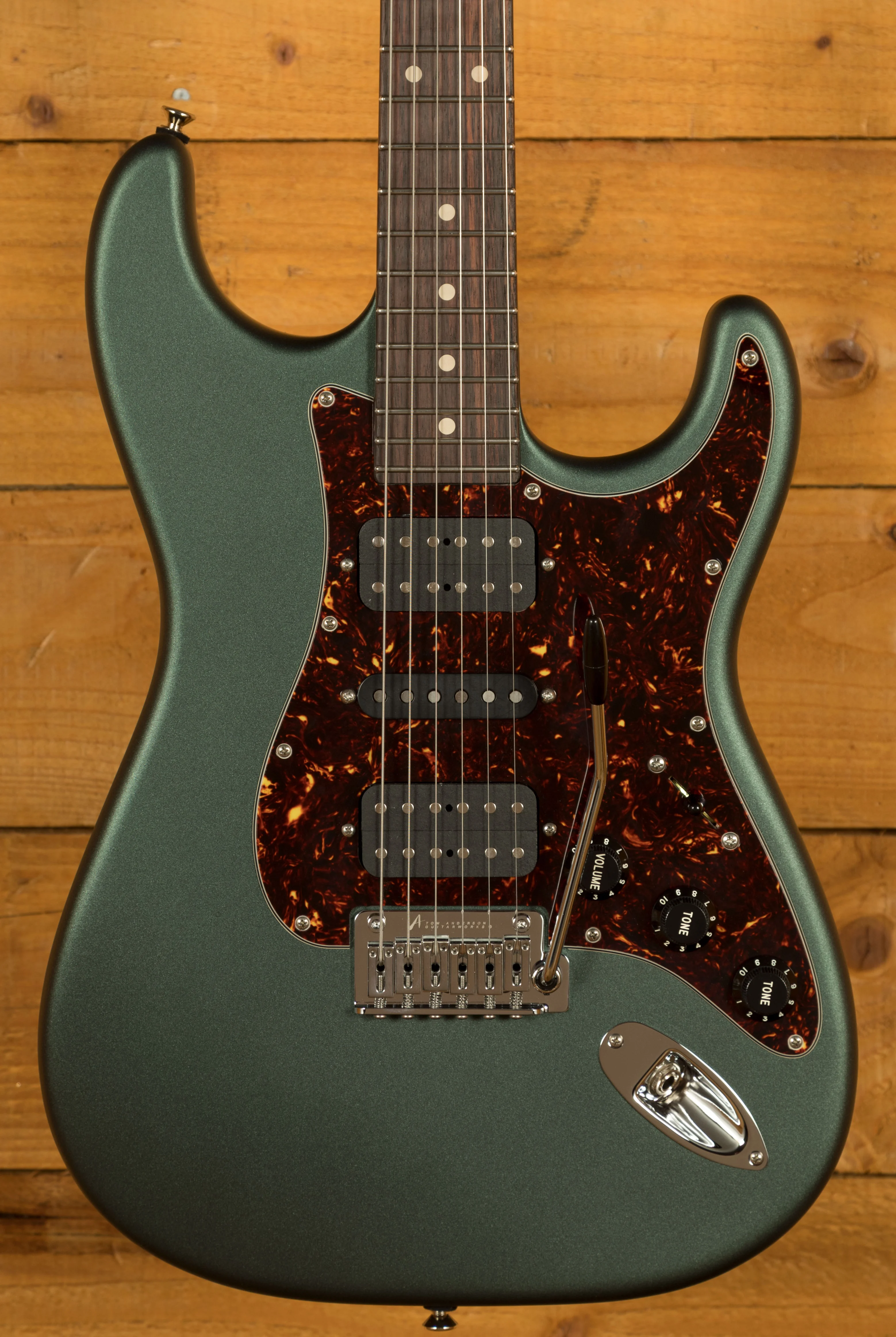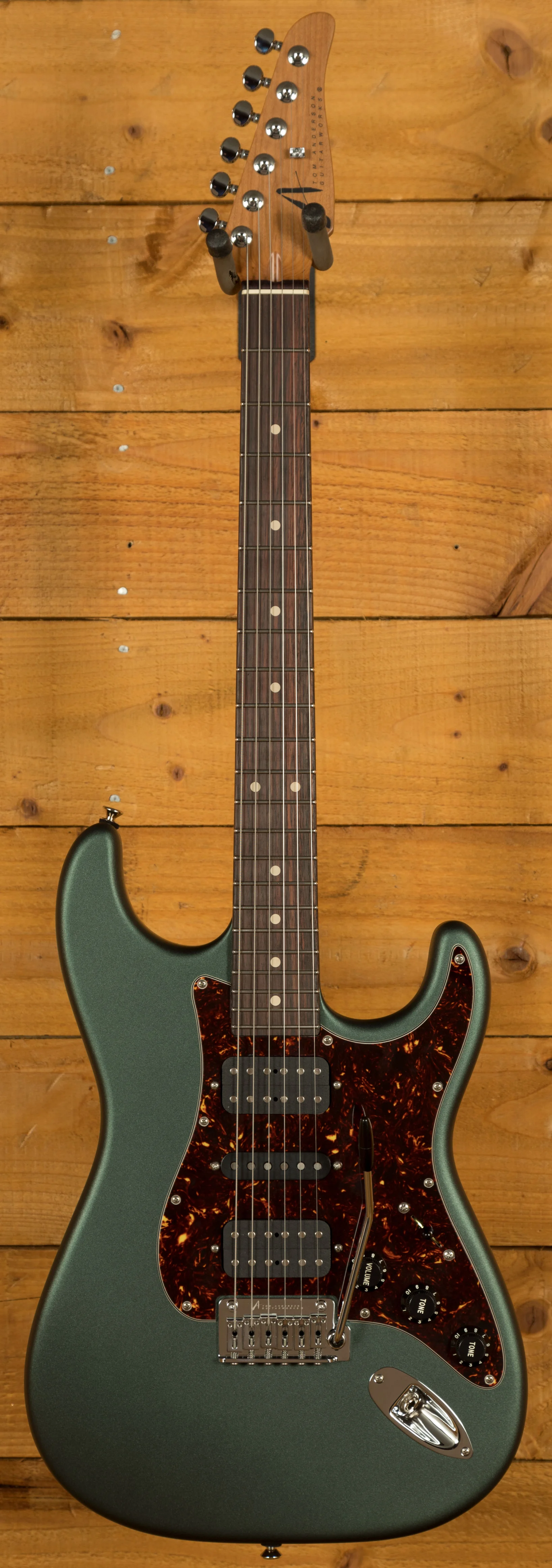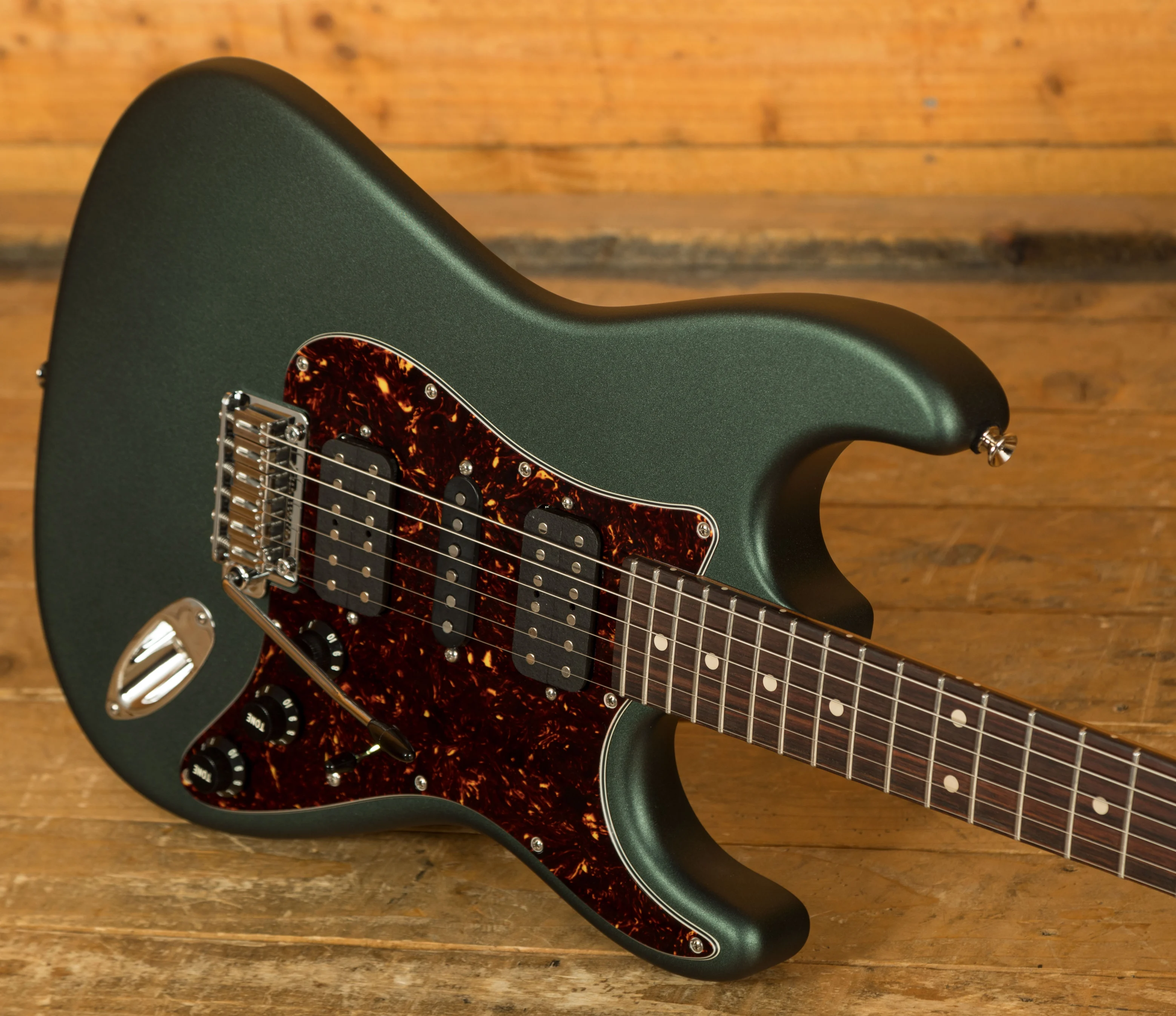 The hardware, chrome-plated with a vintage tremolo and modern locking tuners, combines classic aesthetics with contemporary functionality. The pickups include a VA 7.2 in the middle position, renowned for its vintage warmth with a slightly hotter output, and HFs in the humbucker positions, delivering a balanced tonal palette with focused midrange and musical upper-mids.